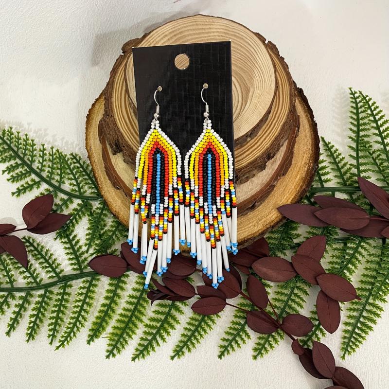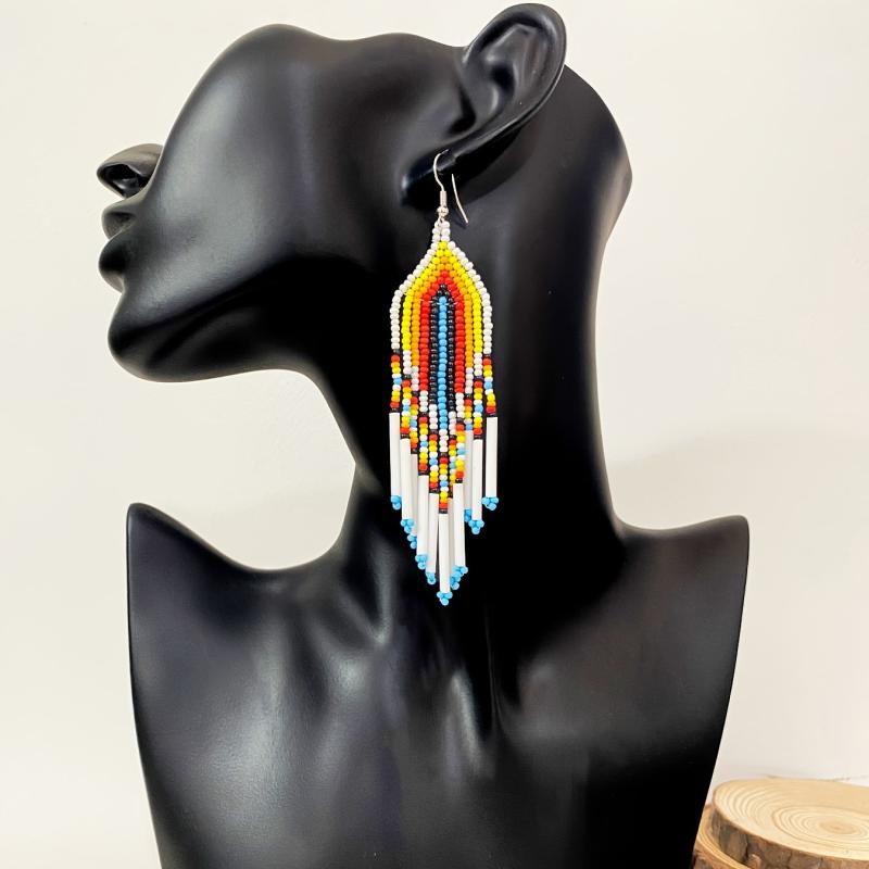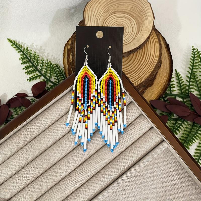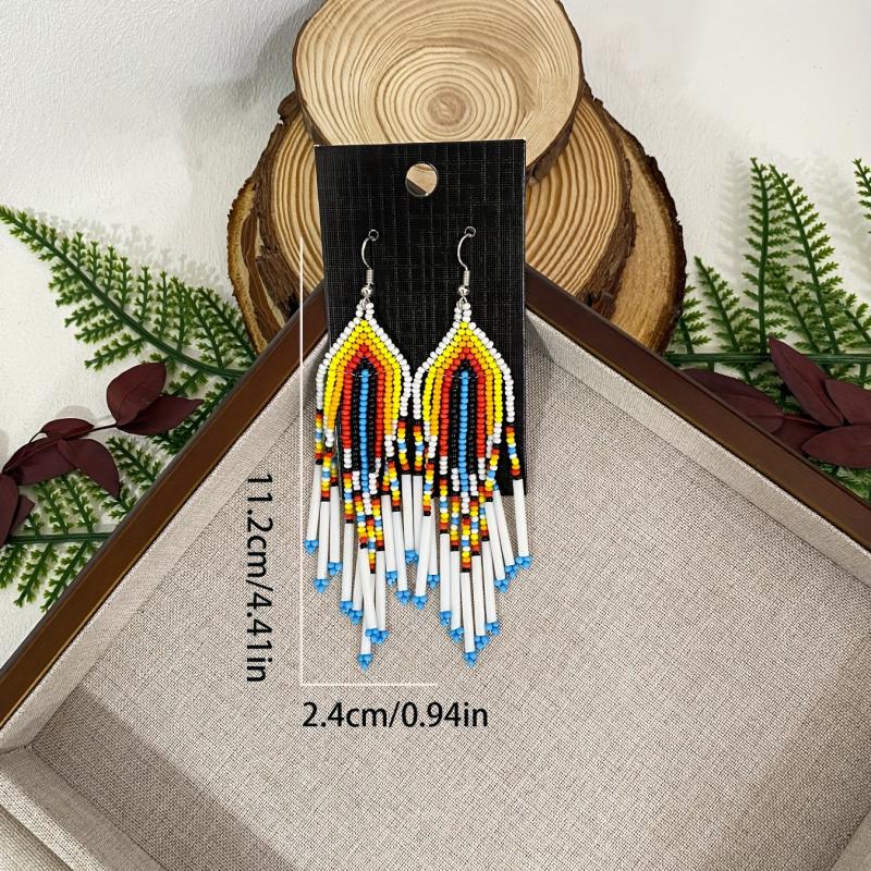 Hand-woven tassel earrings with a unique retro geometric pattern. Made with durable glass beads, these earrings are perfect for daily wear and special occasions.