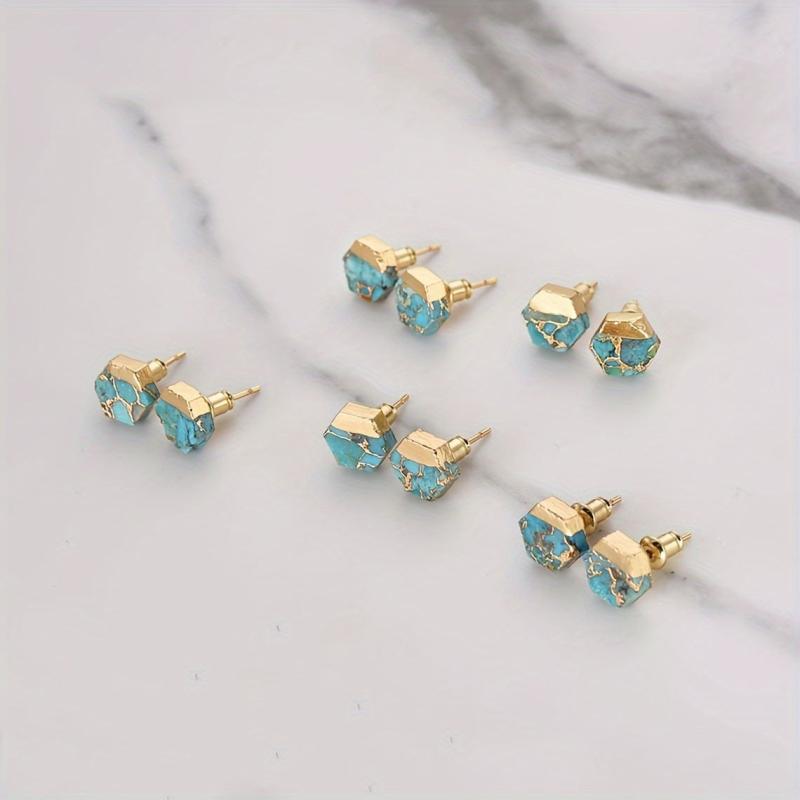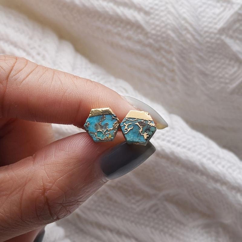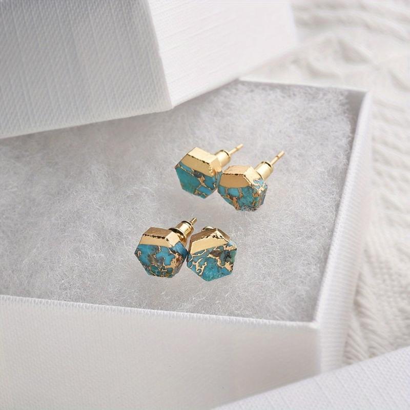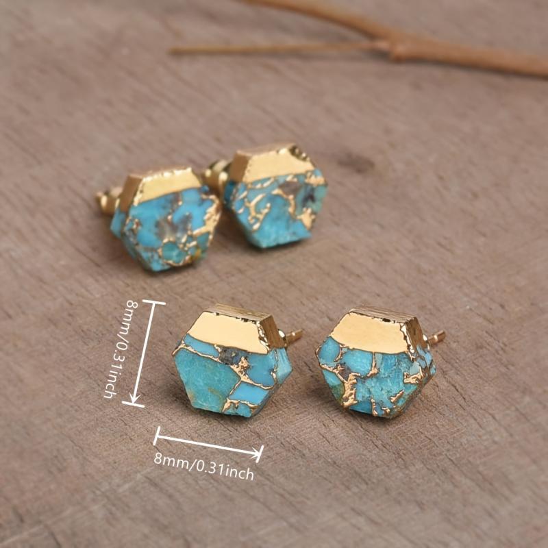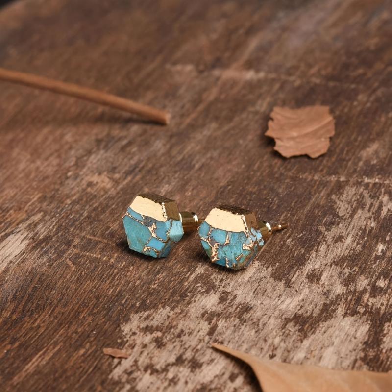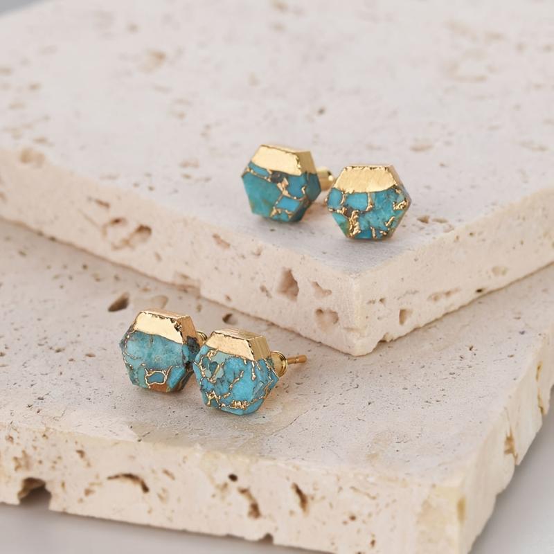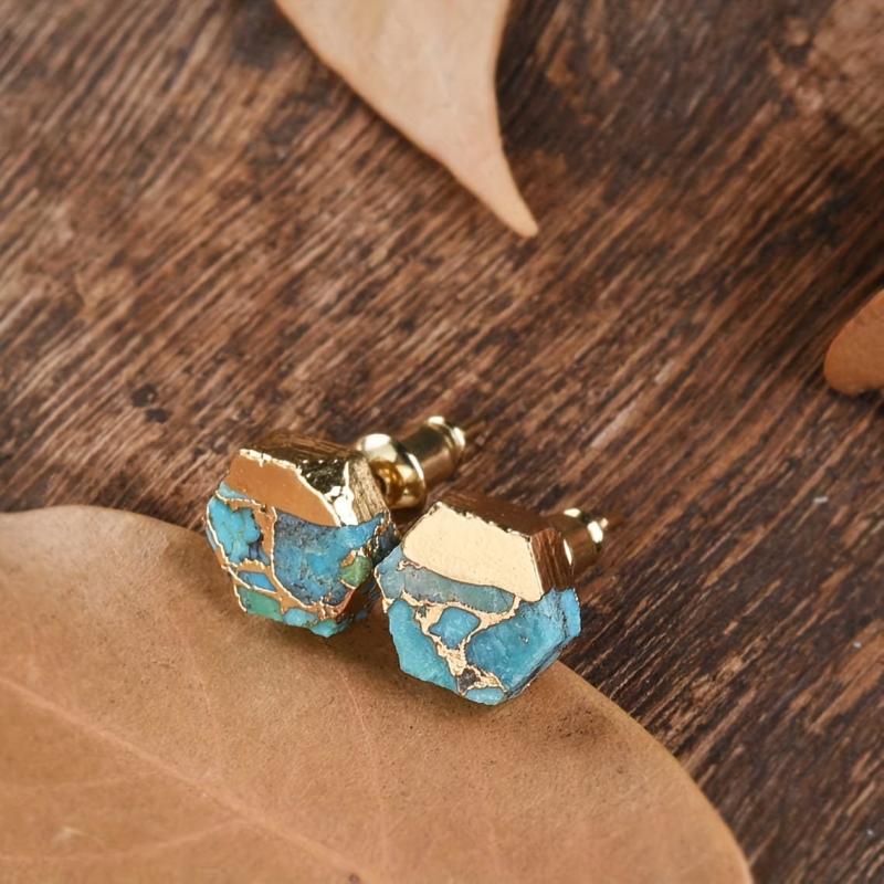 These boho turquoise stud earrings are adorned with golden accents, featuring the natural December birthstone. Perfect for casual attire and gifting.