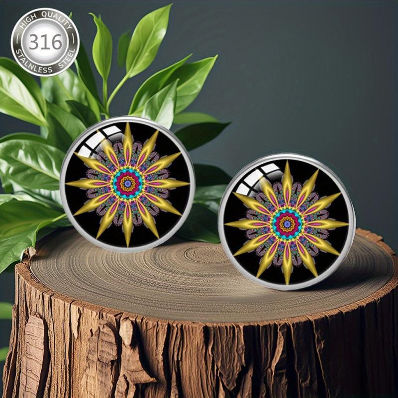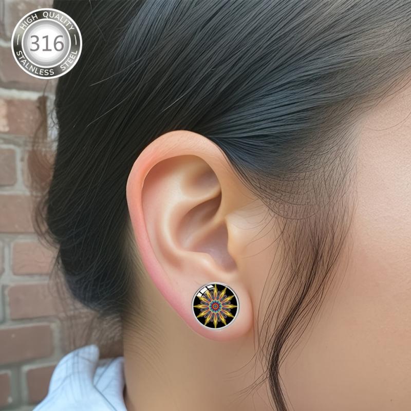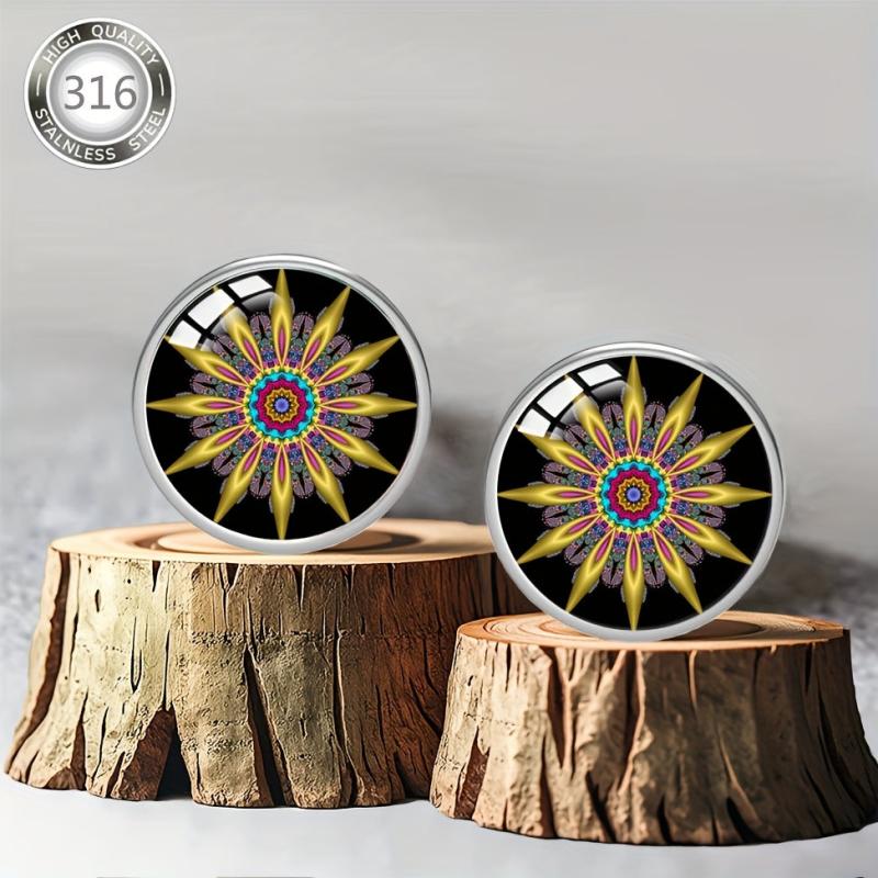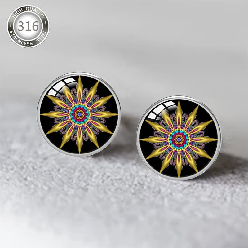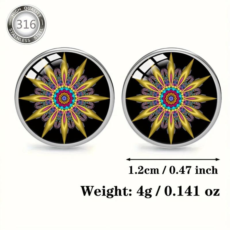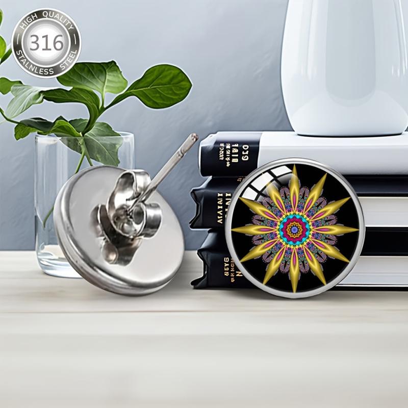 These beautiful earrings are made of hypoallergenic 316 stainless steel and feature colorful enamel inlays. The convex glass adds a unique touch to the bohemian style design, making them perfect for daily wear or parties.