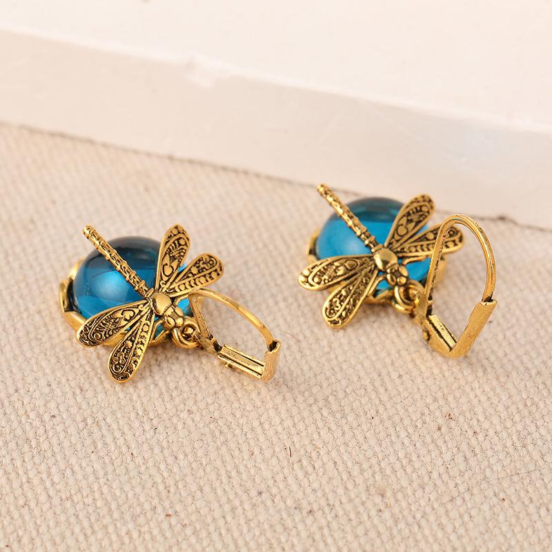 Golden Dragonfly Pendant Earrings with Moonstone Accents