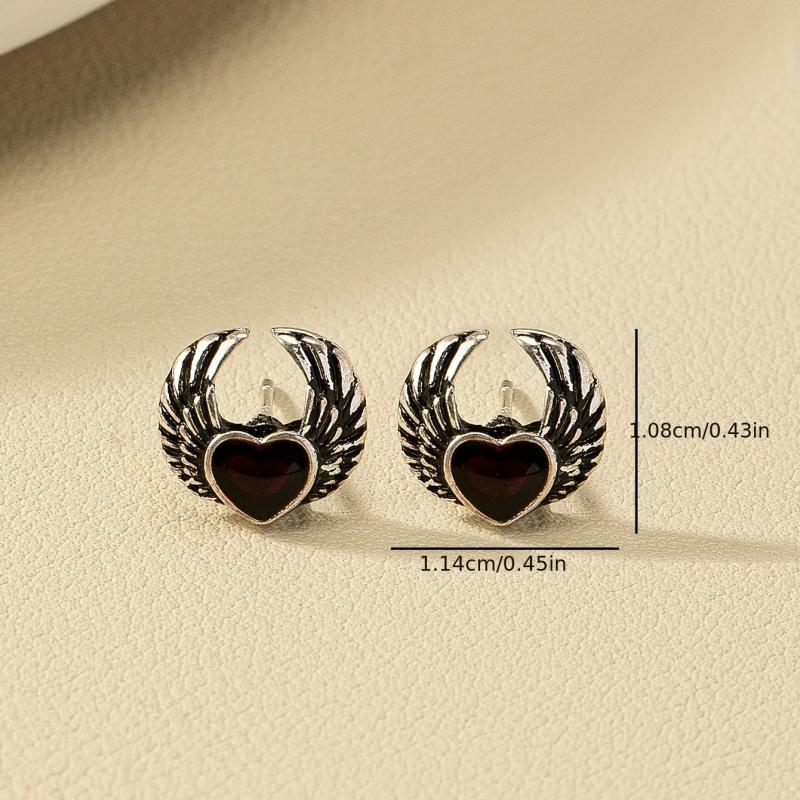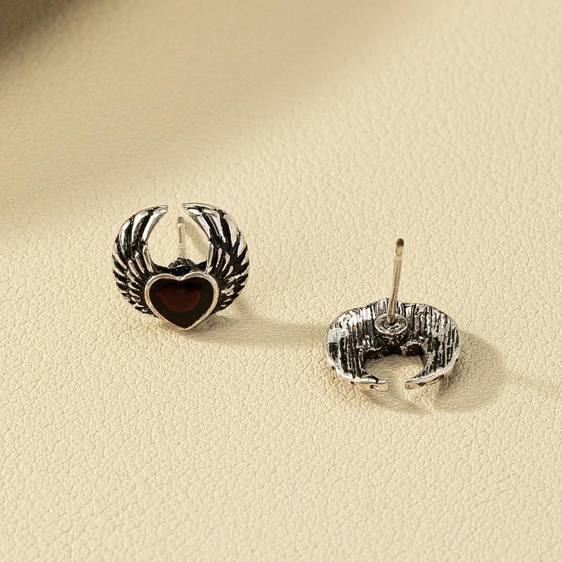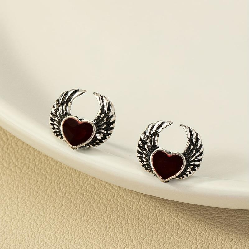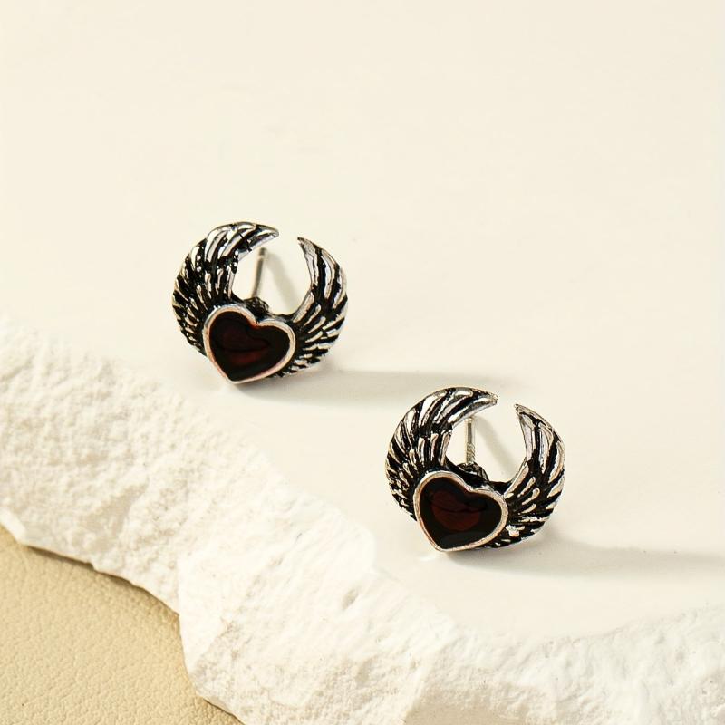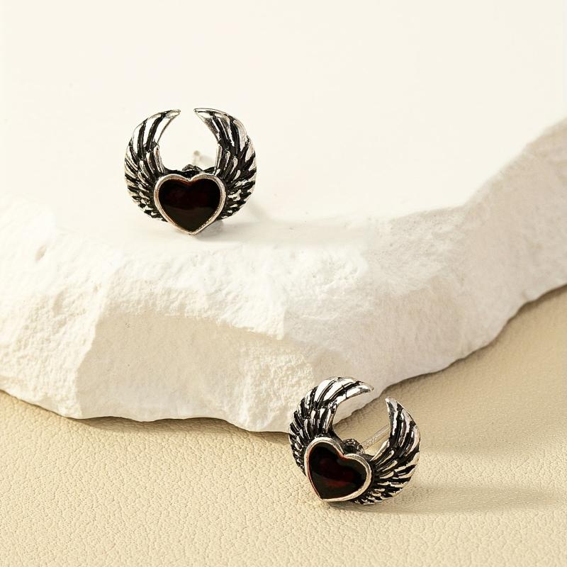 Unique women's gothic style stud earrings featuring red heart wings design. Made of zinc alloy with stainless steel ear needle. Perfect for all seasons and Halloween retro jewelry.