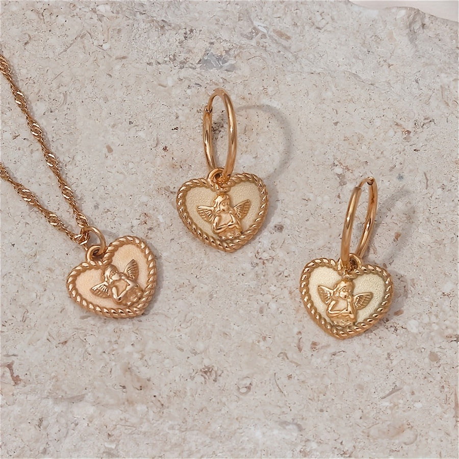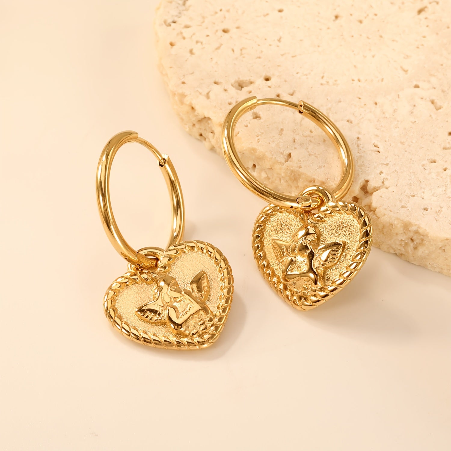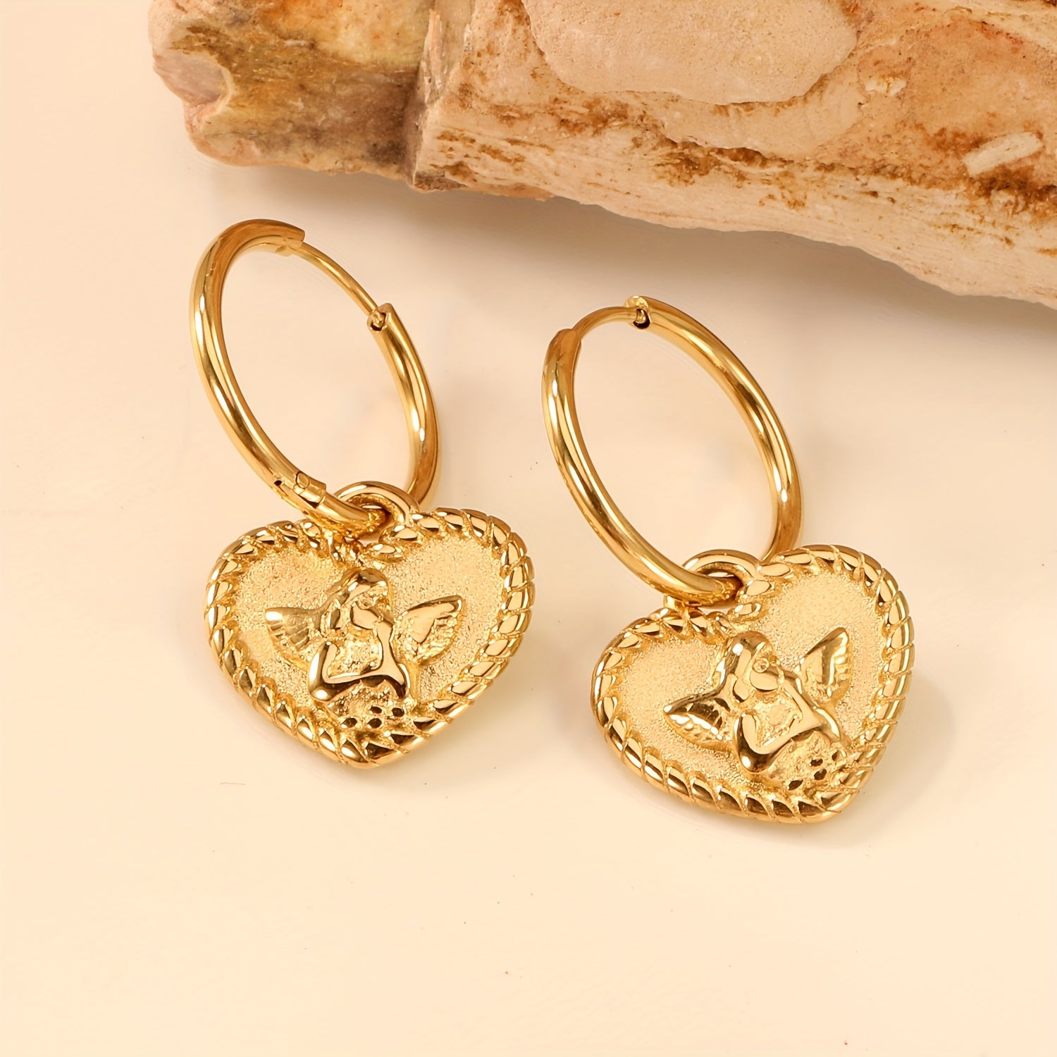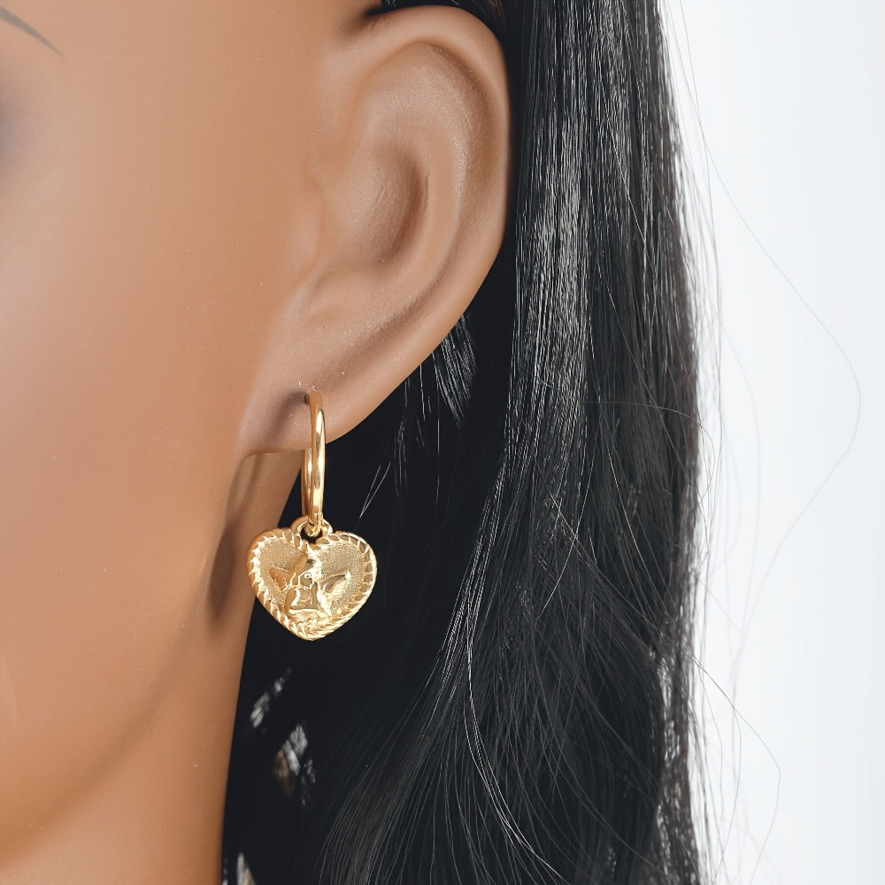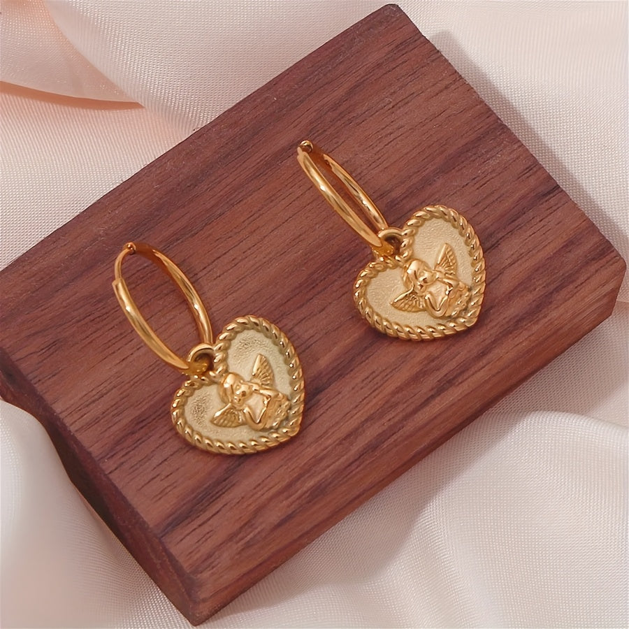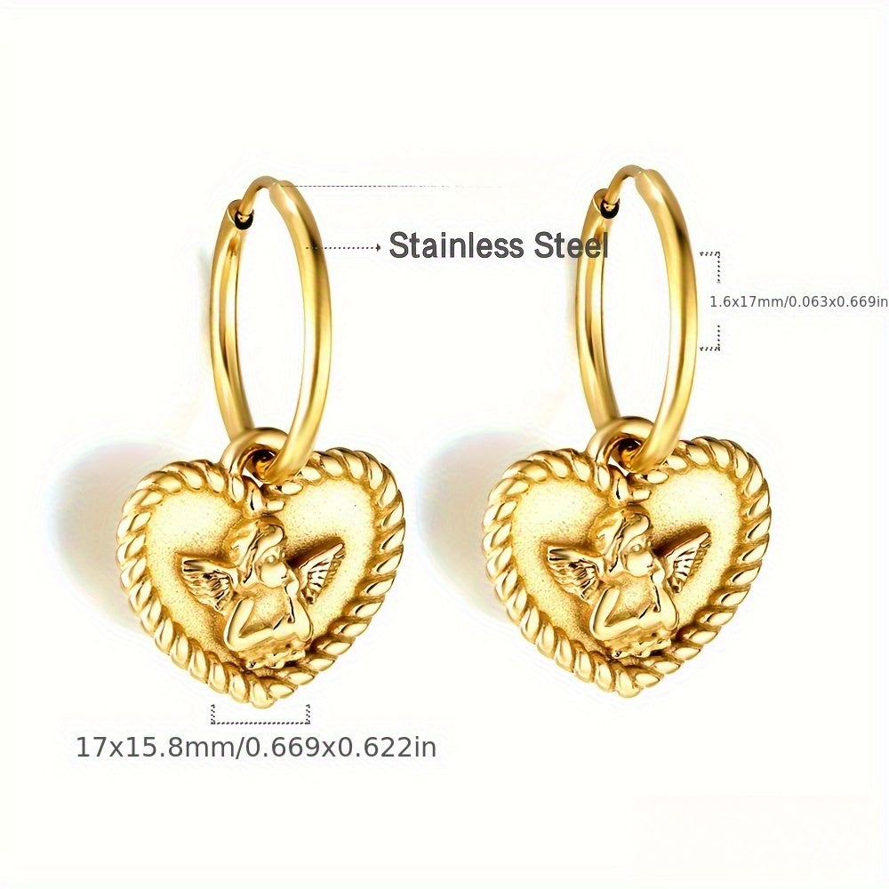 Heart Shaped Angel Charm Dangle Earrings Polished Golden Tone Stainless Steel