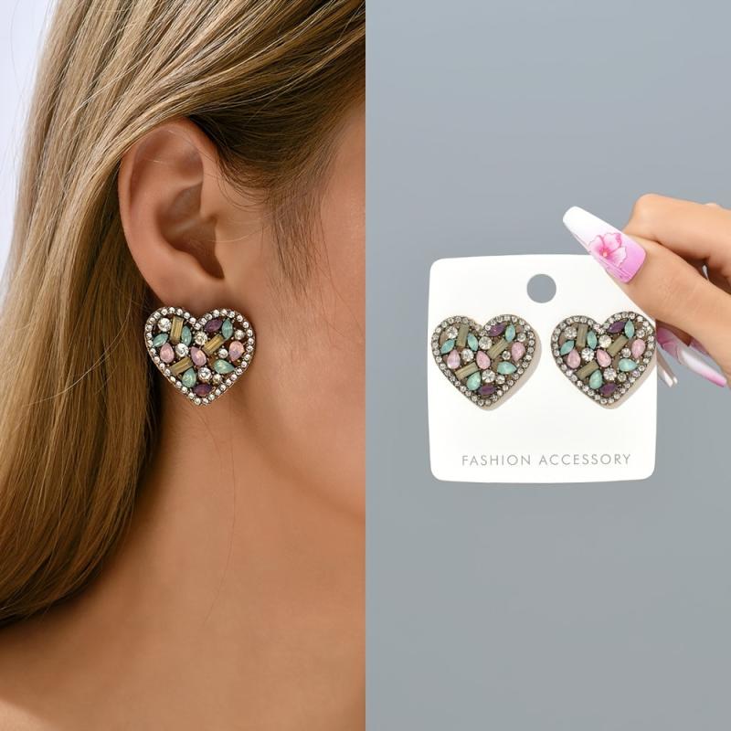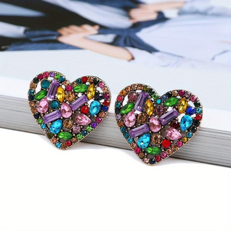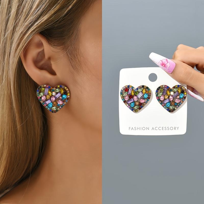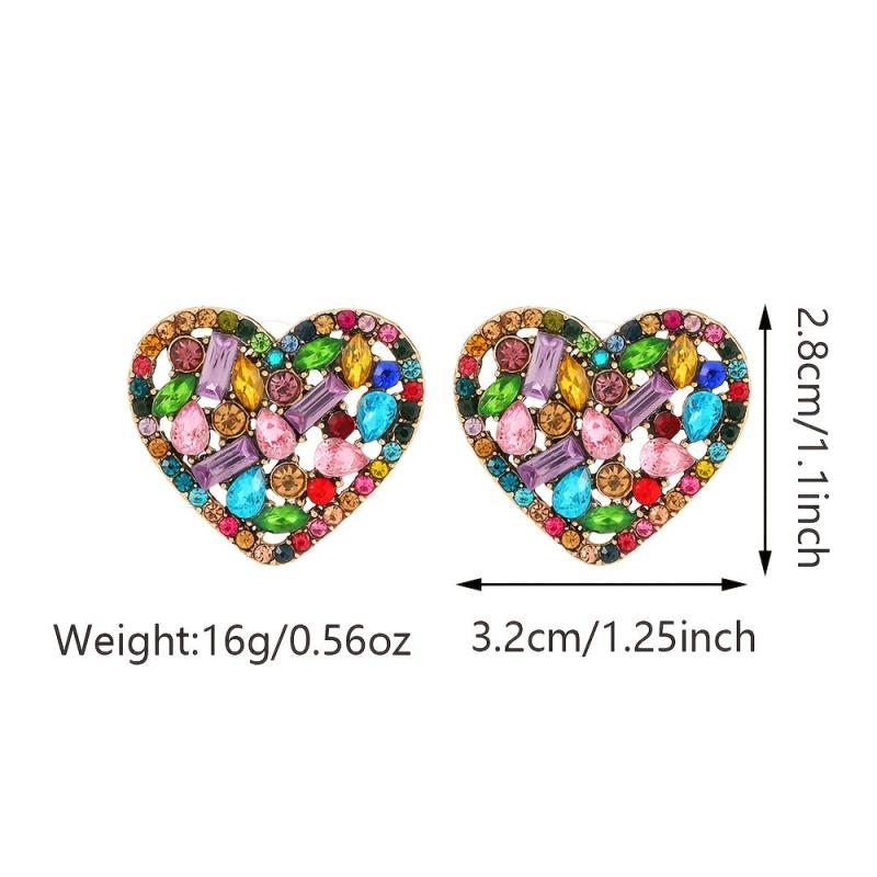 Add a touch of romance and playfulness to your look with these colorful Rhinestone Heart Stud Earrings. Made with zinc alloy and stainless steel posts, these earrings are perfect for casual attire or as a gift.