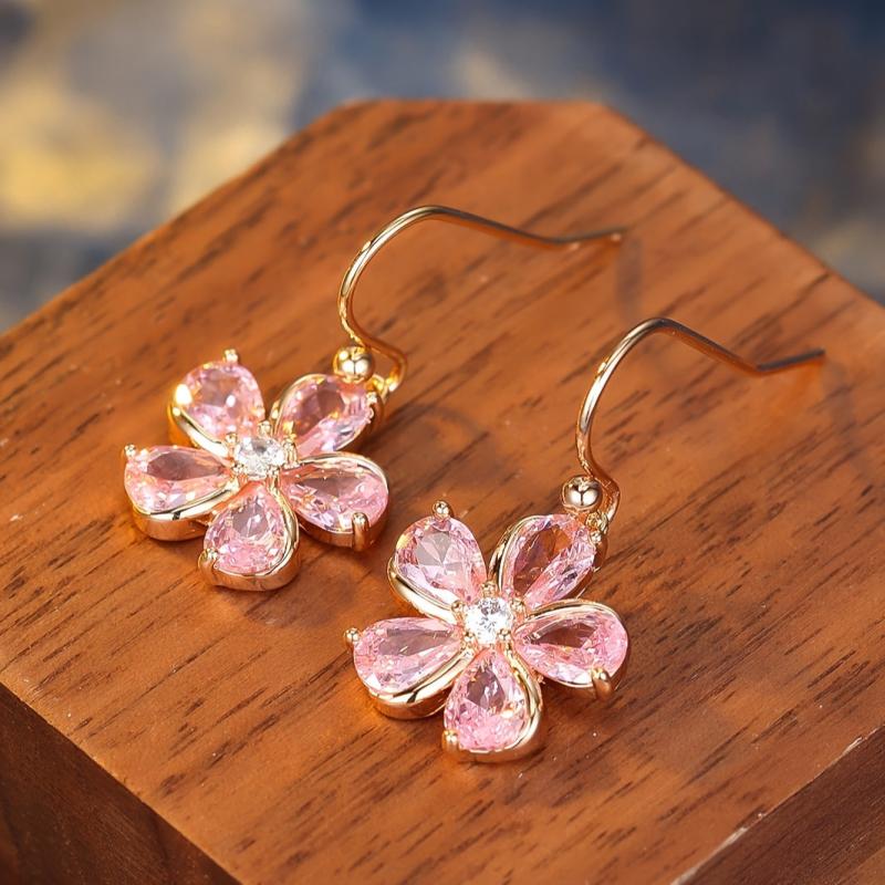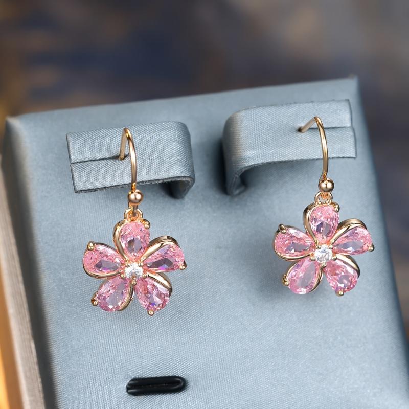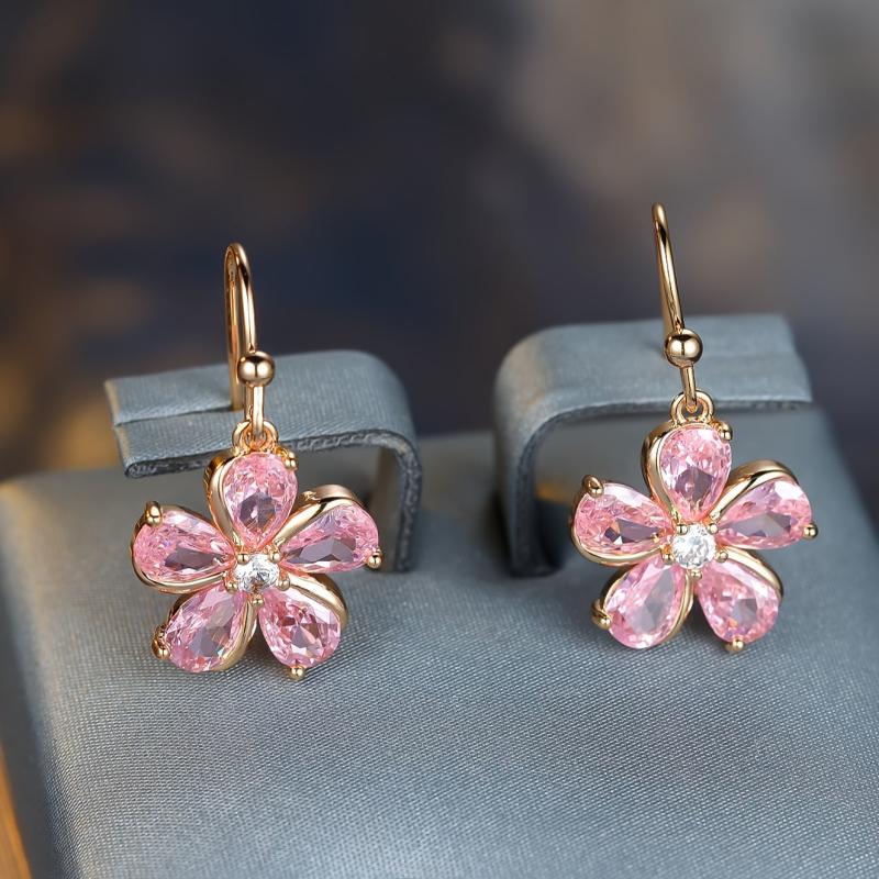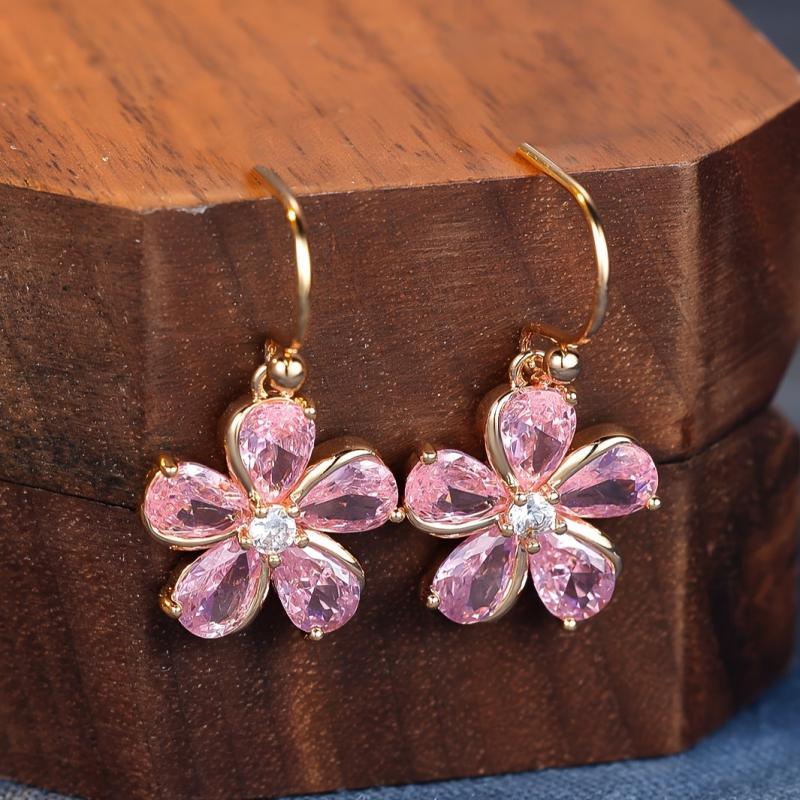 Pink Zirconia Flower Drop Earrings Copper Plated