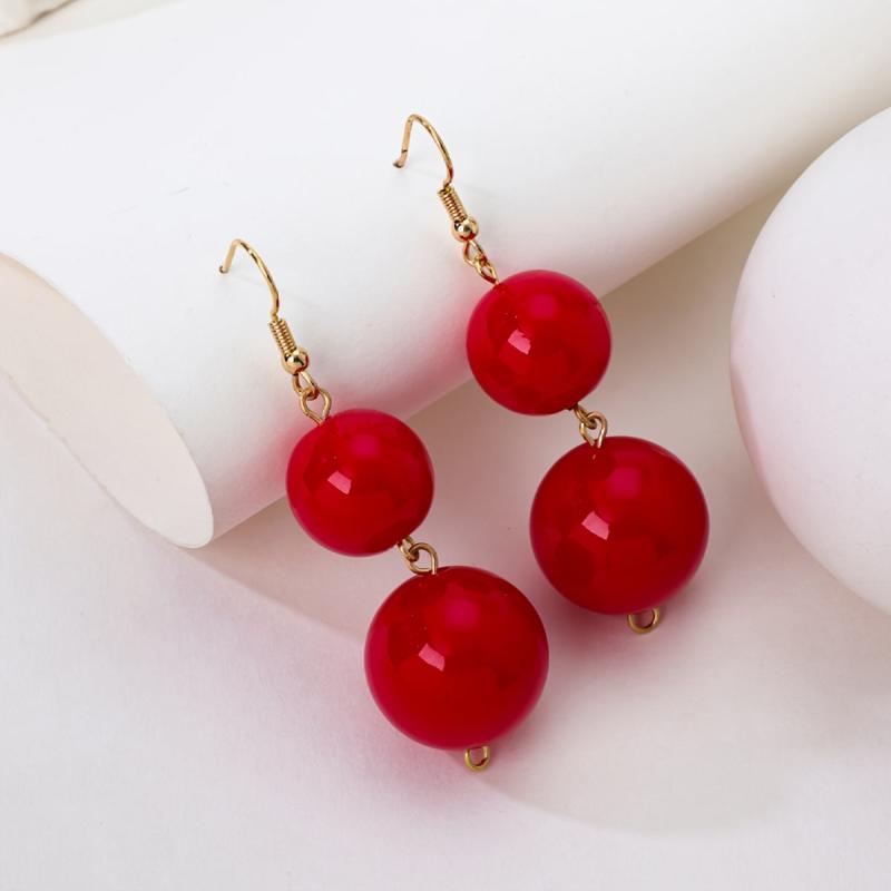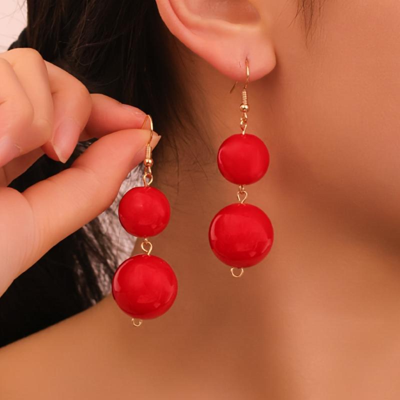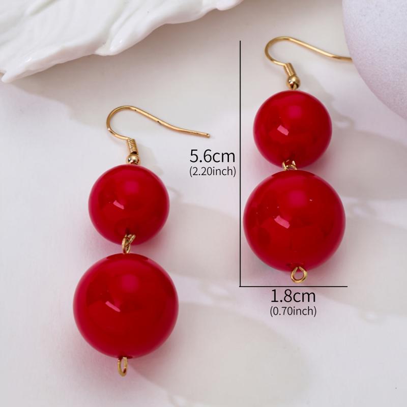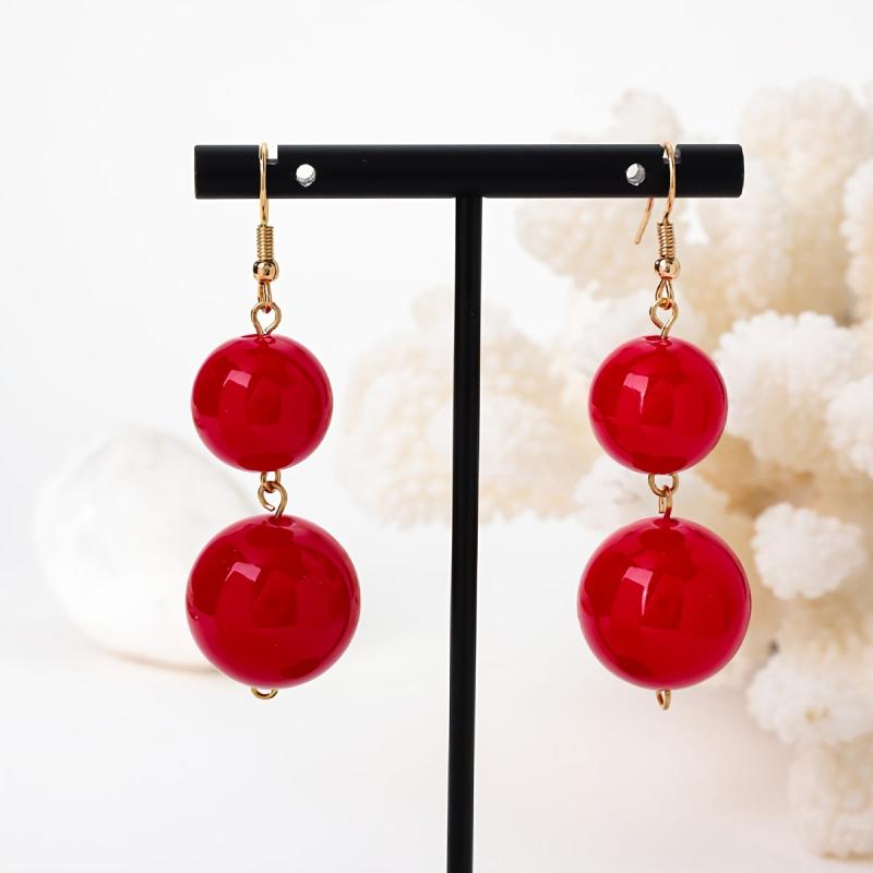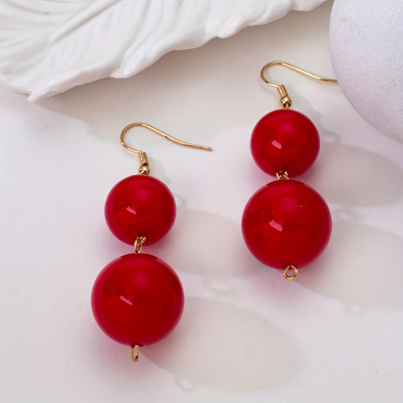 Elegant red faux pearl drop earrings with golden tone hooks, perfect for weddings, parties, and date nights.