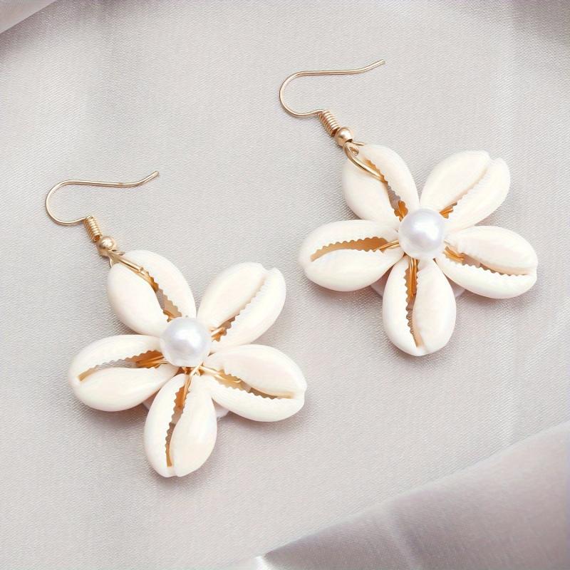 Embrace the ocean beach vibe with these stylish drop earrings featuring shell flowers and golden accents. Perfect for daily wear or accessorizing your beach dress.
