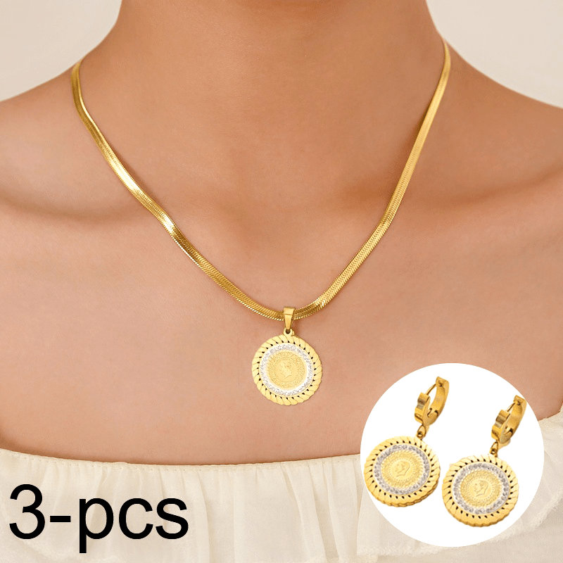 Discover this vintage-inspired stainless steel pendant and earring set featuring a low-allergy tone finish. Perfect for those with sensitive skin.