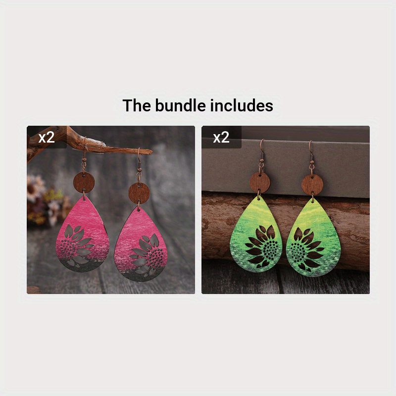 Add a touch of western charm to your holiday outfit with these droplet shape sunflower print earrings.