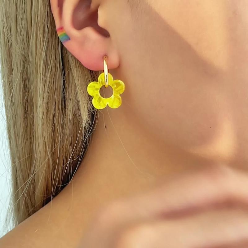 Add a pop of color with these versatile yellow acrylic flower earrings. Hypoallergenic stainless steel hooks make them perfect for daily wear. Dress up or down with this stylish accessory.