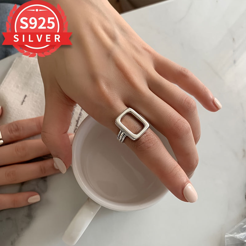 This 925 sterling silver ring features a geometric hollow rectangle design. It is adjustable, hypoallergenic, and perfect for casual attire or gifting. Comes with an anti-tarnish box for storage and protection.
