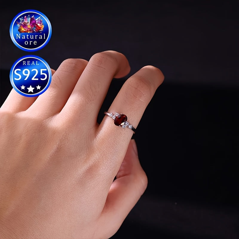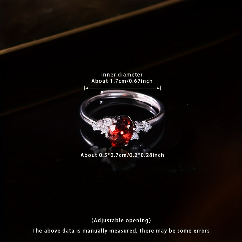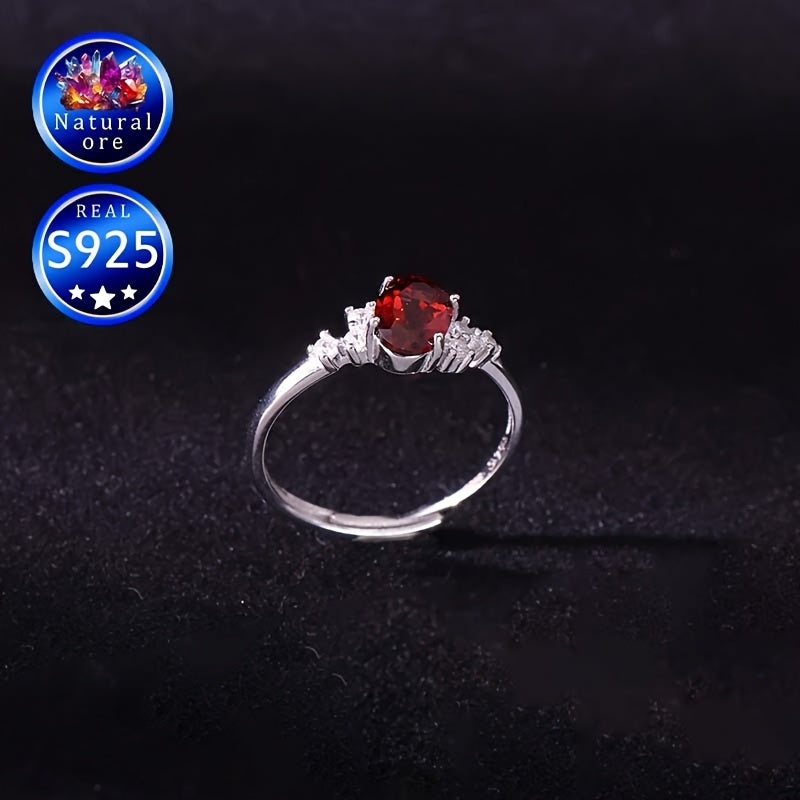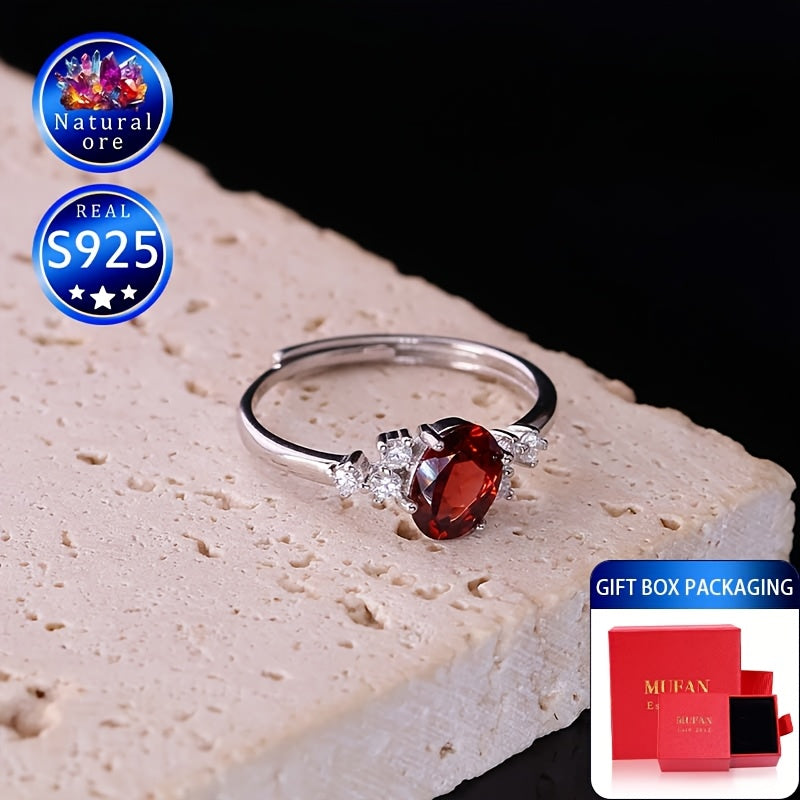 This gift boxed ring features a natural ore stone with a red garnet in a stylish S925 silver setting. The ring is openable and adjustable, making it a versatile and unique accessory.
