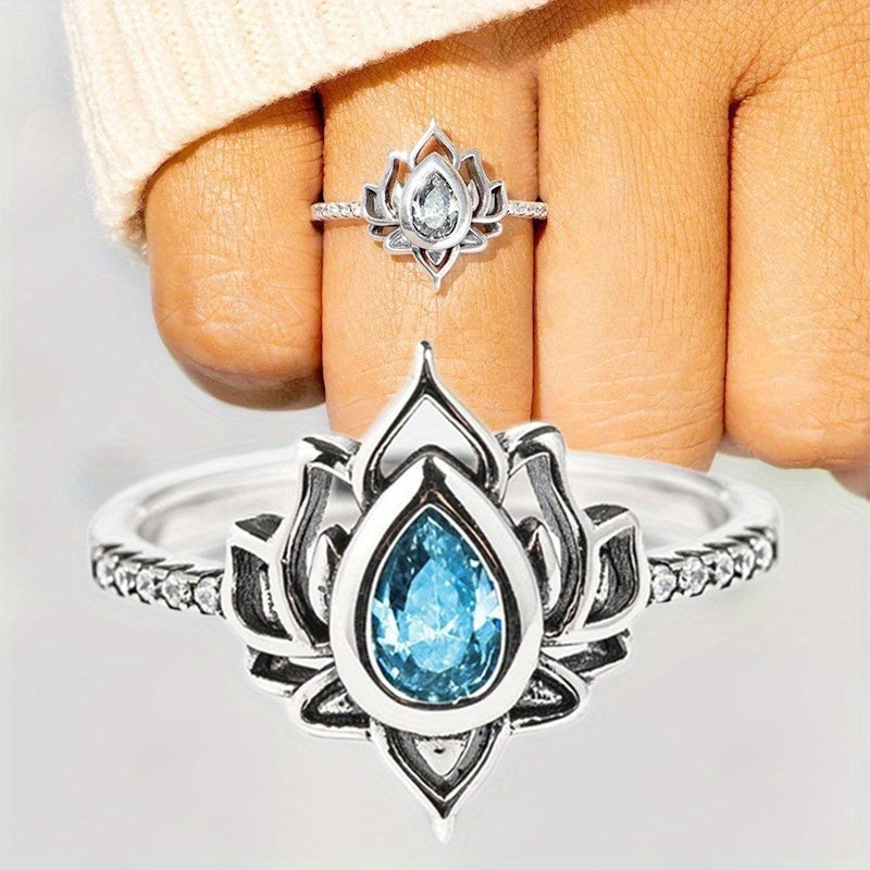 Add a touch of boho chic to your look with this stunning silver plated lotus promise ring featuring an inlaid teardrop shape aquamarine. Perfect for engagement, wedding, brides, evening party or everyday wear.