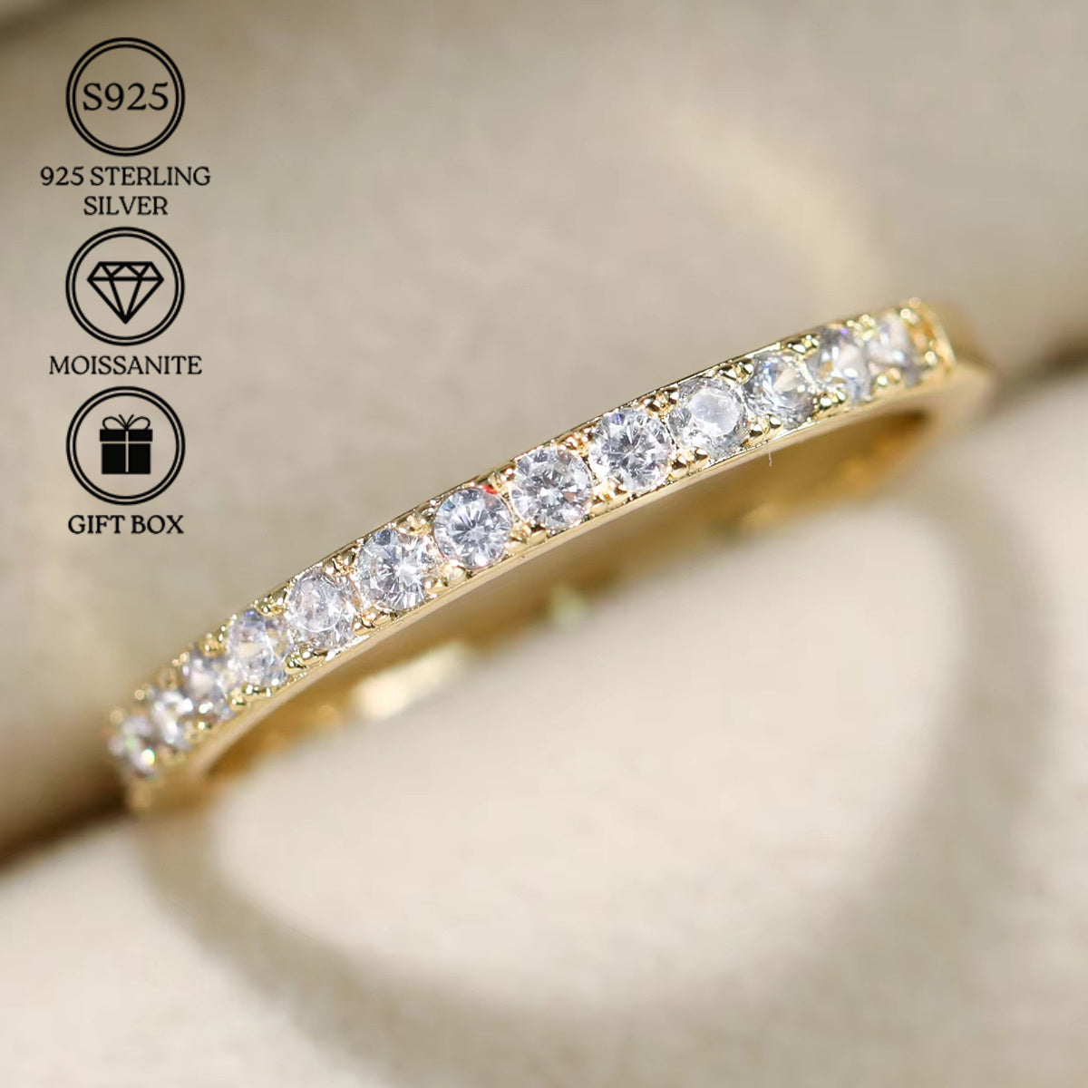 This stunning ring features a 0.25ct Moissanite gemstone set in 925 Sterling Silver with 18K Golden Plating. Perfect for anniversaries or romantic occasions.