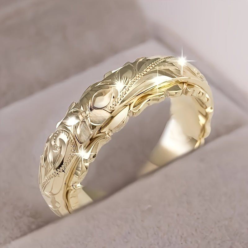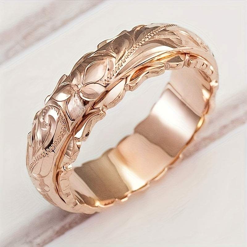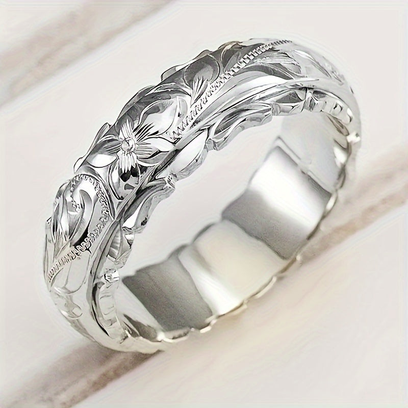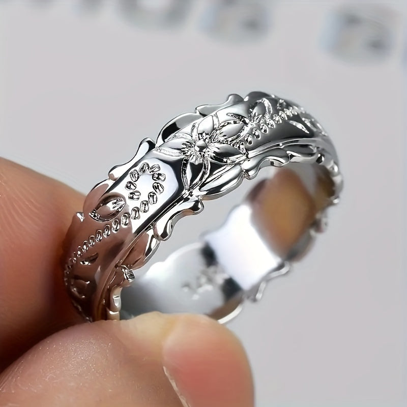 This stylish ring features a beautiful carved rose design, making it a perfect accessory for women who love unique jewelry. The wide band adds a modern touch to the classic floral motif.