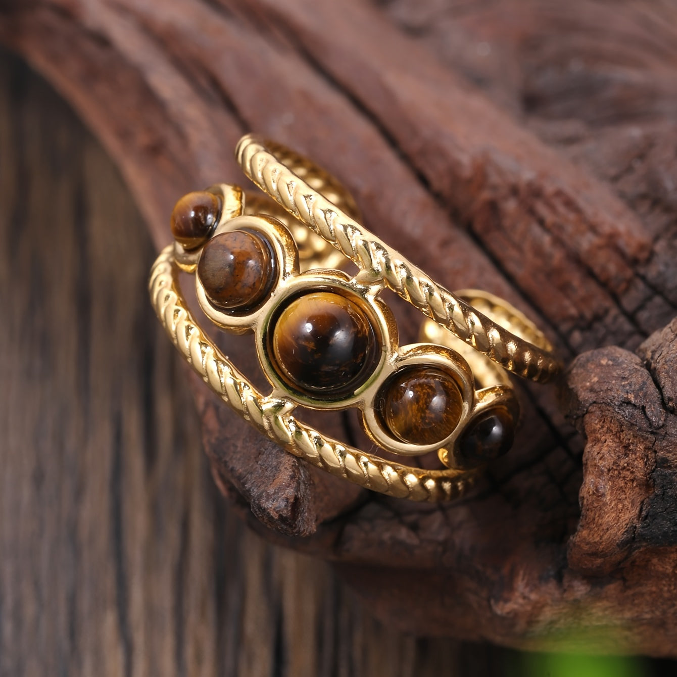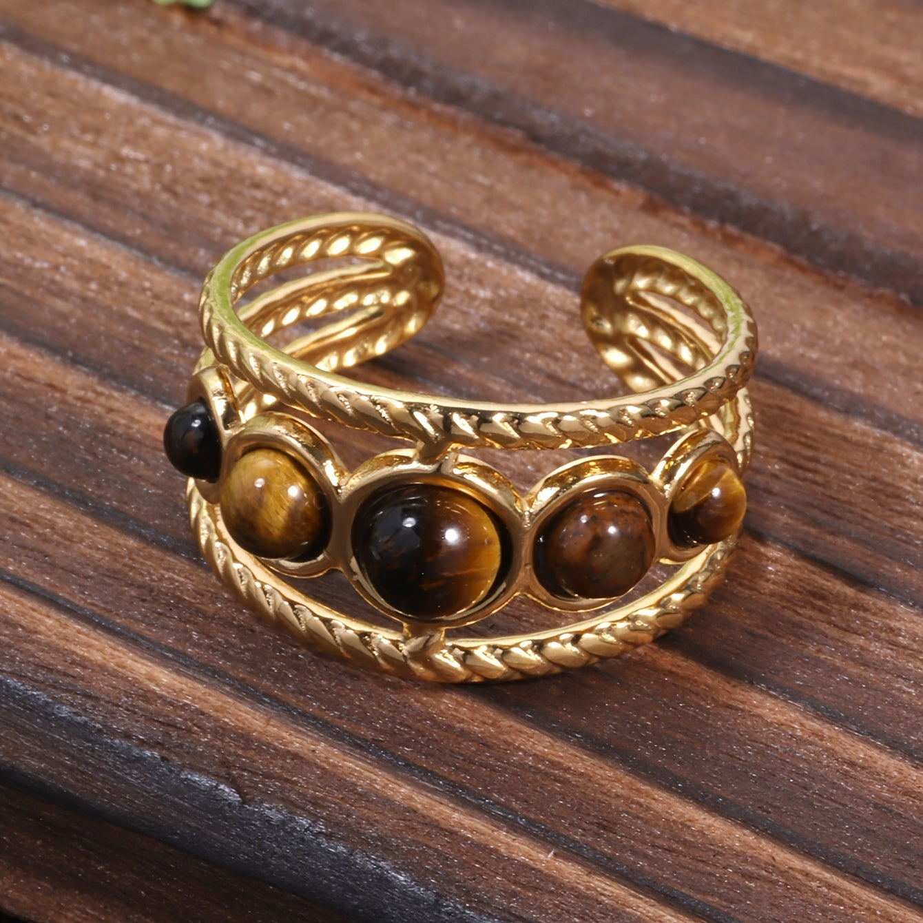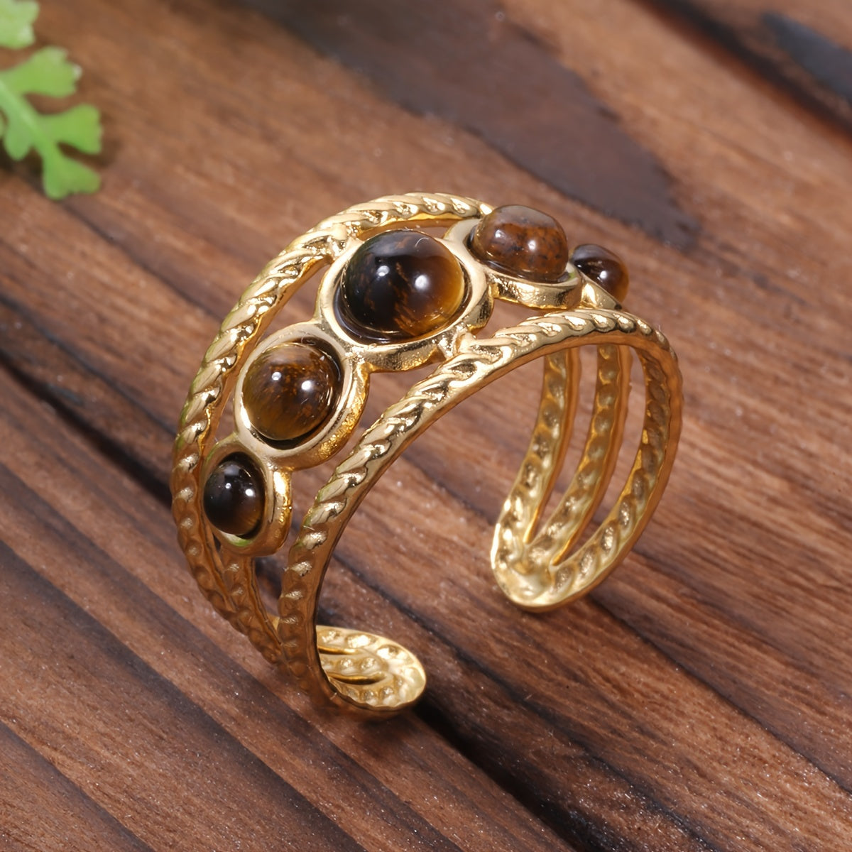 Elegant round hollow ring with an opening adjustment featuring a natural stone center. Perfect for a gift or to wear at banquets with its light design.