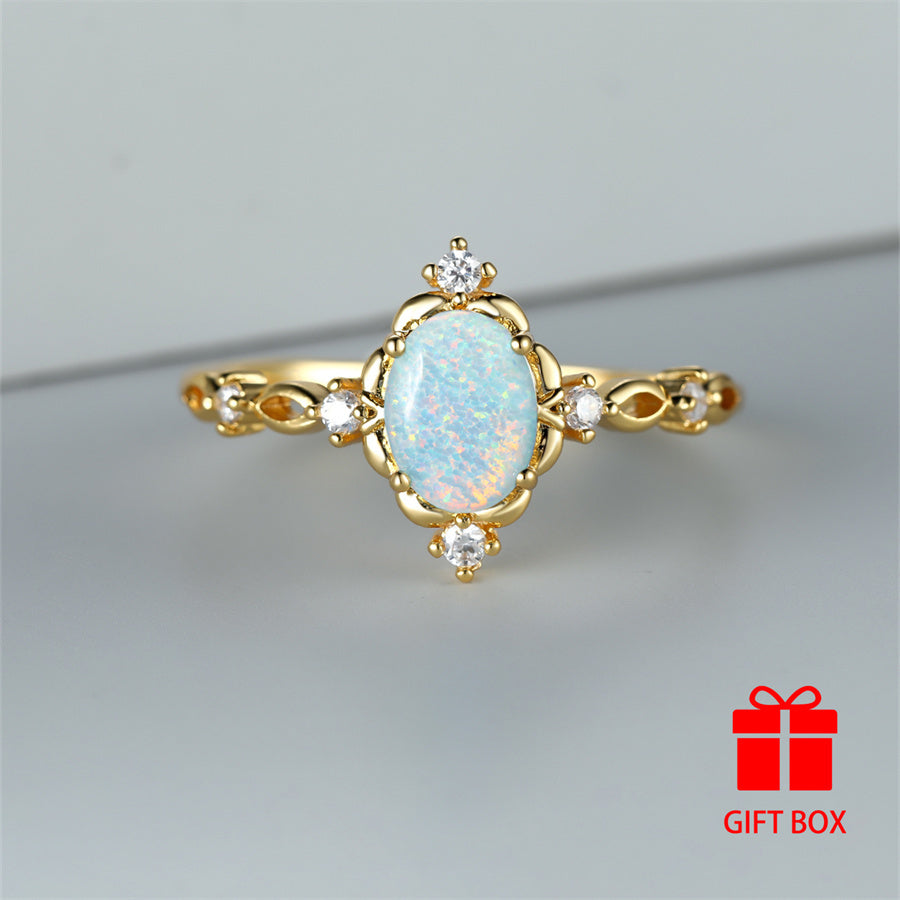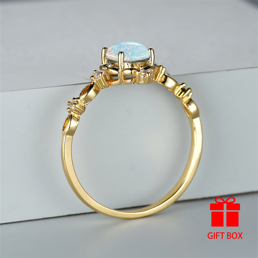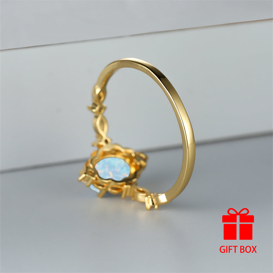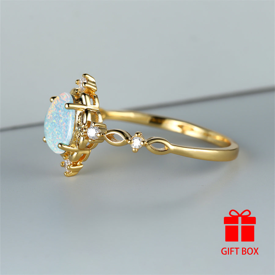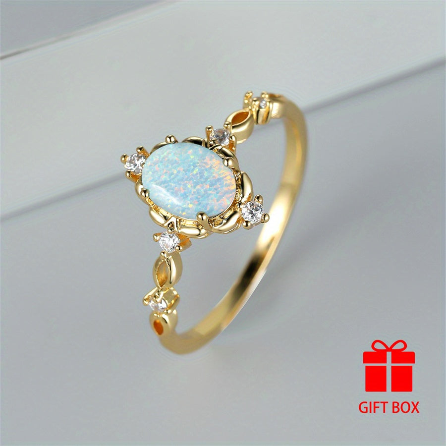 Elegantly designed oval synthetic opal ring in a golden tone is perfect for weddings, parties, and everyday glamour. Stand out with this stunning accessory.