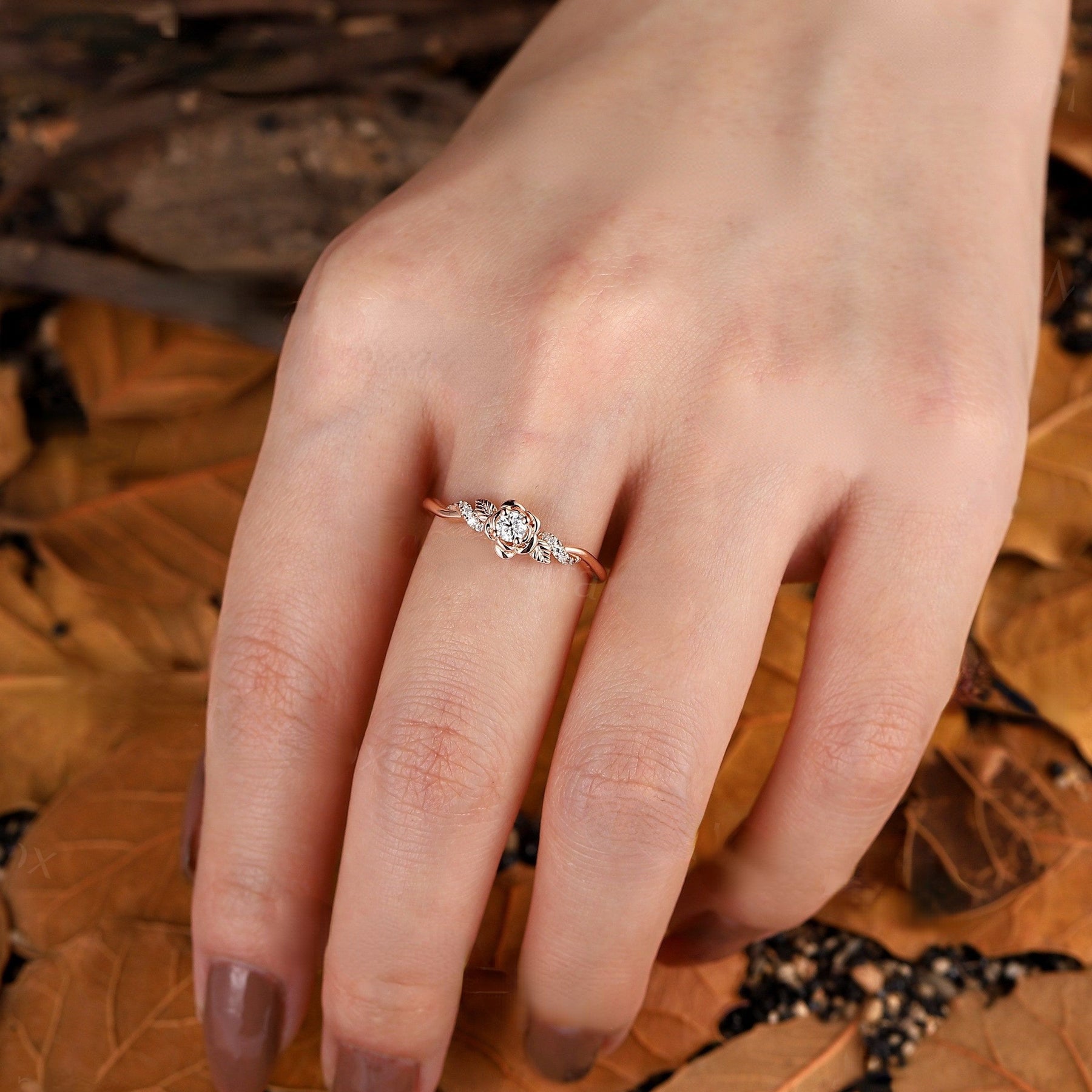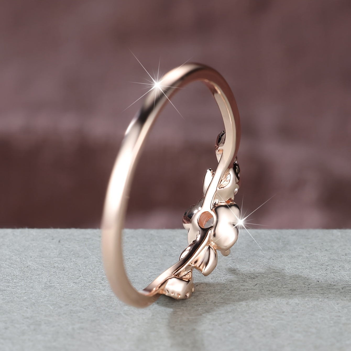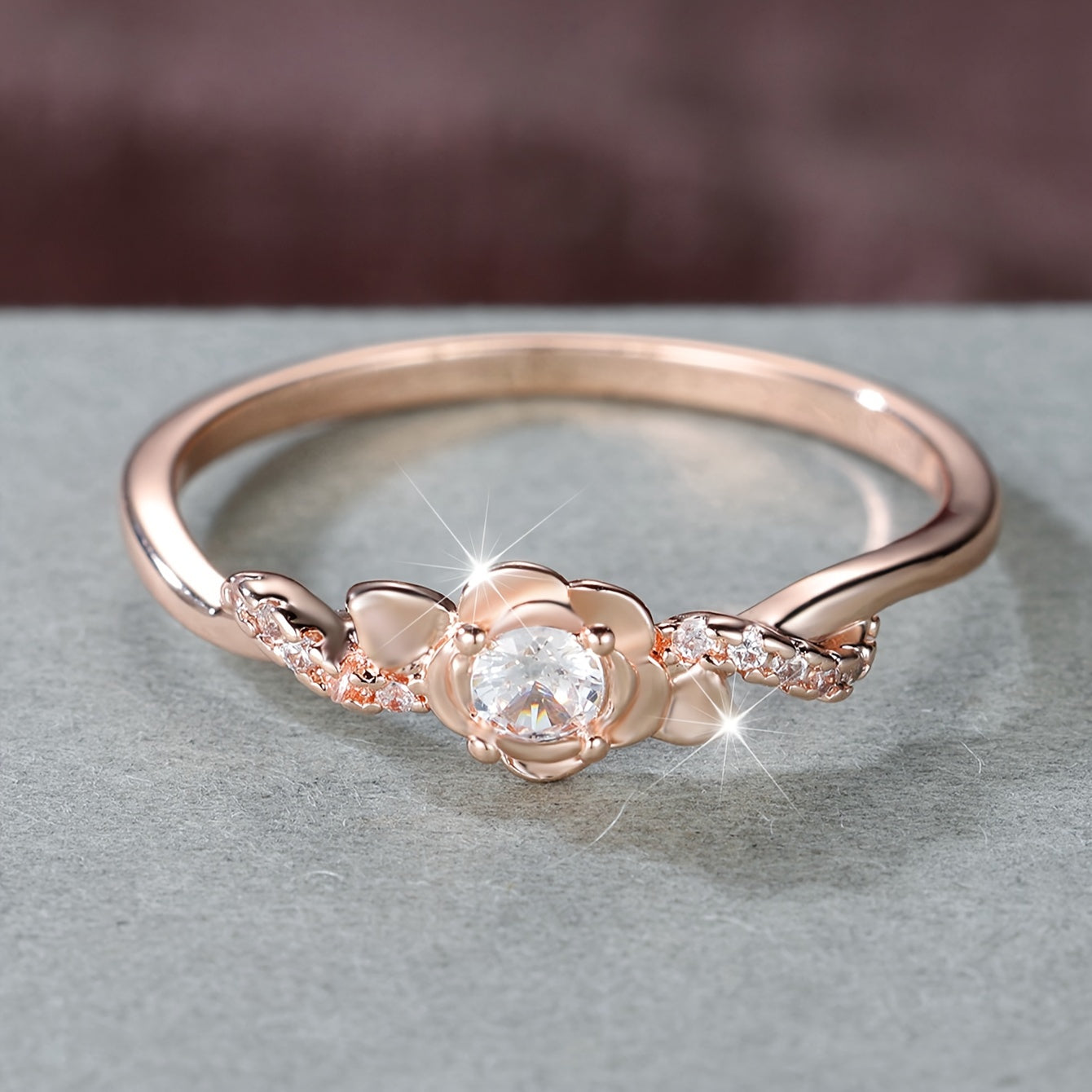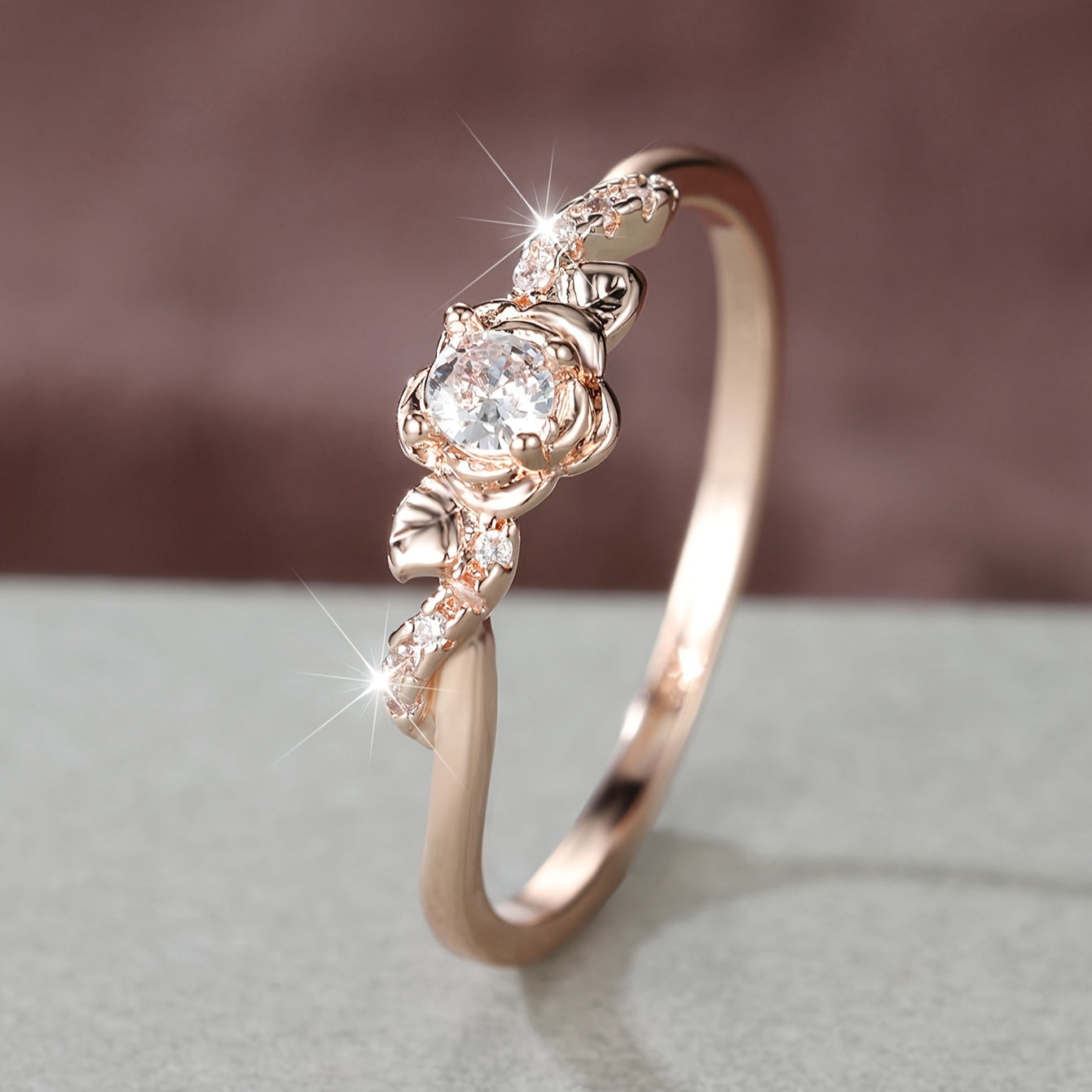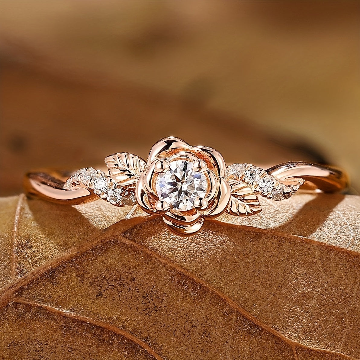 This stunning ring features a rose flower design with leaf vine elements, crafted from high-quality copper and zirconia. It is perfect for both daily wear and special occasions like banquets.