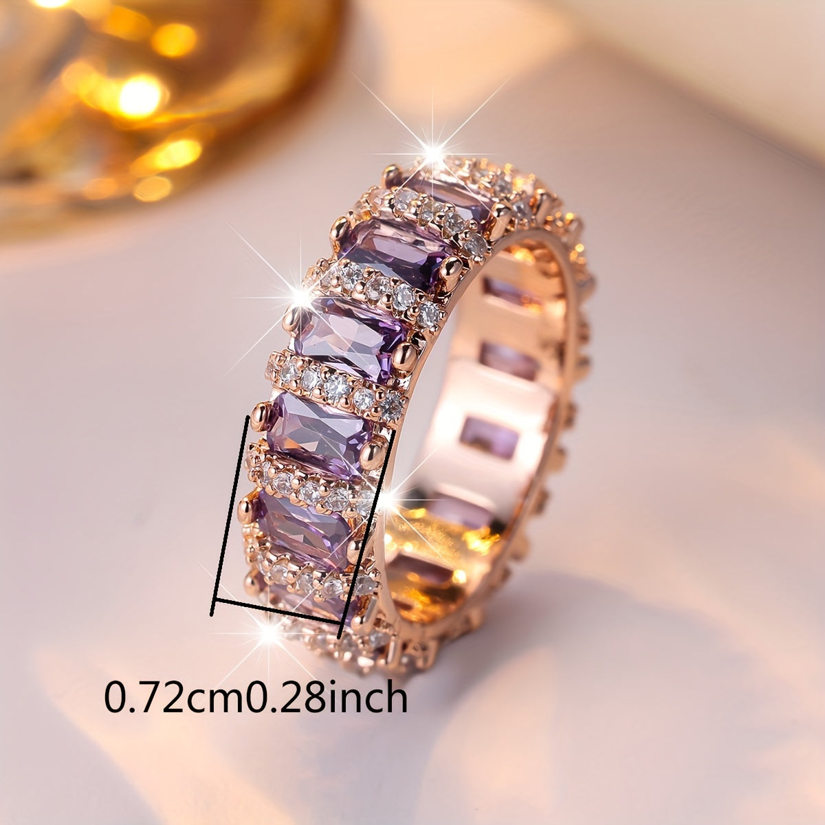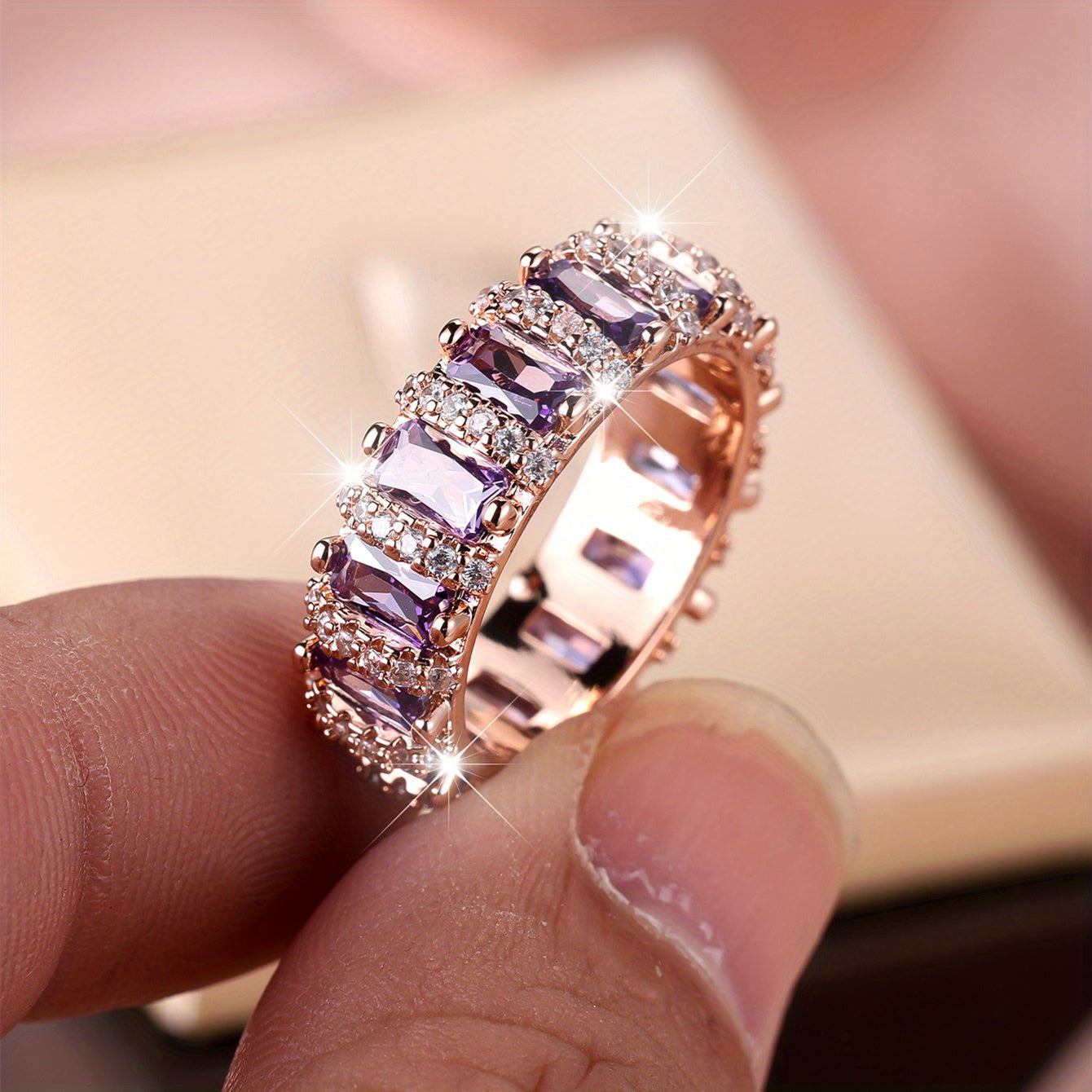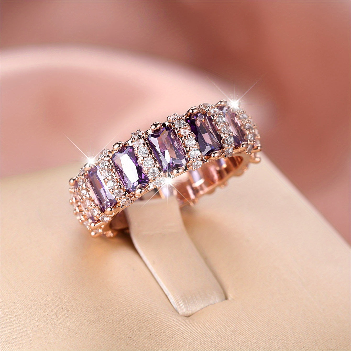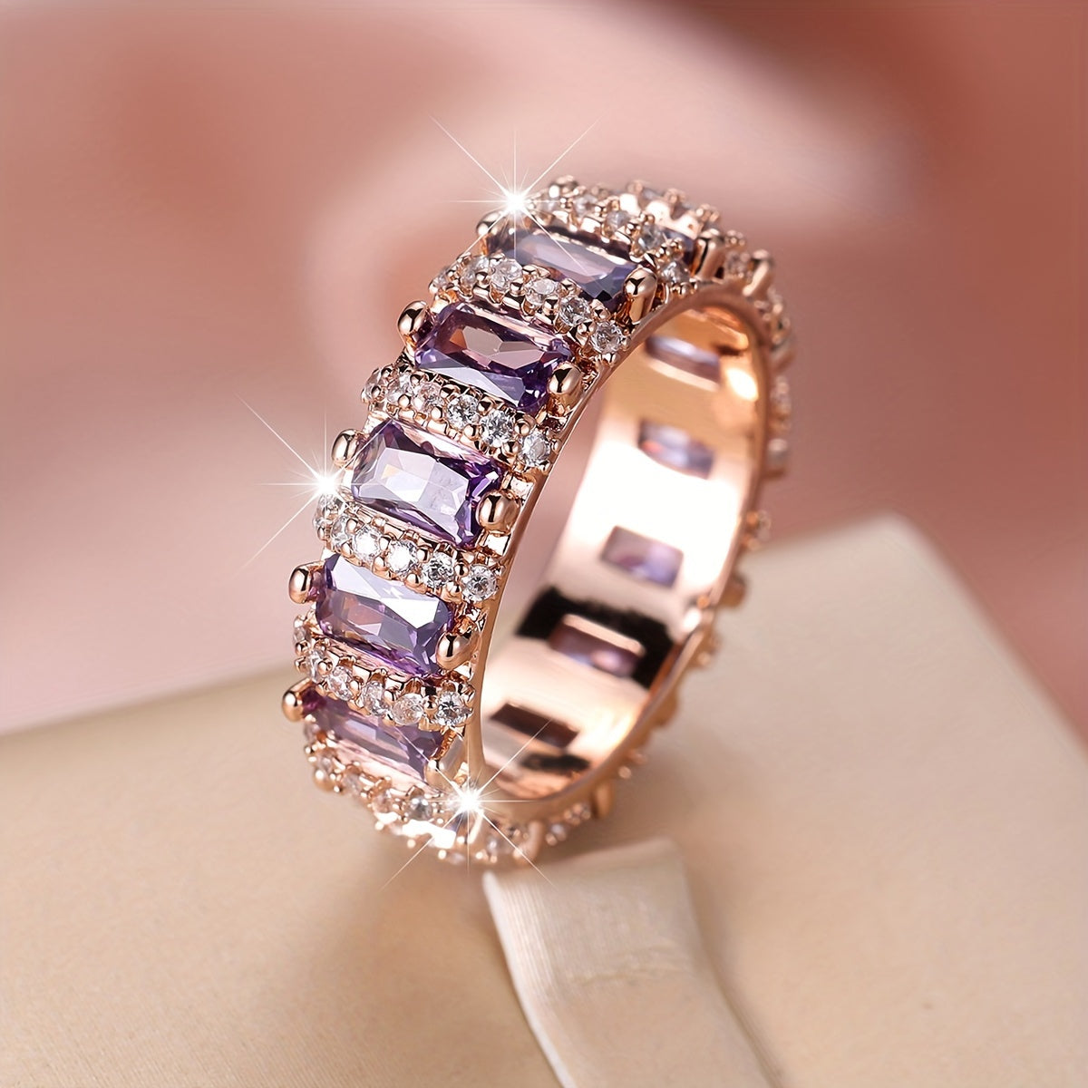 Stunning rose gold band with purple & clear cubic zirconia stones, perfect for weddings, parties, and banquets.