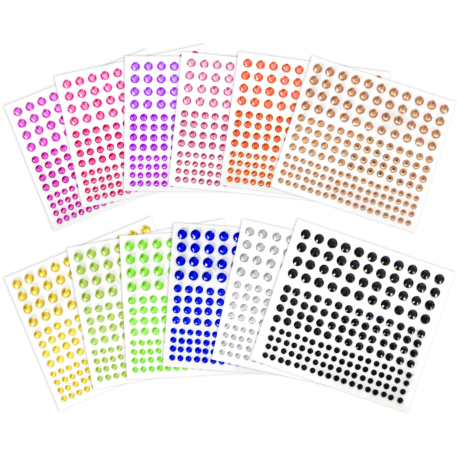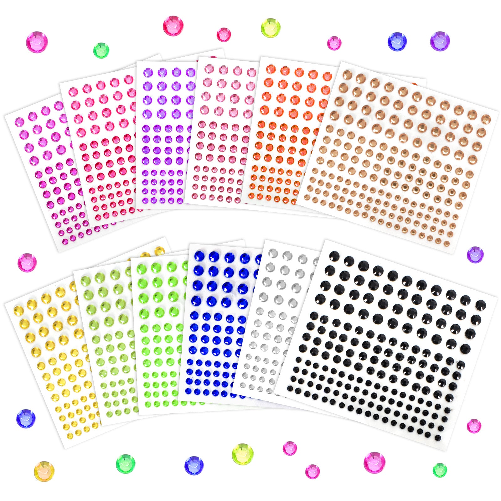 Colorful and sparkling self-adhesive rhinestones stickers perfect for DIY crafts, greeting cards, and face decoration. Each sheet contains a variety of round rhinestones in different colors and sizes.