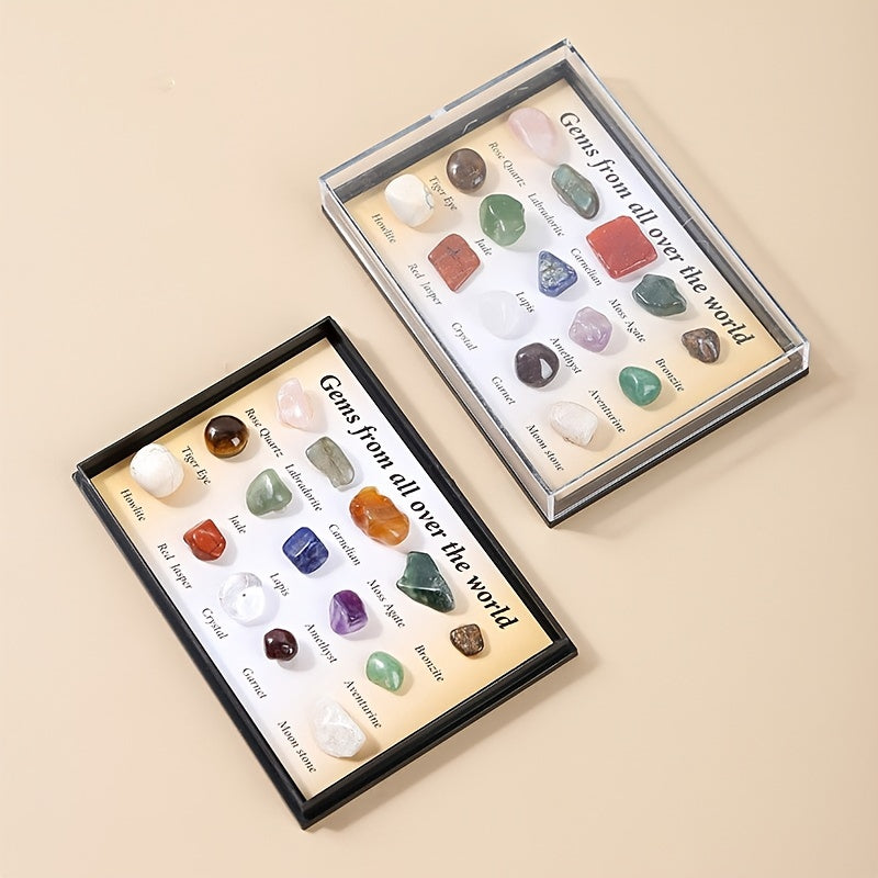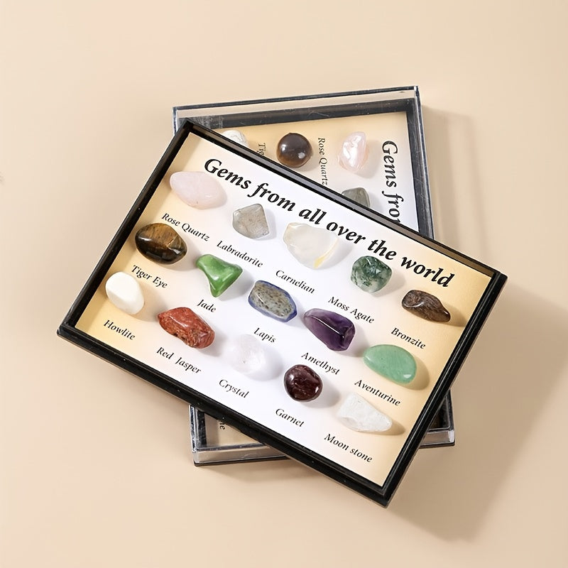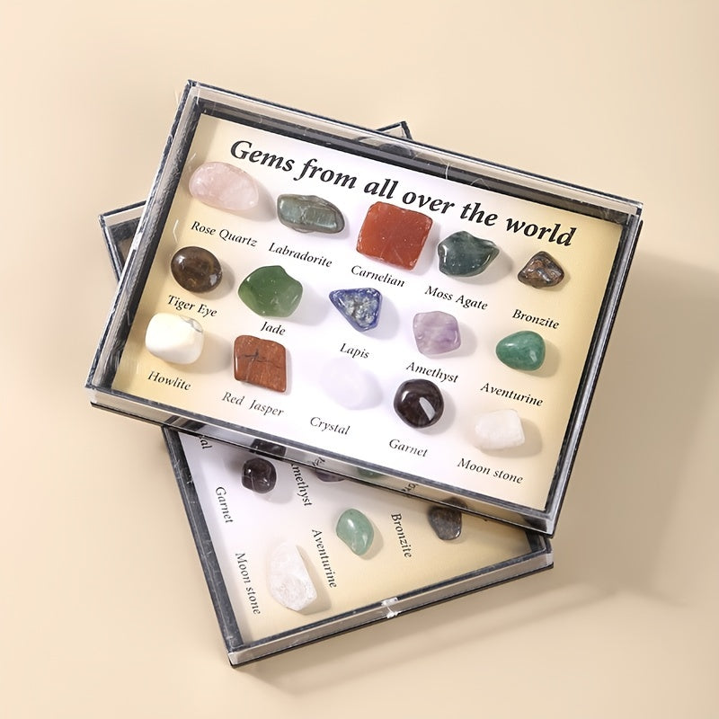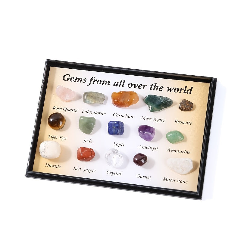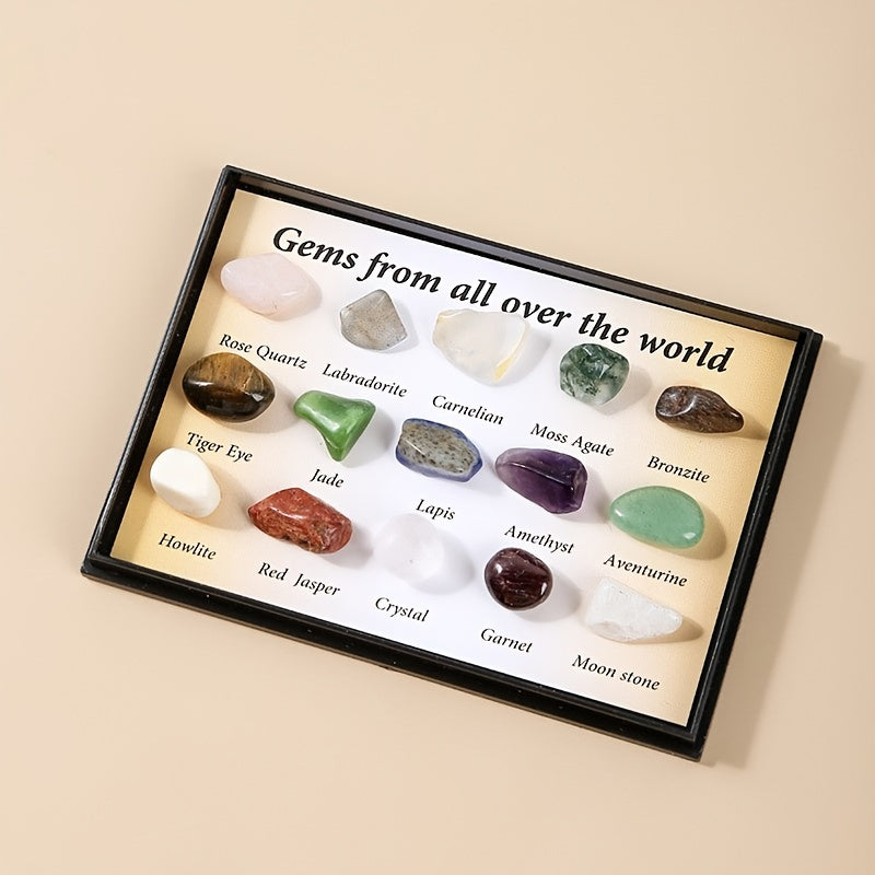 Beautiful set of 15 polished rolling stones featuring crystal jade and semi-precious stone ore specimens. Ideal for decoration, meditation, and crystal healing practices.