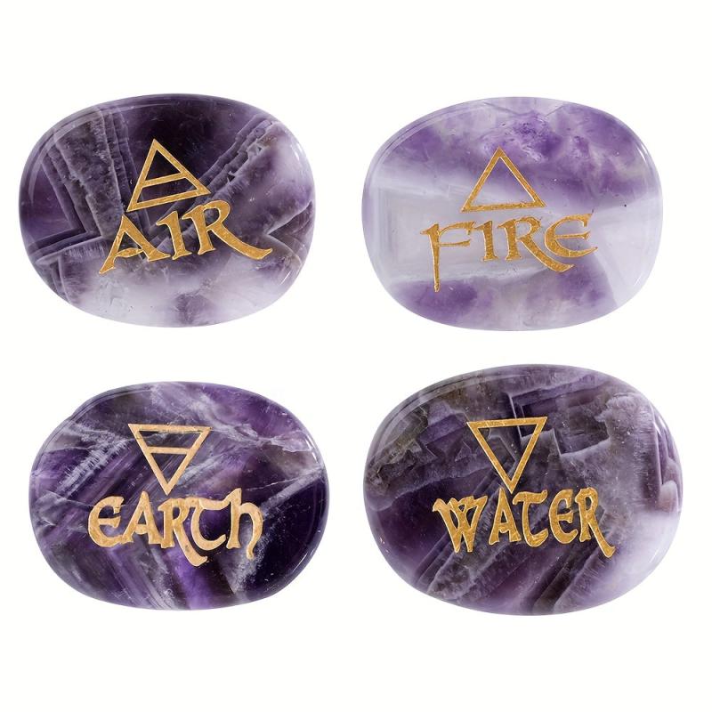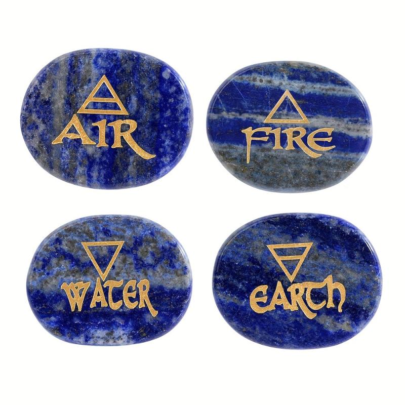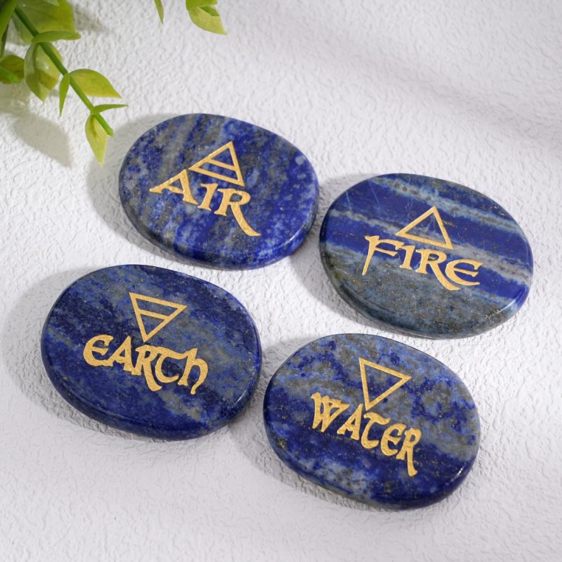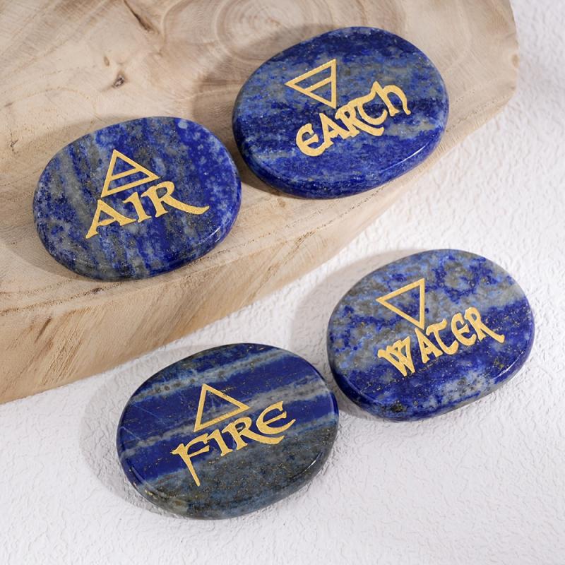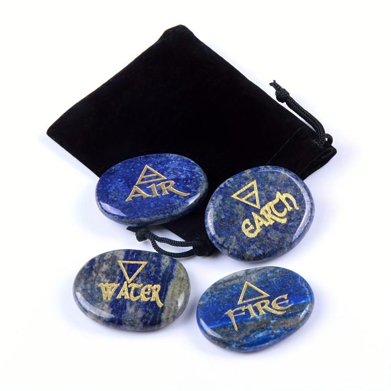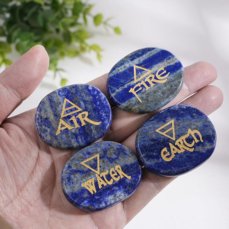 Enhance your Reiki practice with this set of 4 natural Lapis Lazuli palm stones featuring hand-carved Reiki symbols. Each stone is polished to perfection.