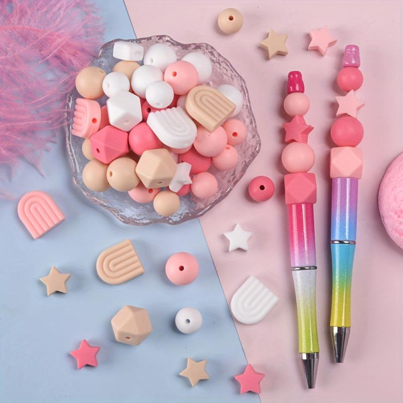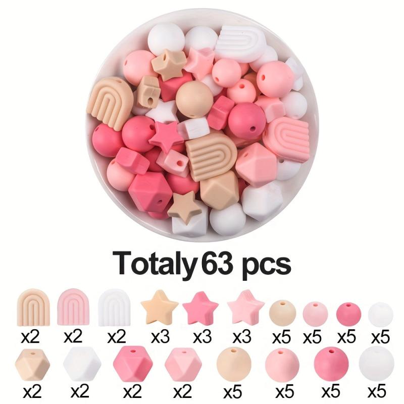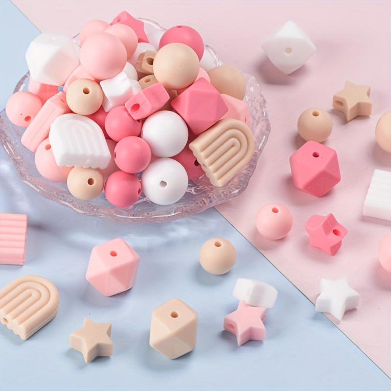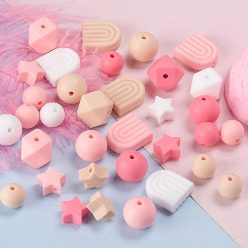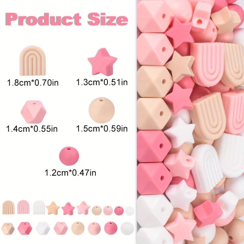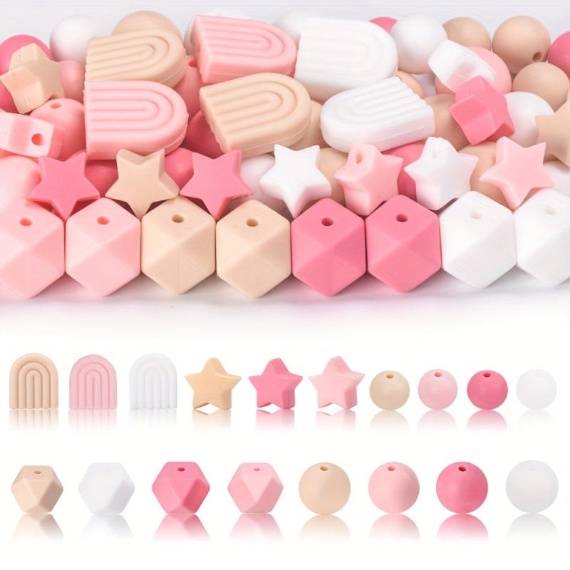 Create beautiful jewelry with this 63-piece set of pink silicone beads in various shapes like star, arch, circle, hexagon, and focal spacers. Perfect for DIY projects!