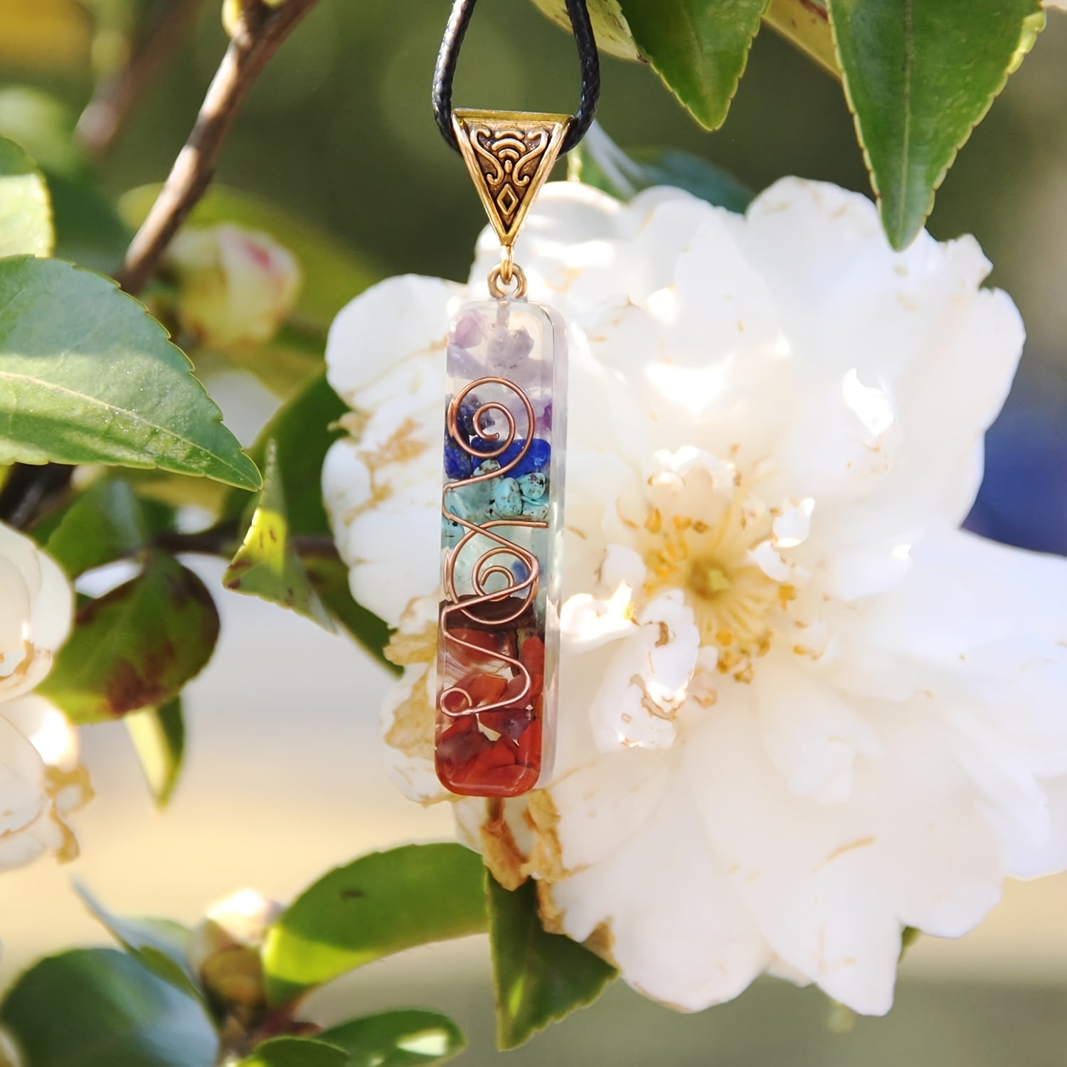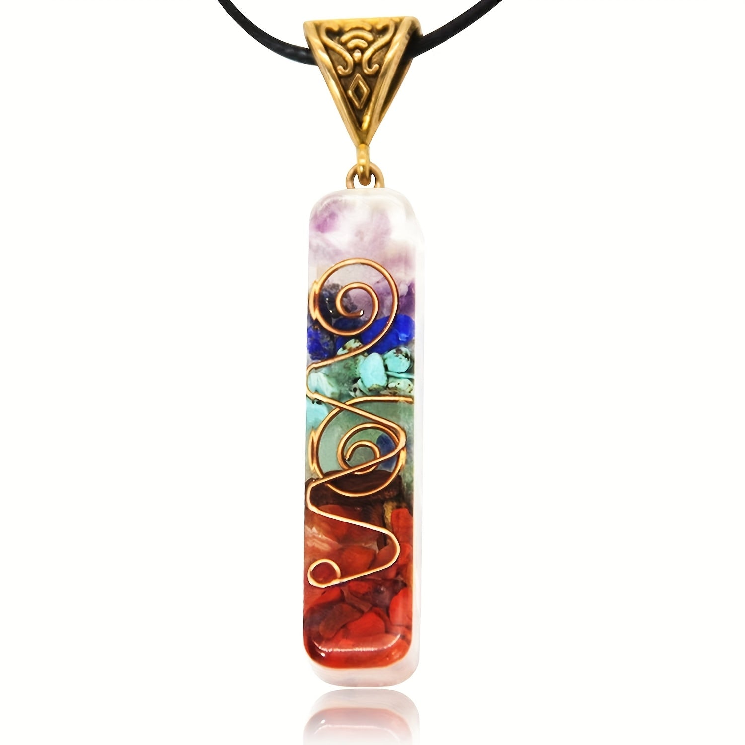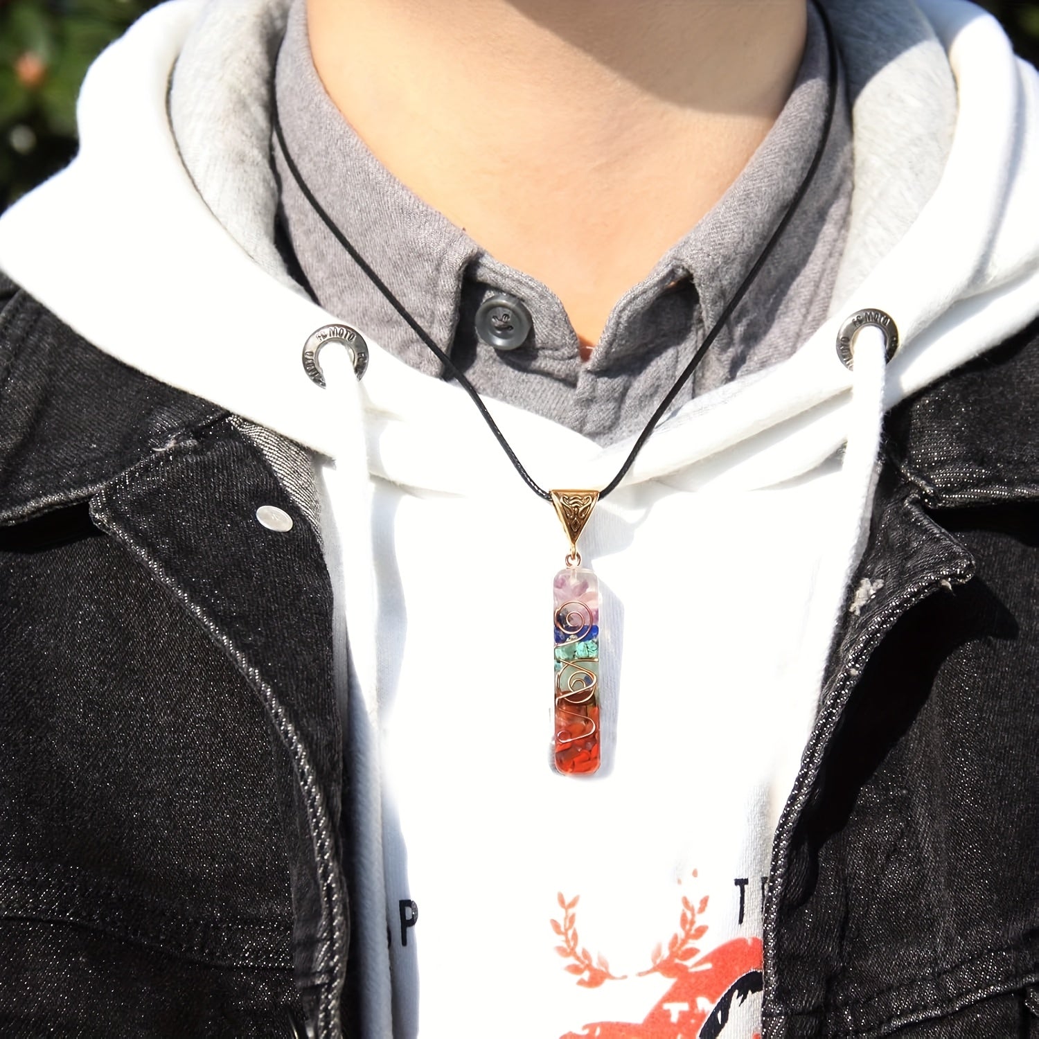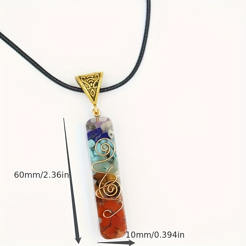 Embrace the energy of the 7 chakras with this colorful gravel pendant necklace on an adjustable leather cord.