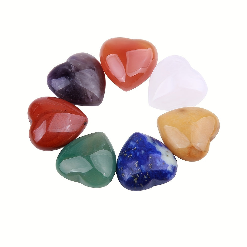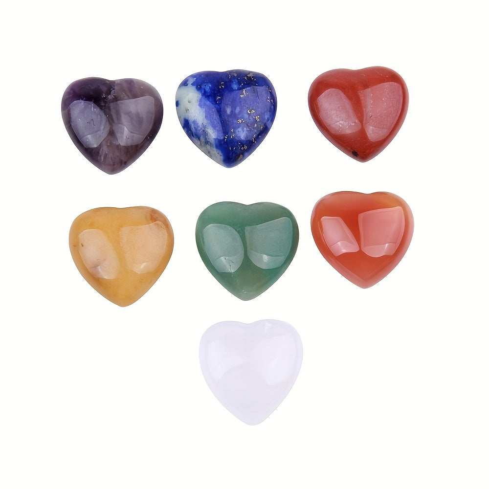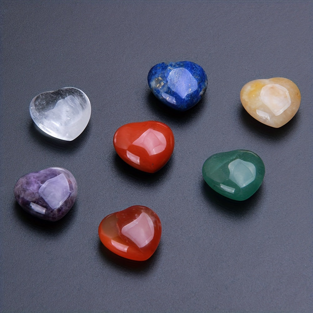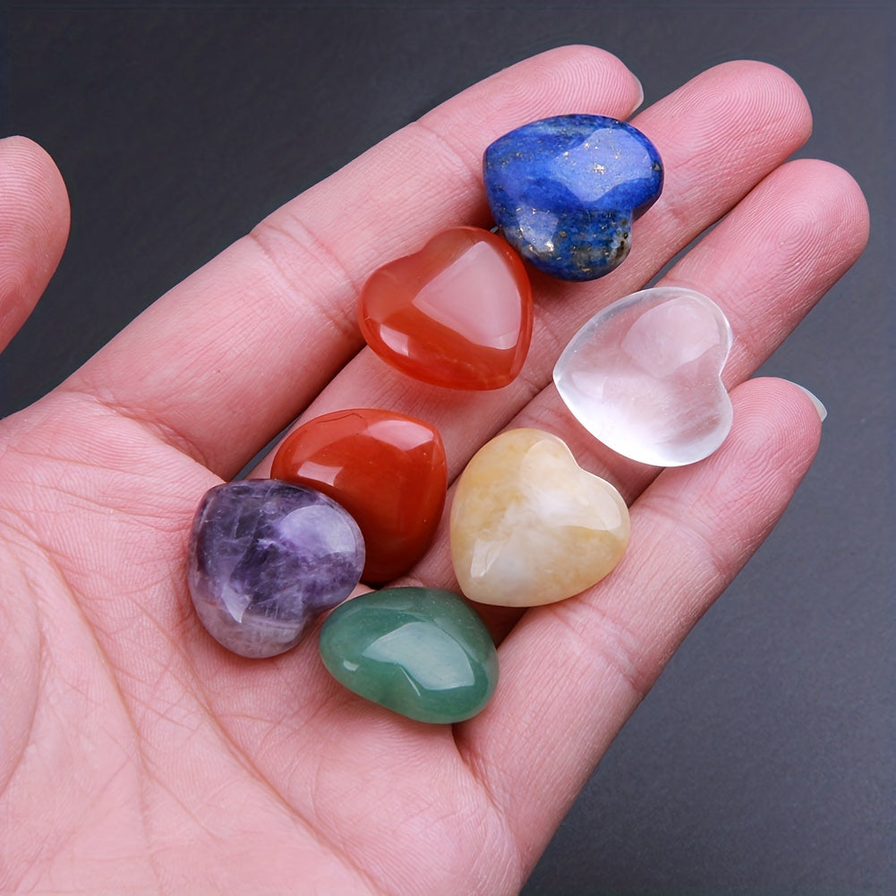 Enhance your energy balance with this set of 7 heart-shaped chakra crystals. Made of lapis, amethyst, and more, perfect for meditation and healing.