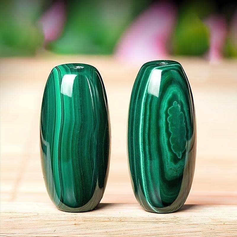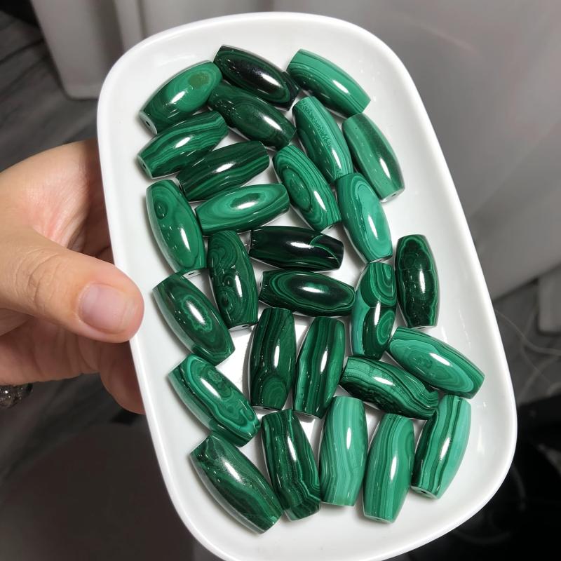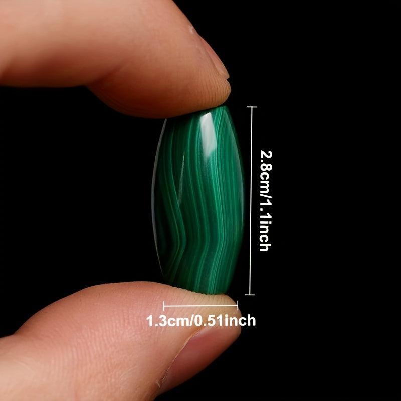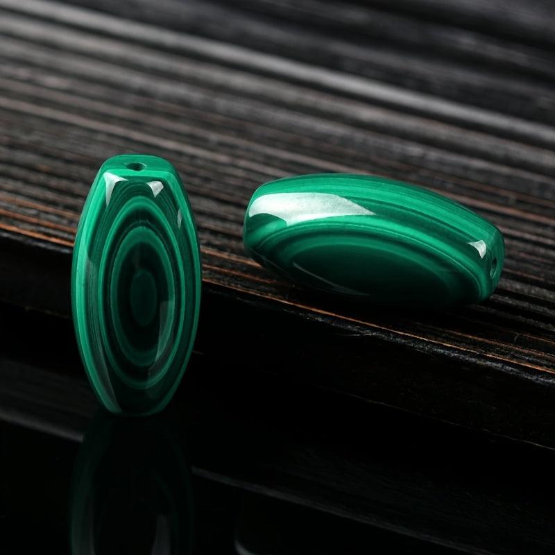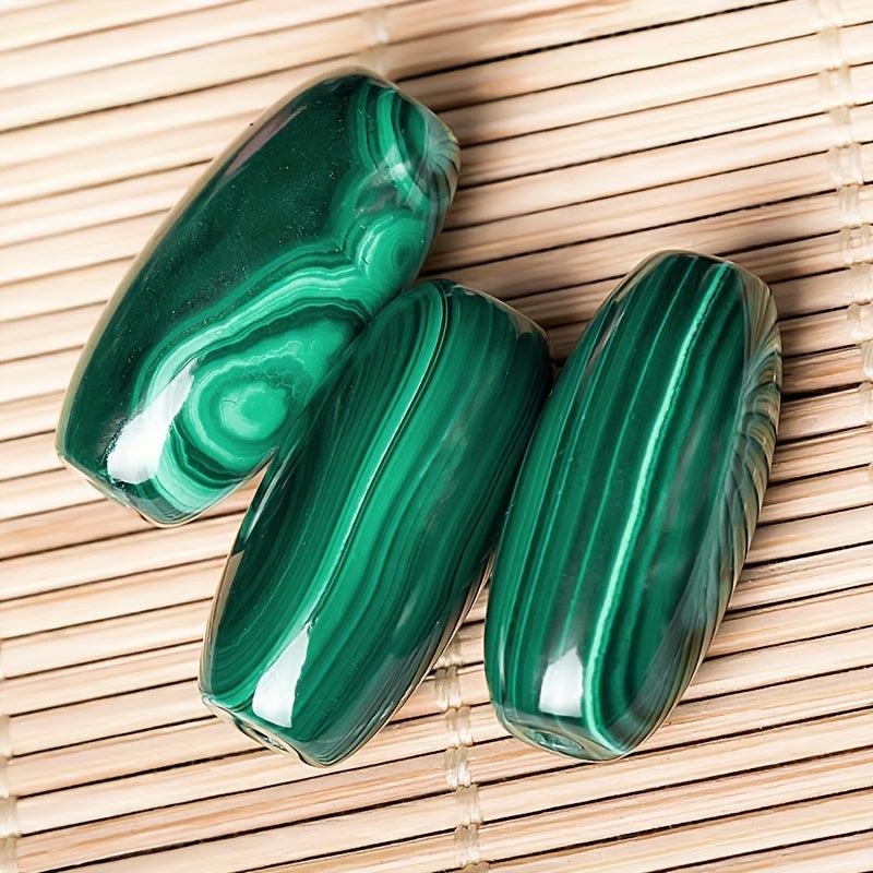 Unique natural malachite raw stone pendant featuring barrel bead shape with green and geometric patterns, perfect for bohemian style DIY jewelry making supplies and a thoughtful gift idea.