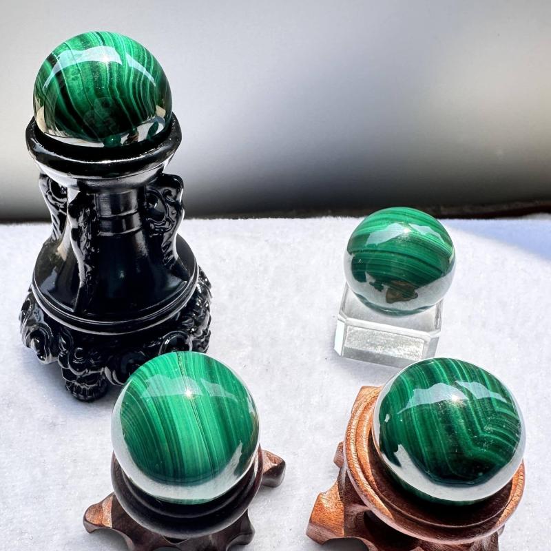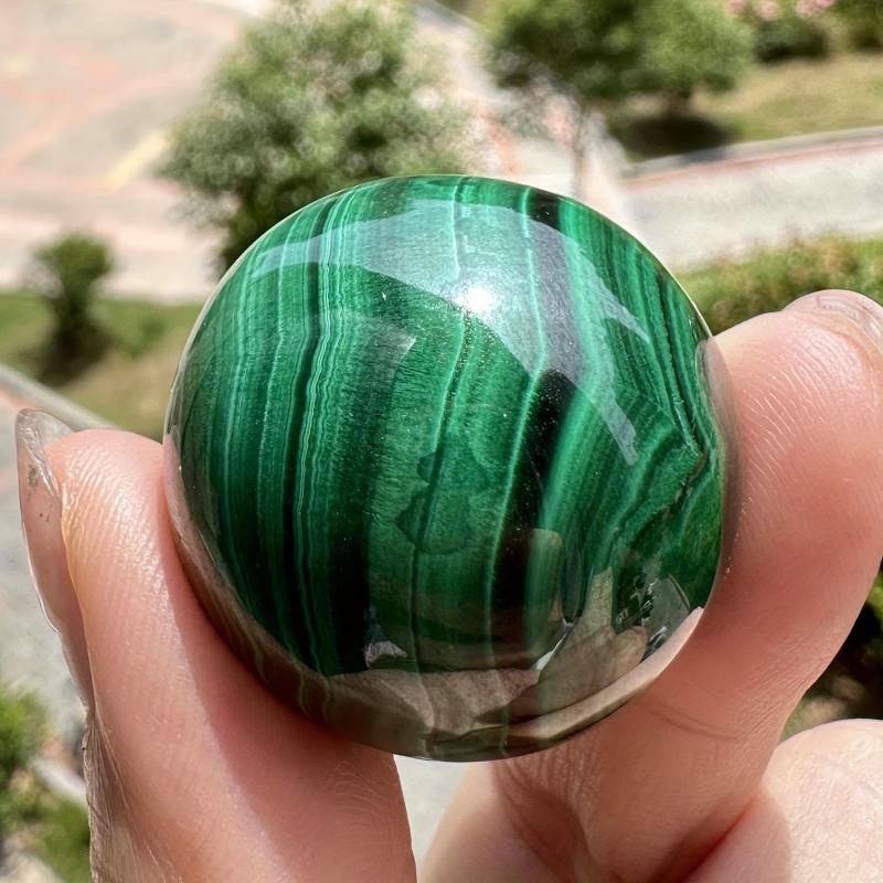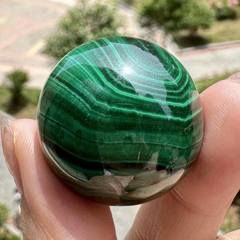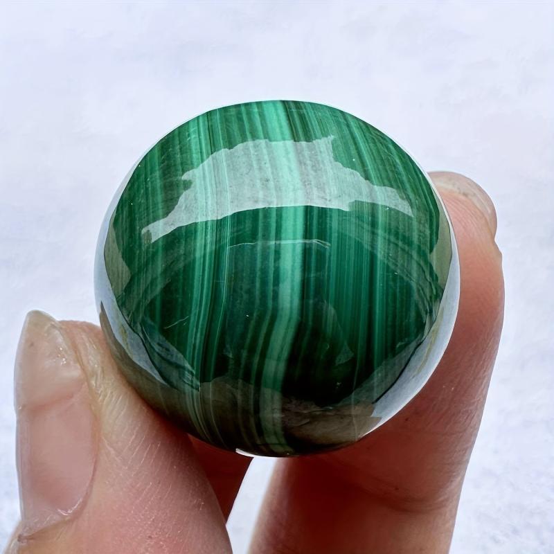 This natural malachite sphere is a powerful green gemstone ball that emanates protective energy. It is perfect for heart chakra healing and spiritual growth.