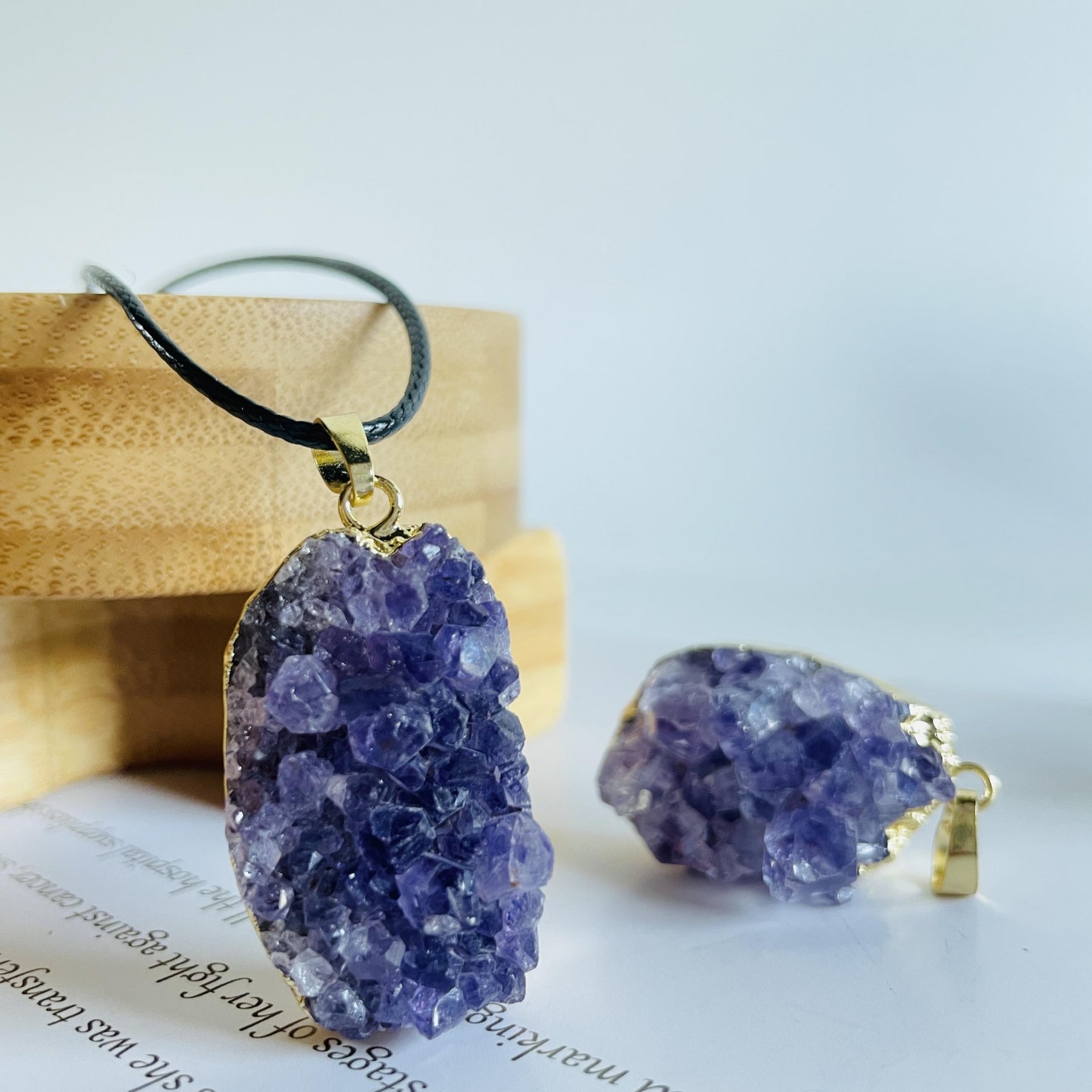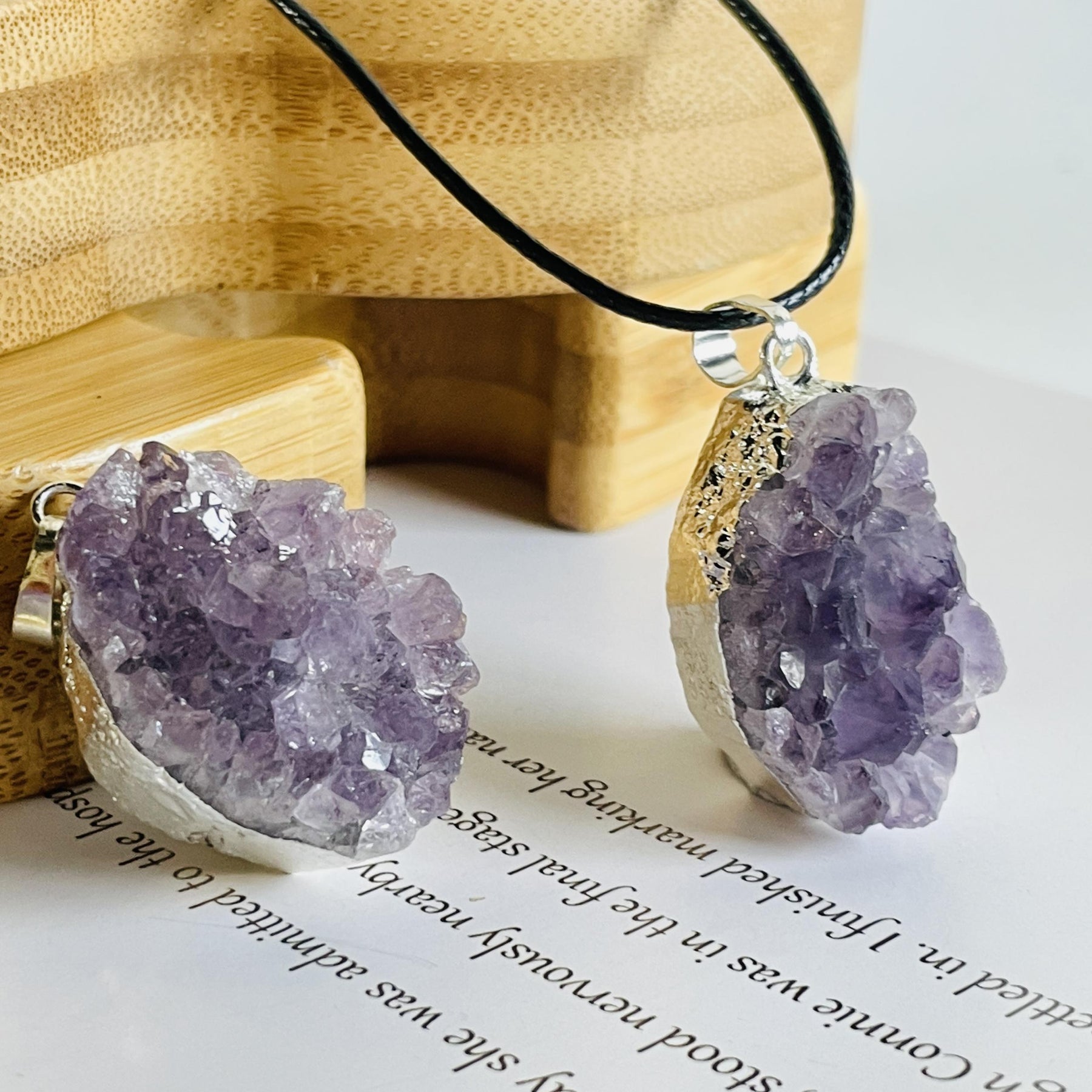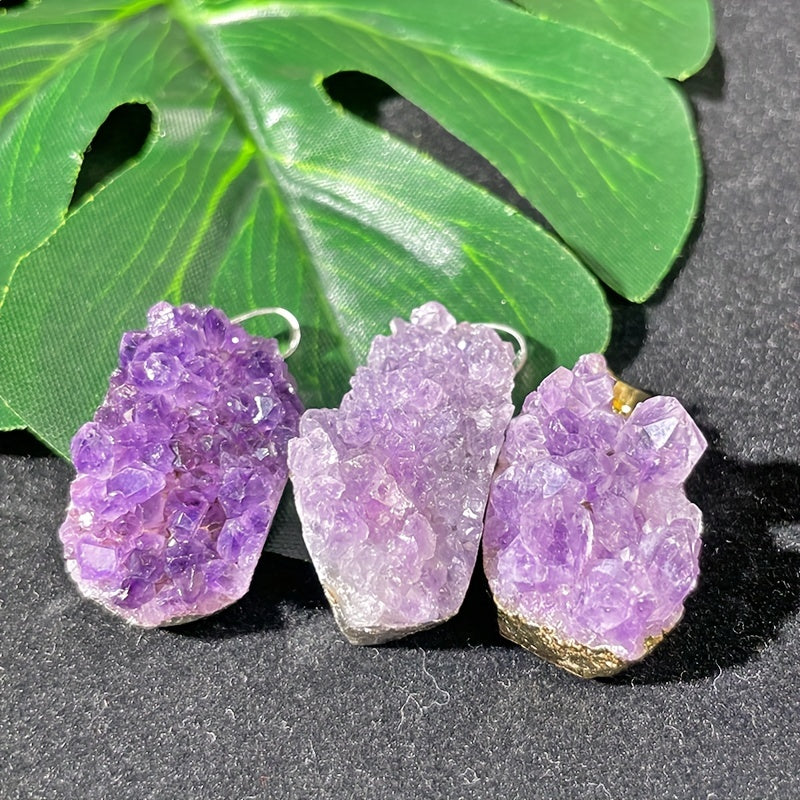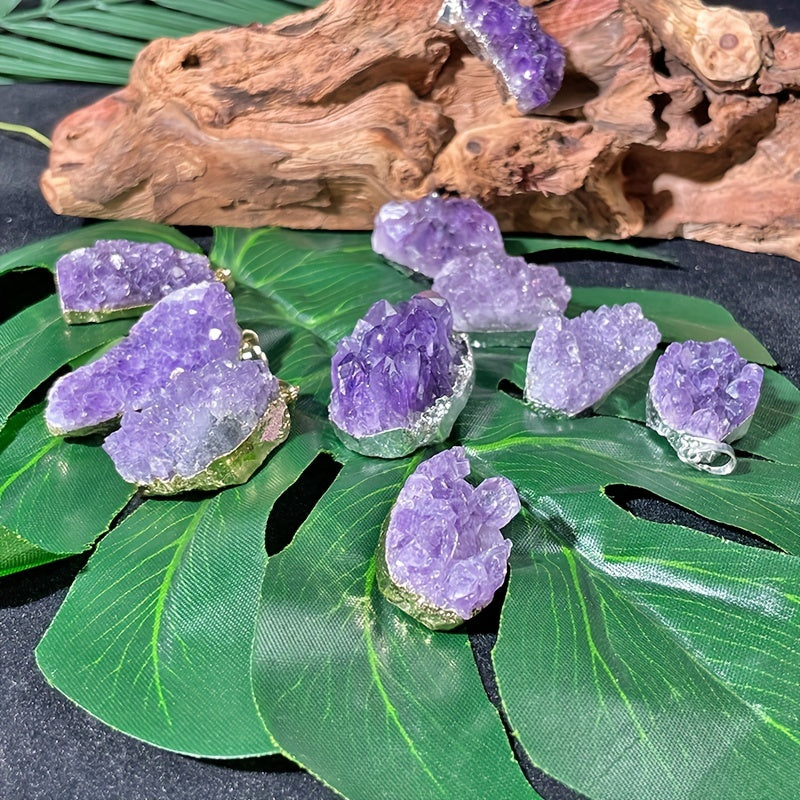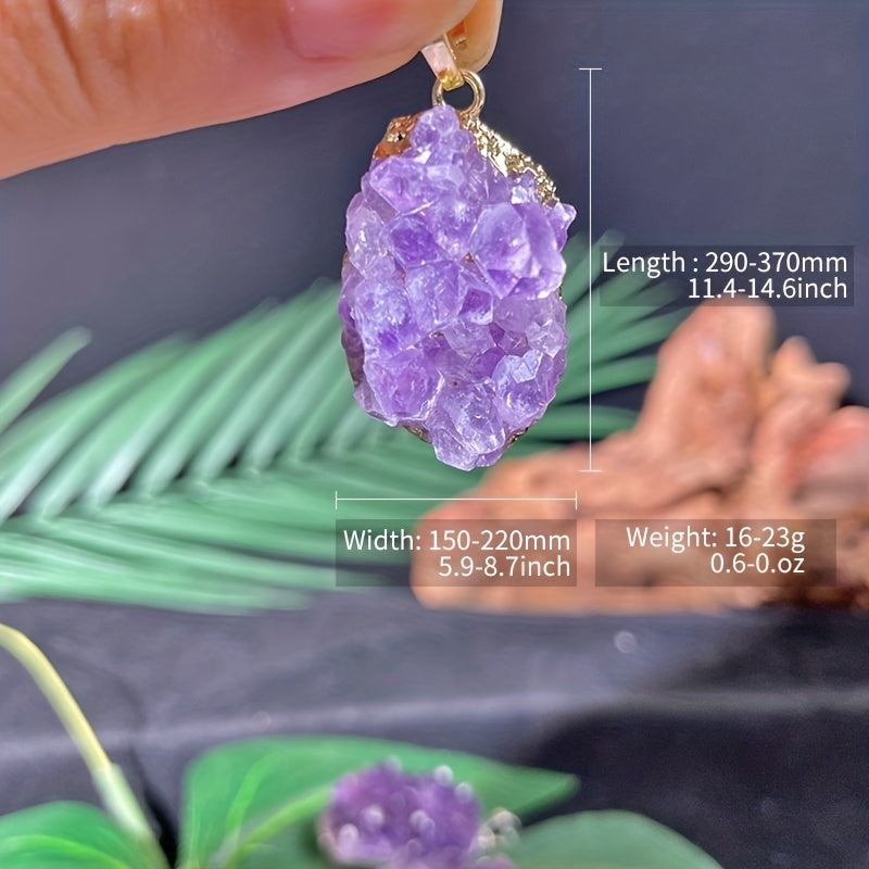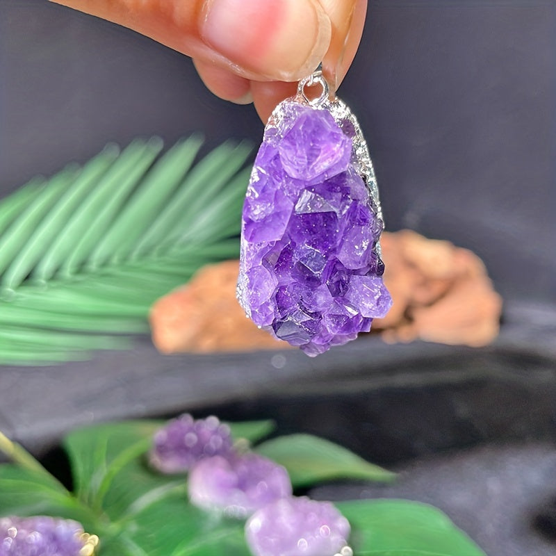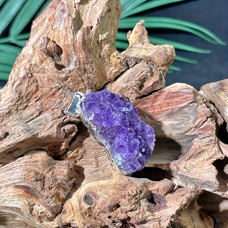 This pendant features a natural Amethyst crystal cluster, perfect for men and women. Each piece is unique and showcases the raw beauty of the quartz stone.