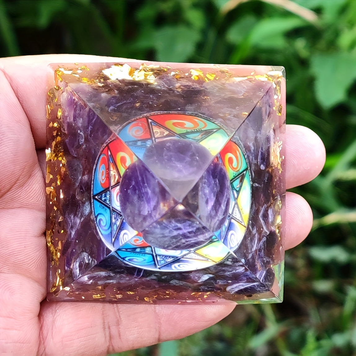 Enhance your space with this powerful Orgone Pyramid made with Amethyst, Peridot, and other healing crystals. Ideal for meditation, energy balancing, and home decor.