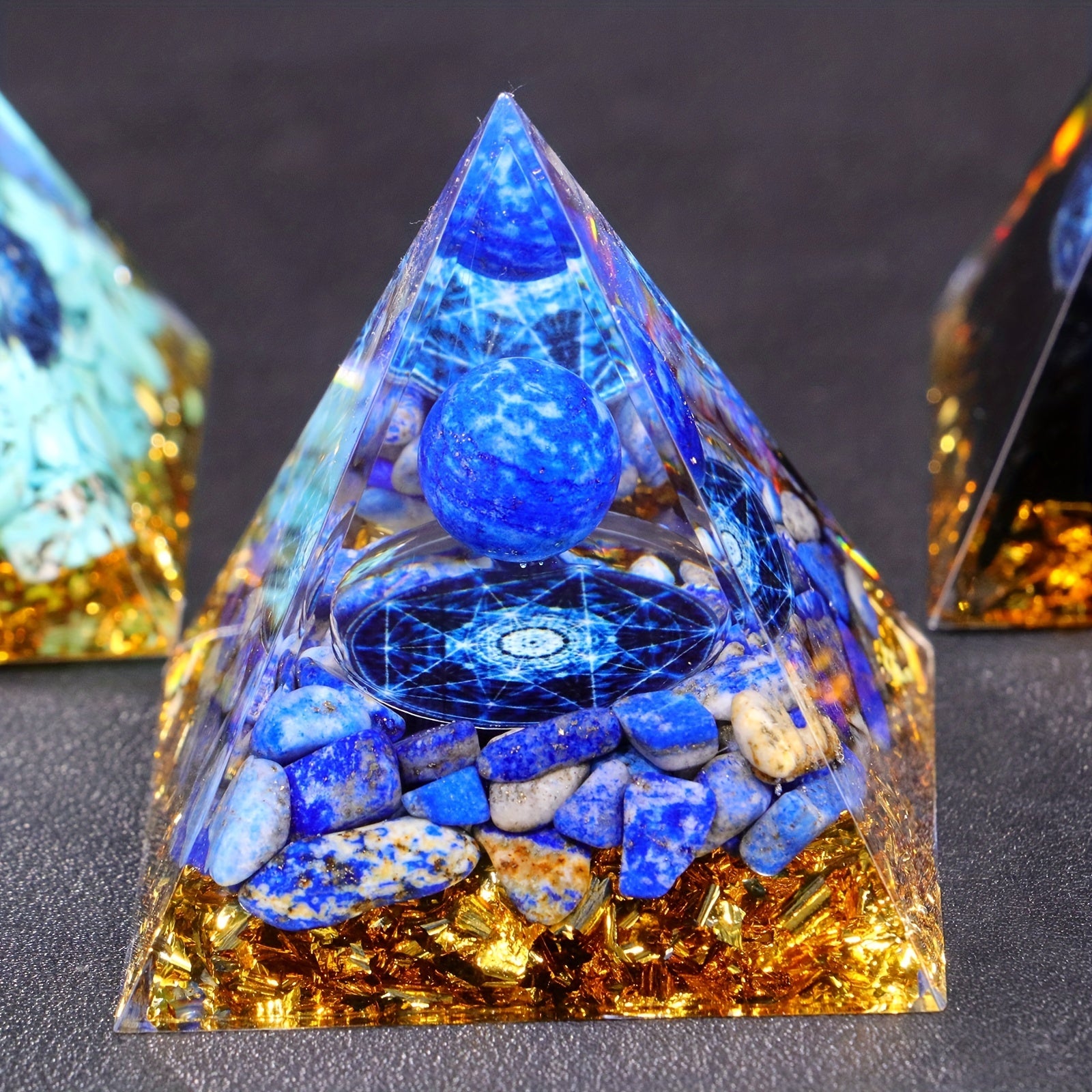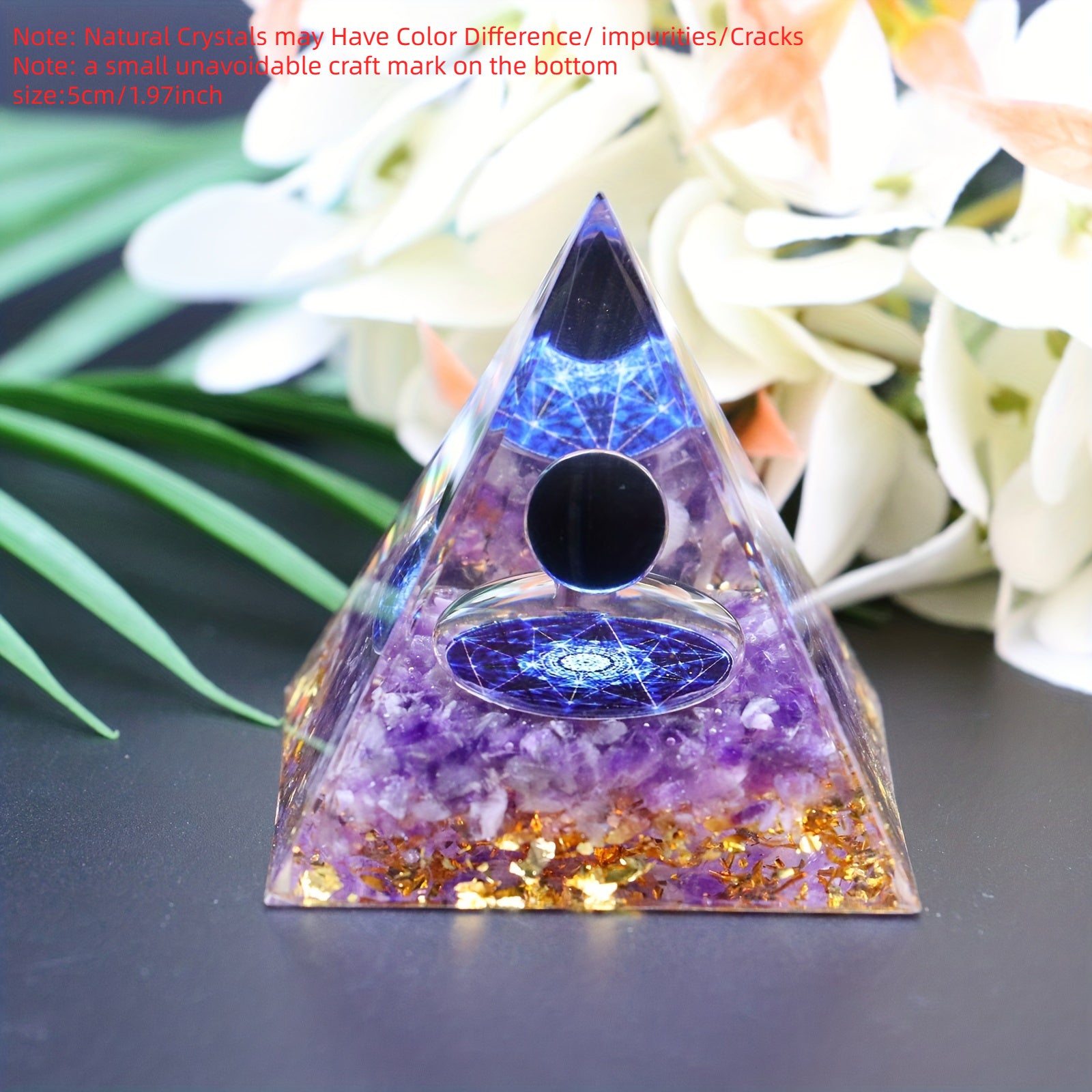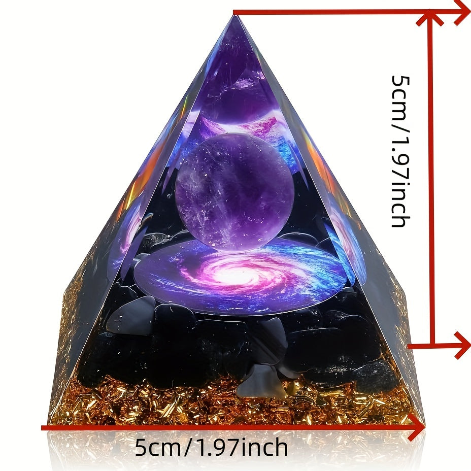 Experience positive energy with this orgone pyramid featuring amethyst crystal ball. The pyramid has a glue injection port for a seamless design.