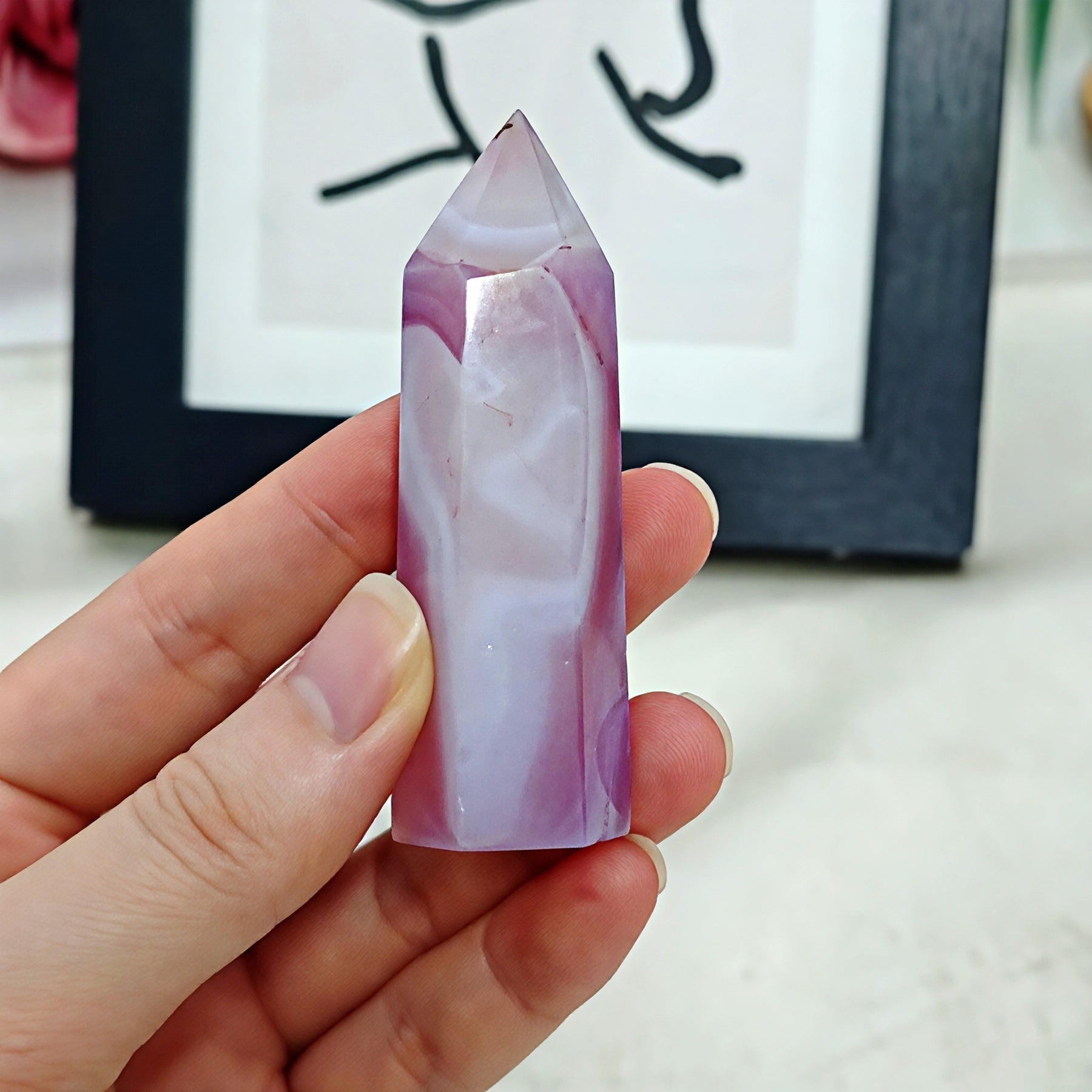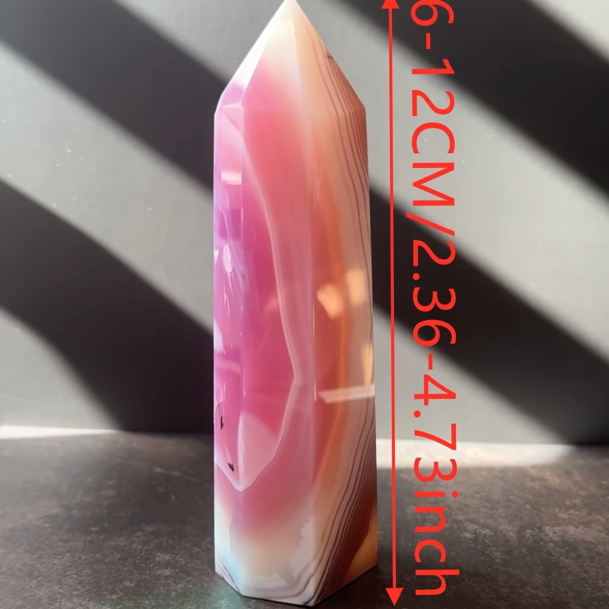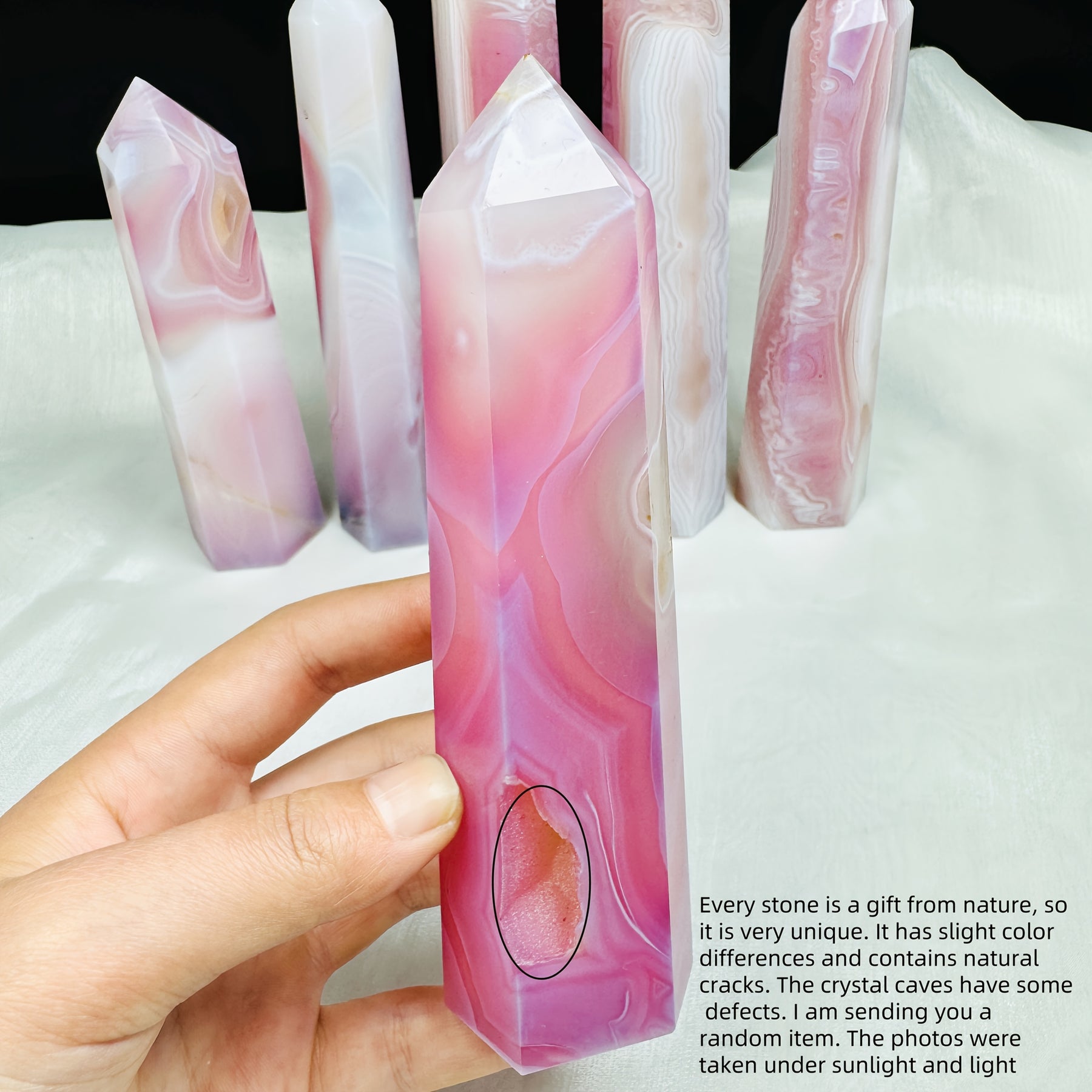 This Pink Agate Tower features marbled patterns and unique irregular cracks, making it a high-end collectible piece for any crystal enthusiast.