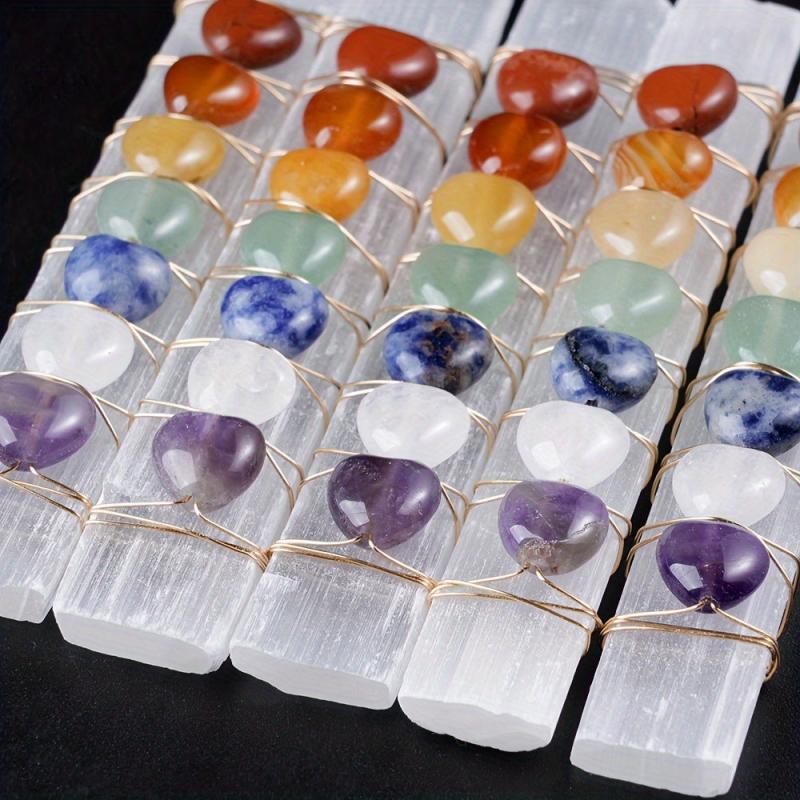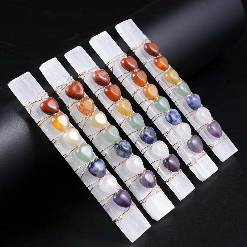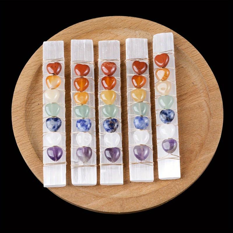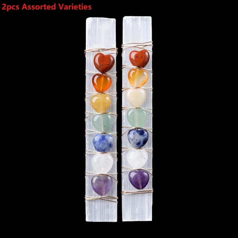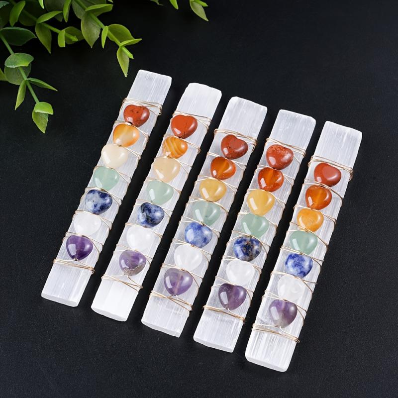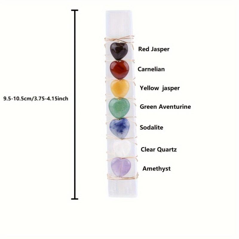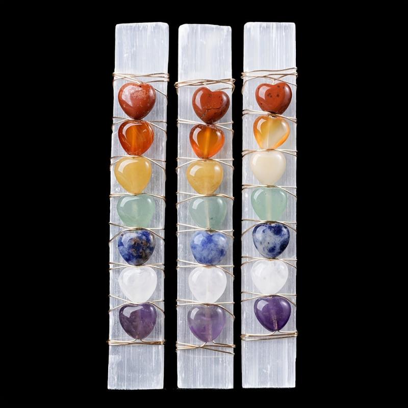 • Includes selenite crystal sticks with seven chakra heart crystals