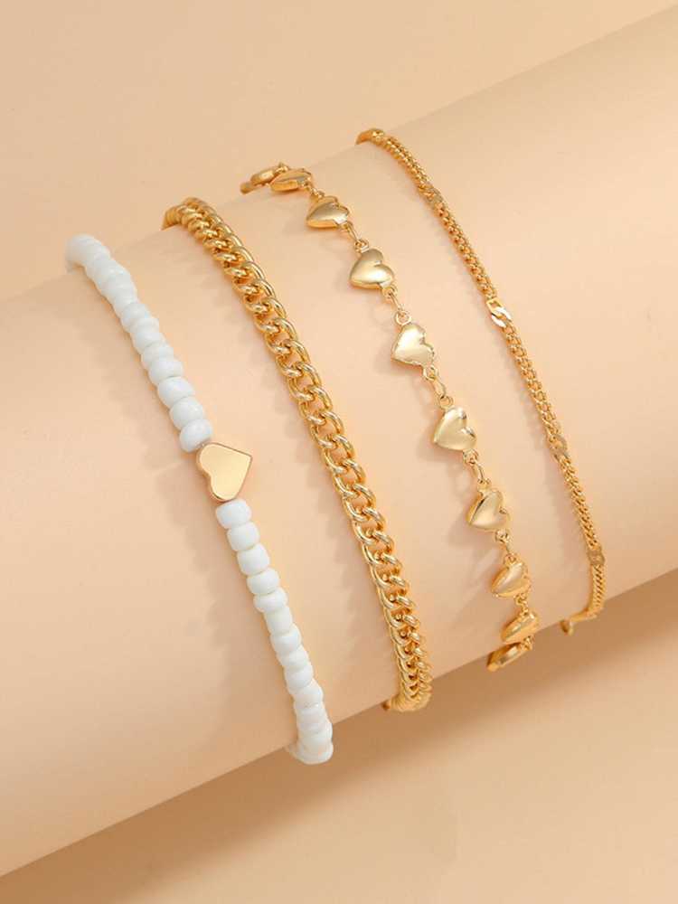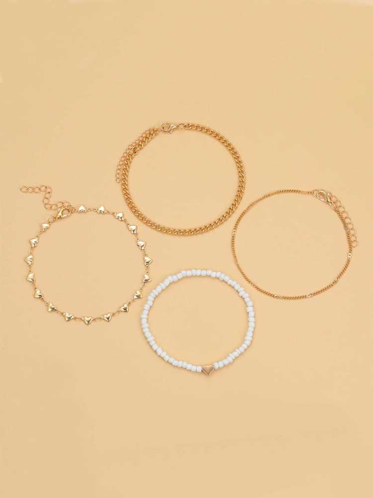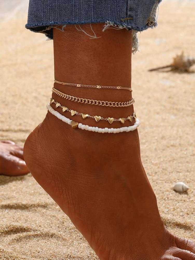 Women's Multi Strand Boho Beaded Anklet With Heart Link Chains