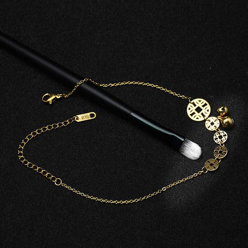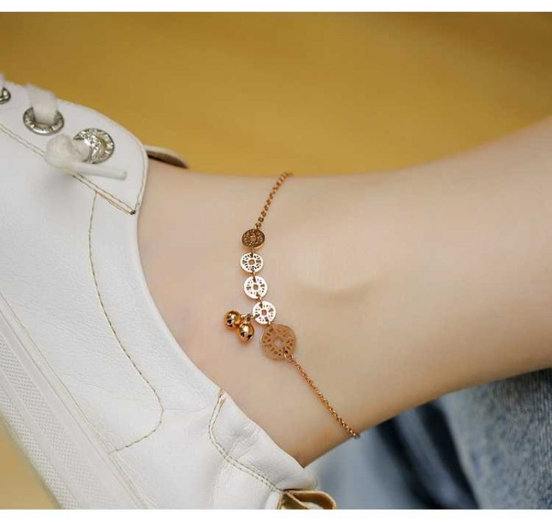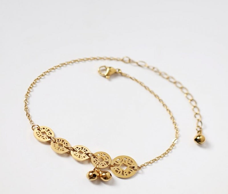 - Product Particulars: The anklet is crafted from gold plated stainless steel metal, tiny bells that dangle delicately from the chain. At the center of the anklet is a filigree coins and equipped with a lobster claw closure.
