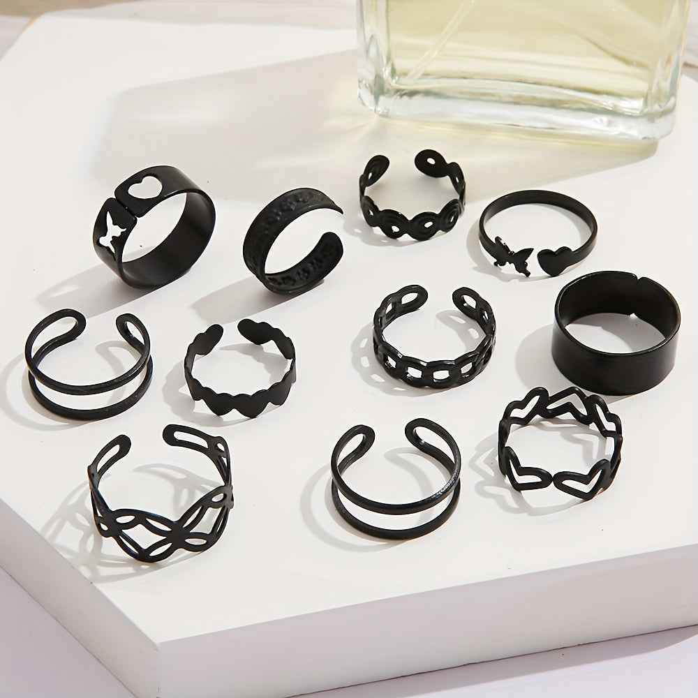 Add a touch of charm to your outfit with this 11-piece ring set featuring butterfly, heart, and geometric designs. Perfect for casual wear or vacation vibes.