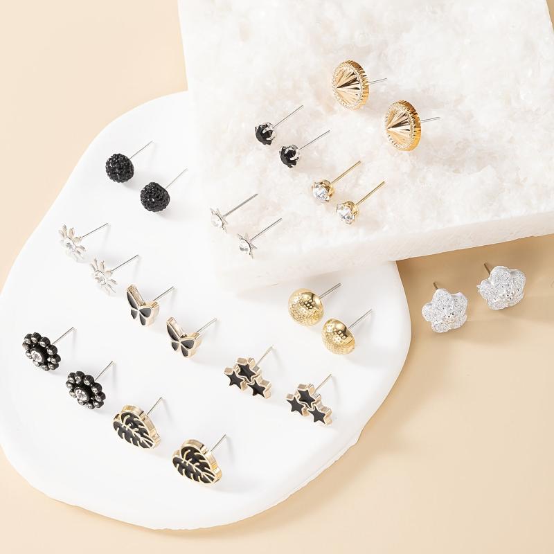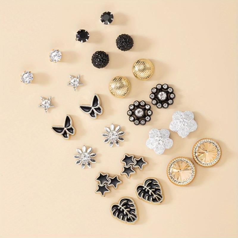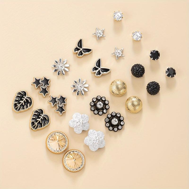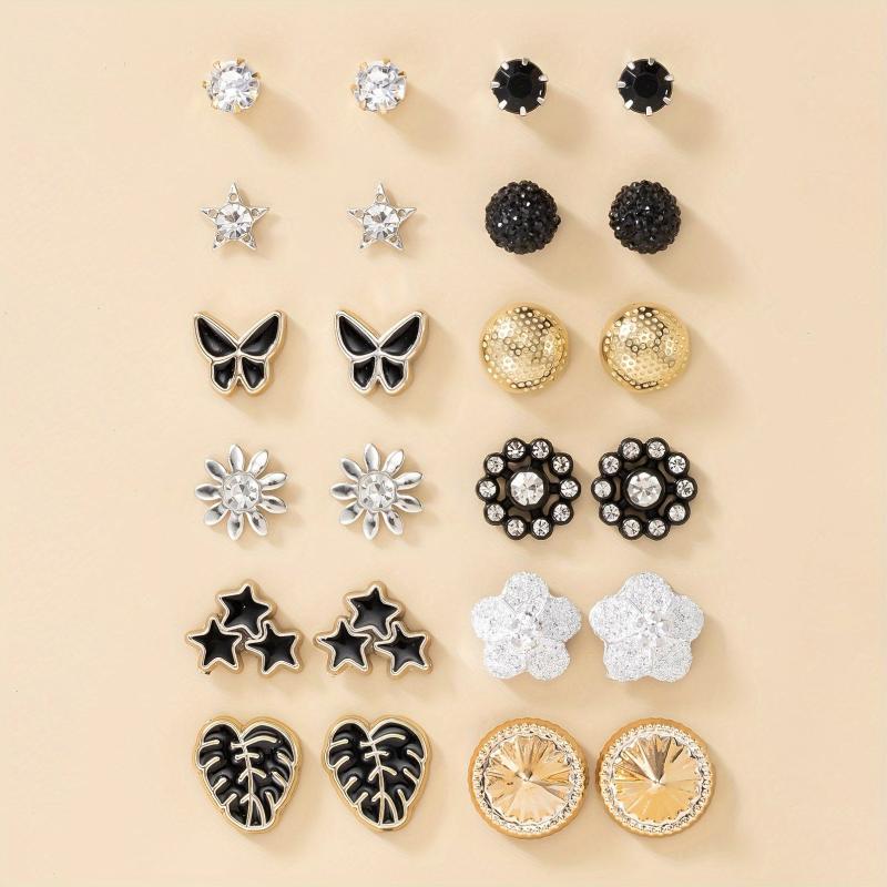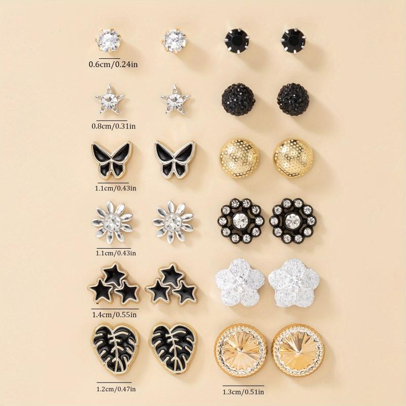 Elevate your holiday and daily wear with this set of 12 unique earrings featuring flowers, butterflies, leaves, rhinestones, and stars.