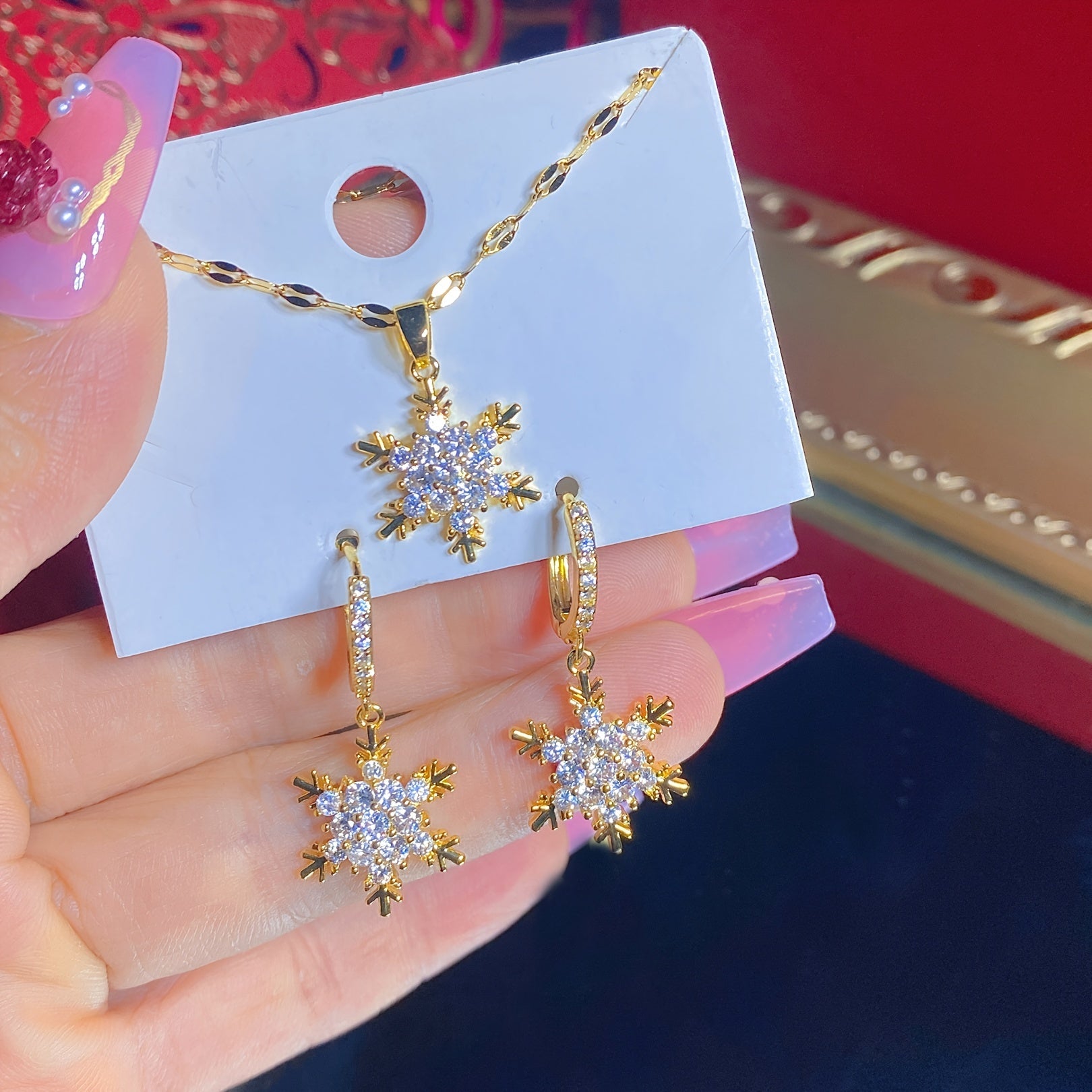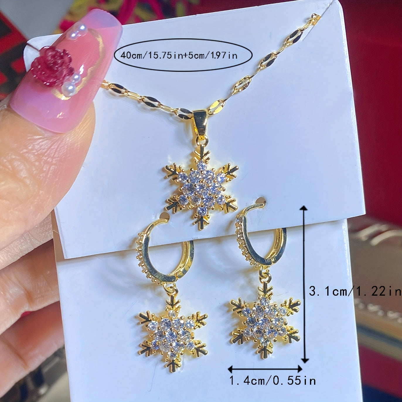 14K Gold Plated Snowflake Jewelry Set with Zirconia Necklace and Earrings