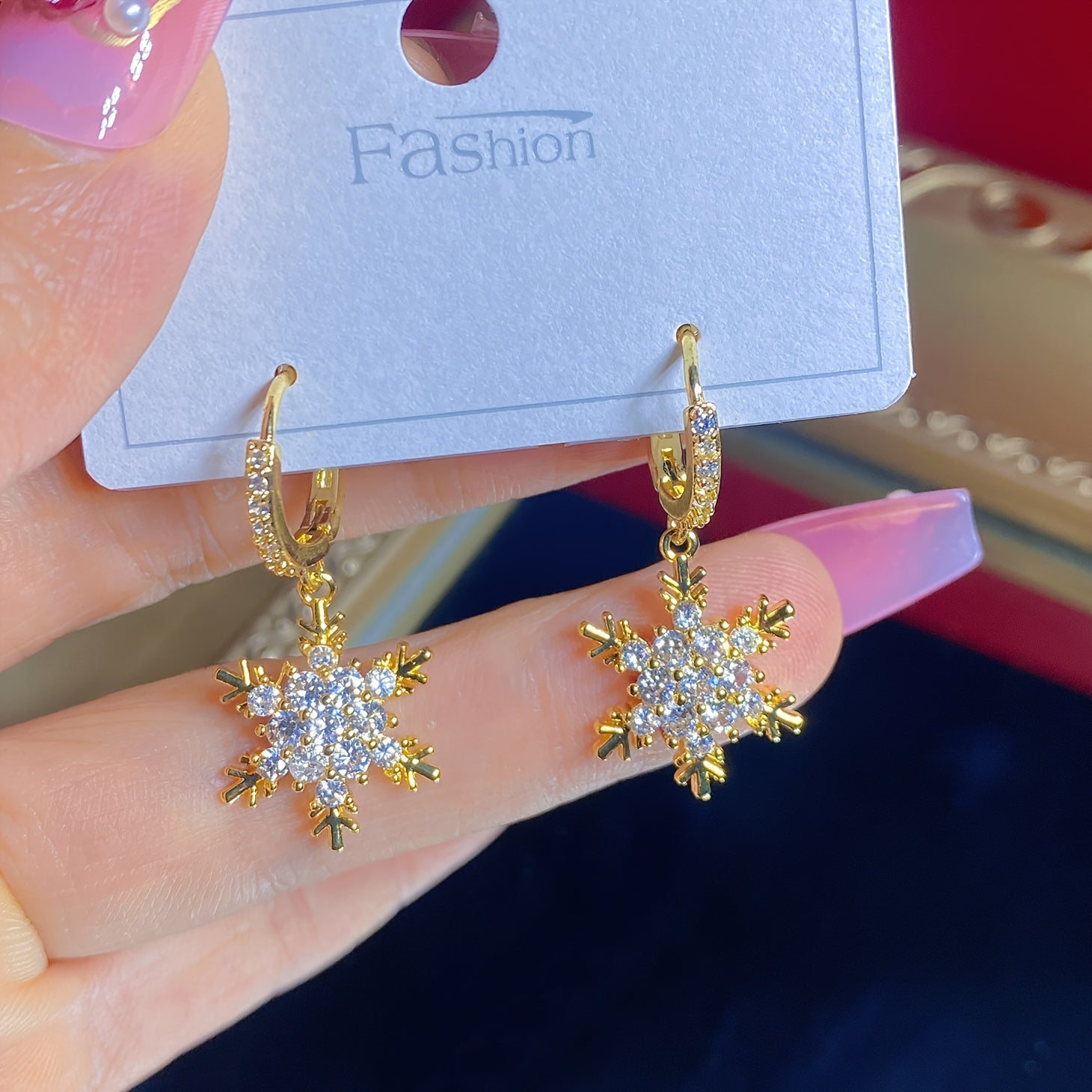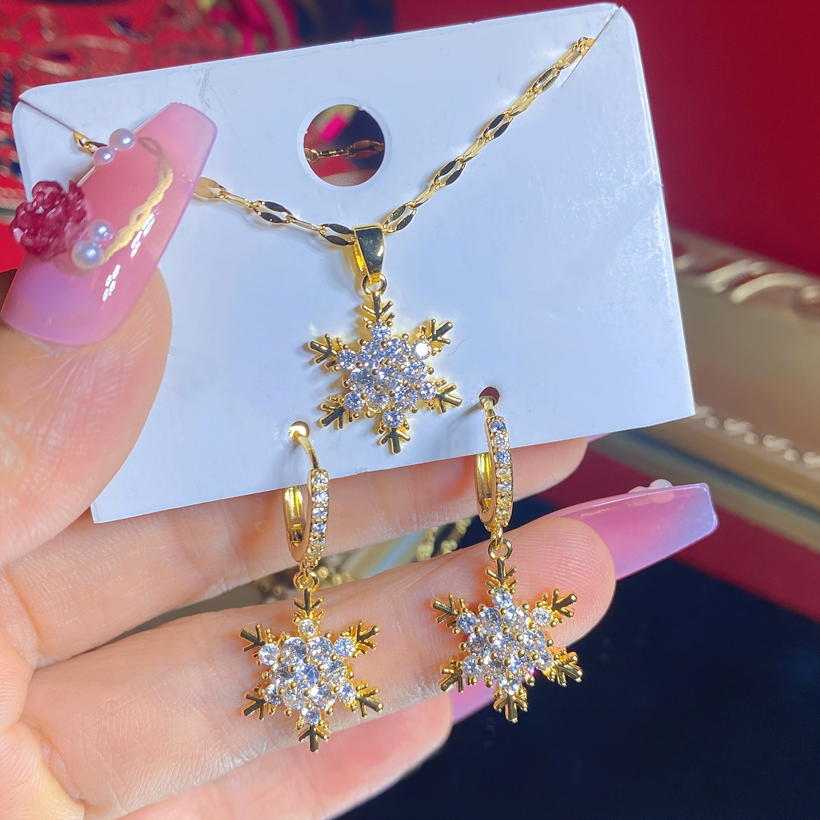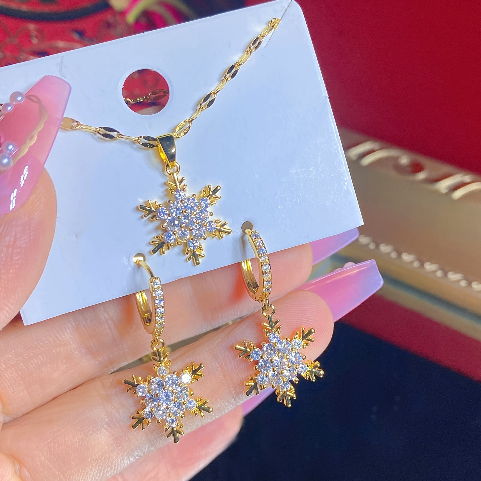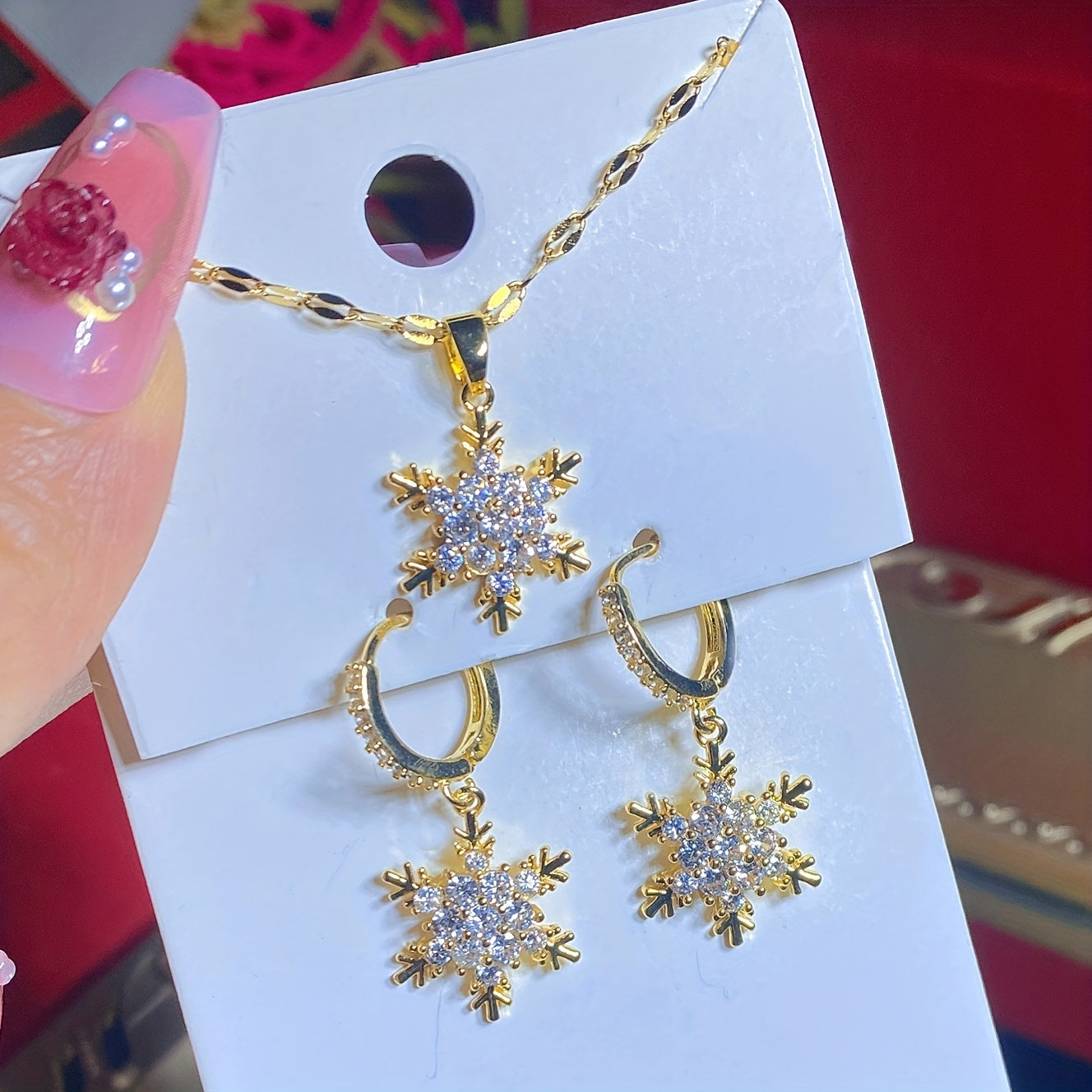 Elegant and classic snowflake design jewelry set with synthetic zirconia gemstones, perfect for daily wear or as a gift for women. Made from copper base material with 14K gold plating.