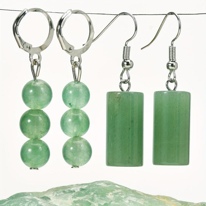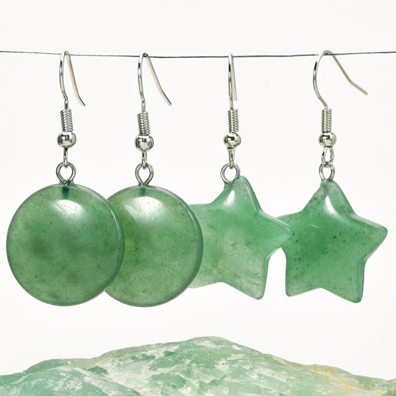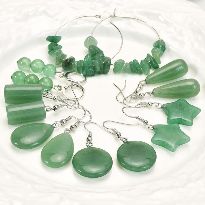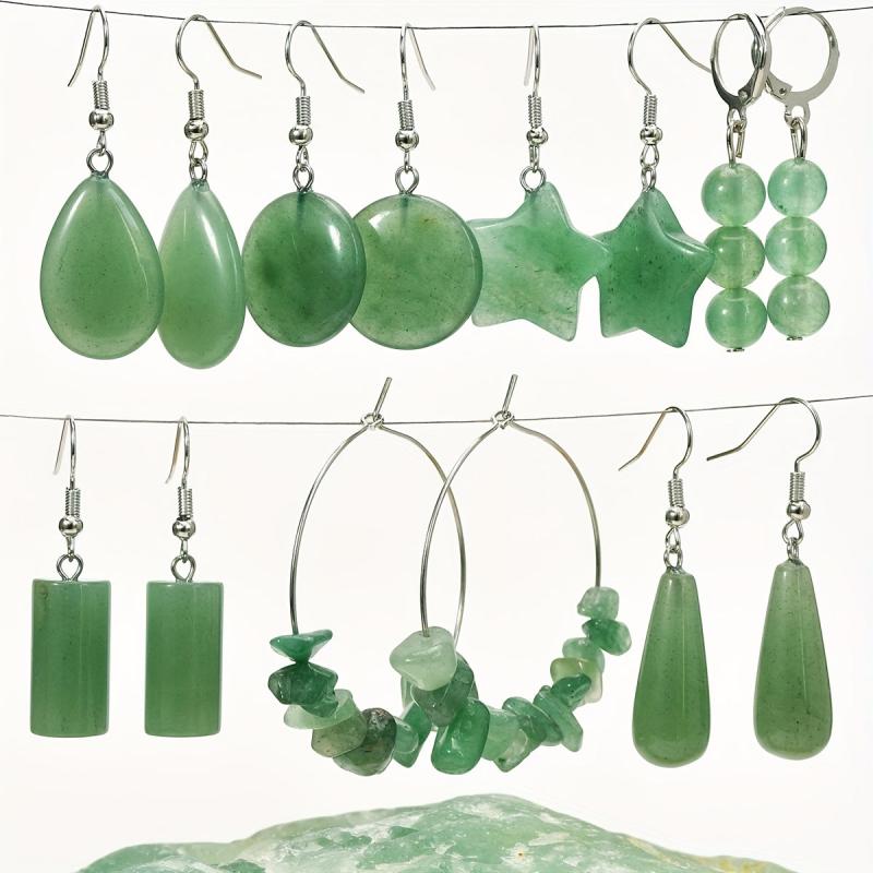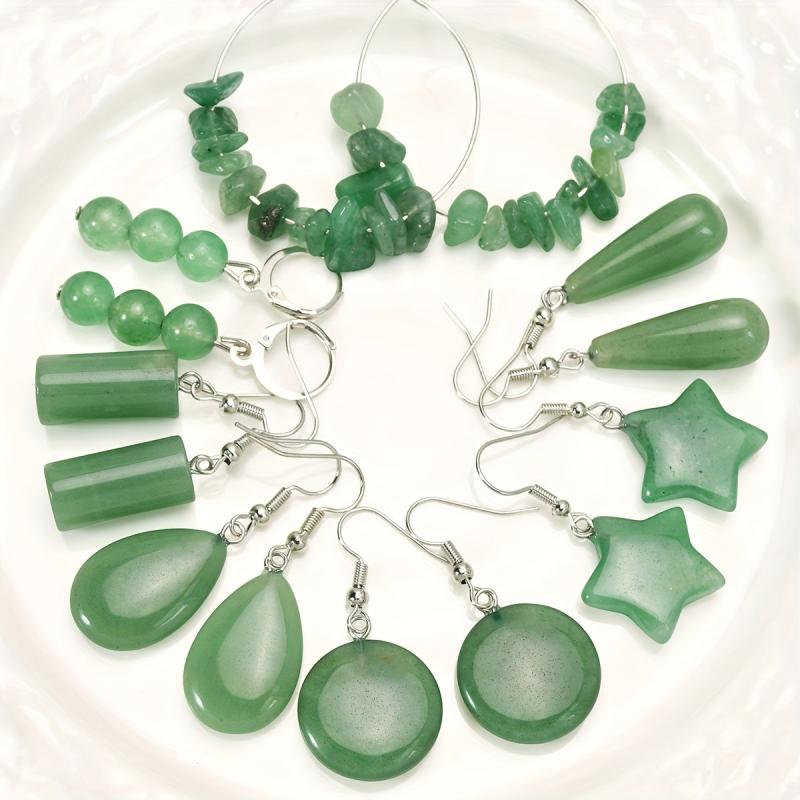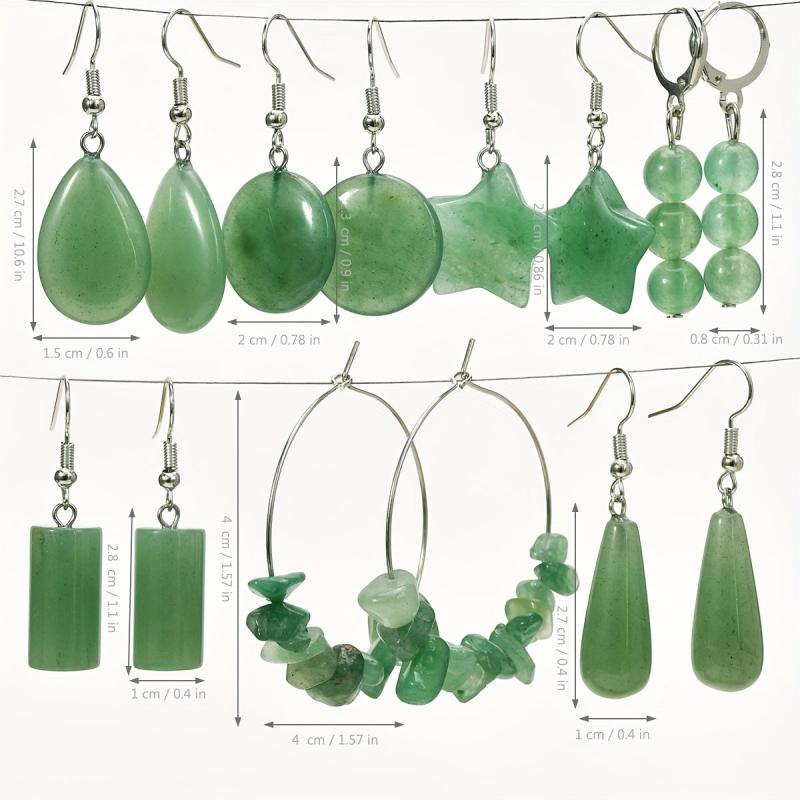 Elevate your summer look with this 14-piece set of green aventurine stone earrings. Perfect for gifting, each pair features a unique bohemian style with random light to dark stone colors.