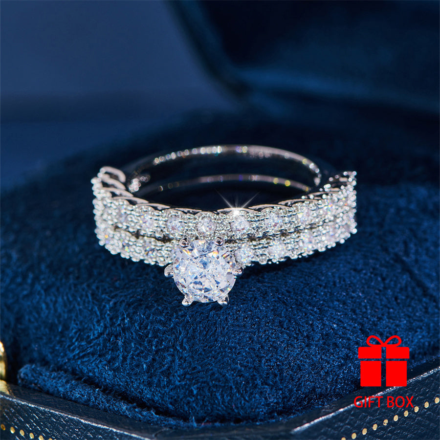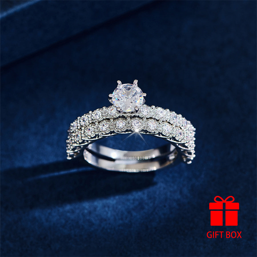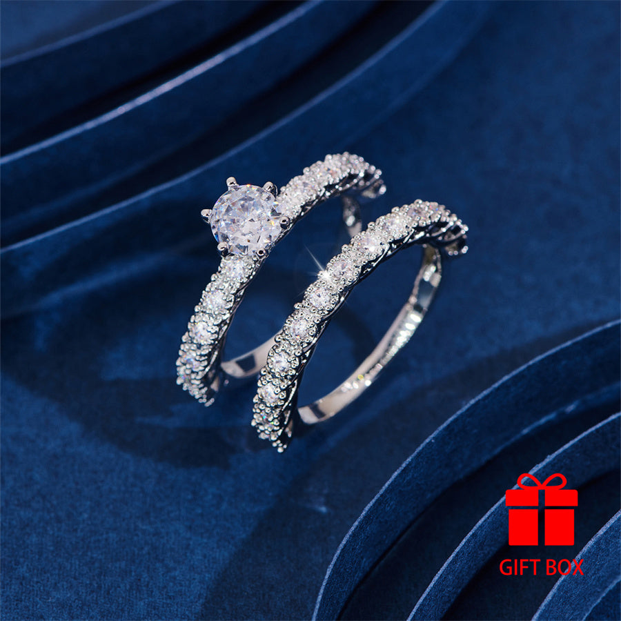 2pcs Sparkling Round Cut Zirconia Silvery Rings Set Wedding Party Accessories