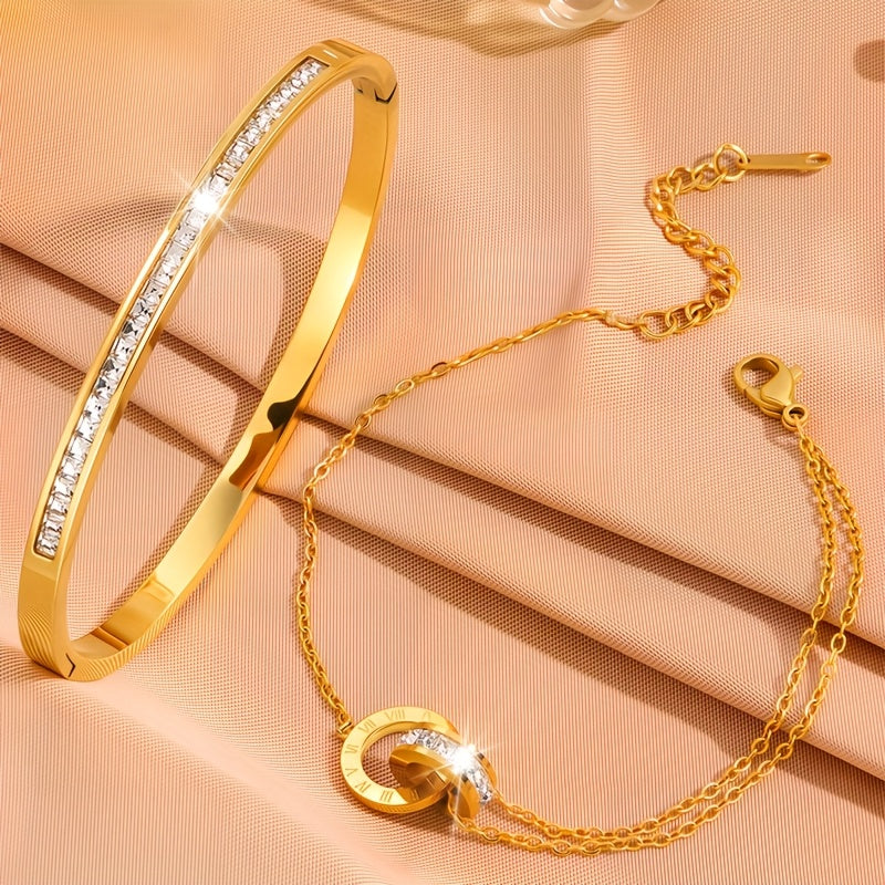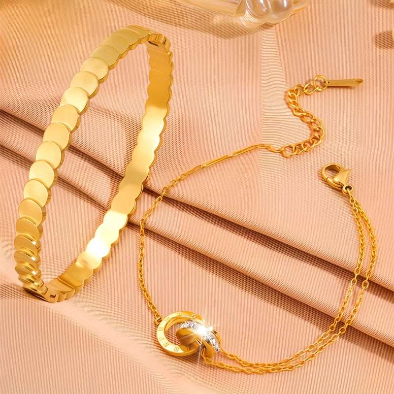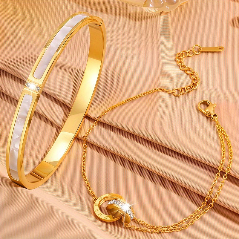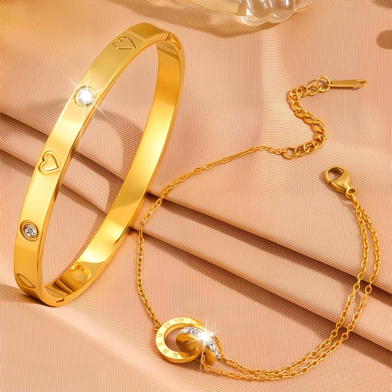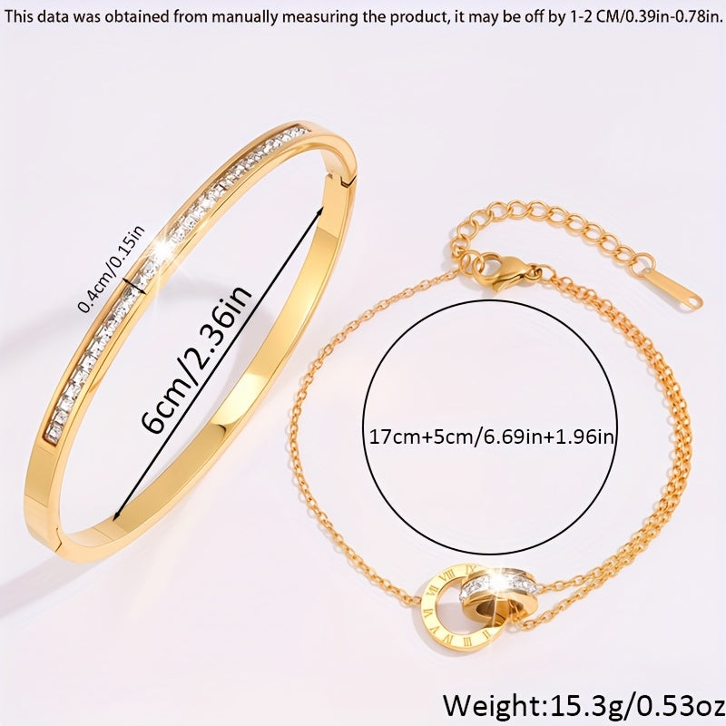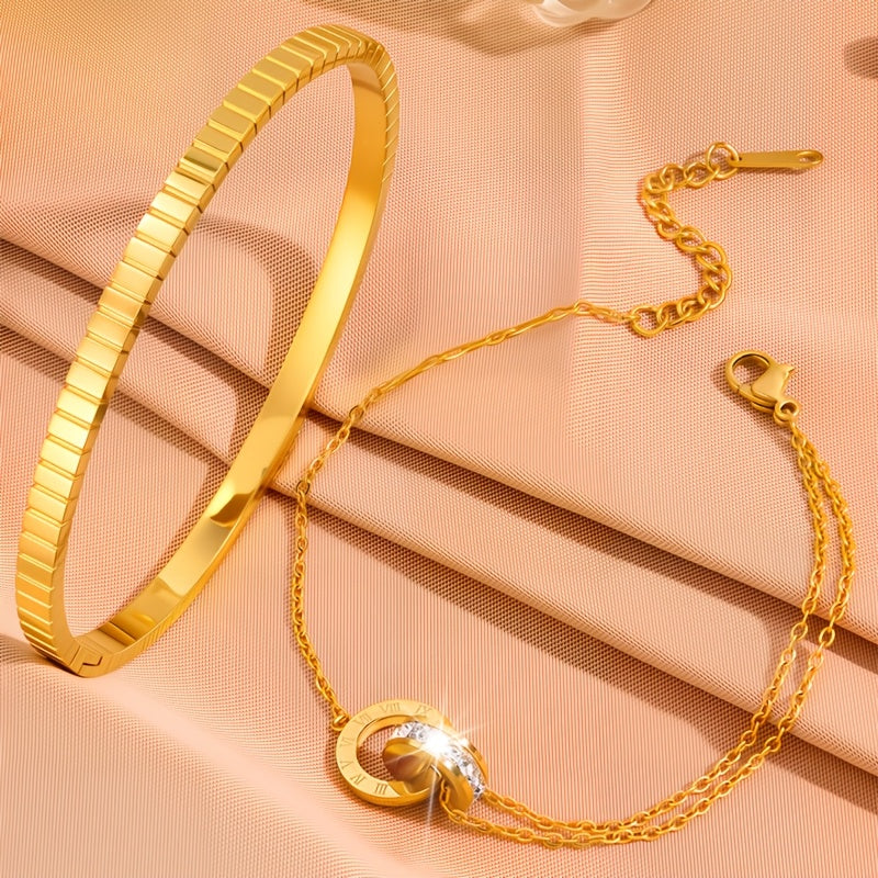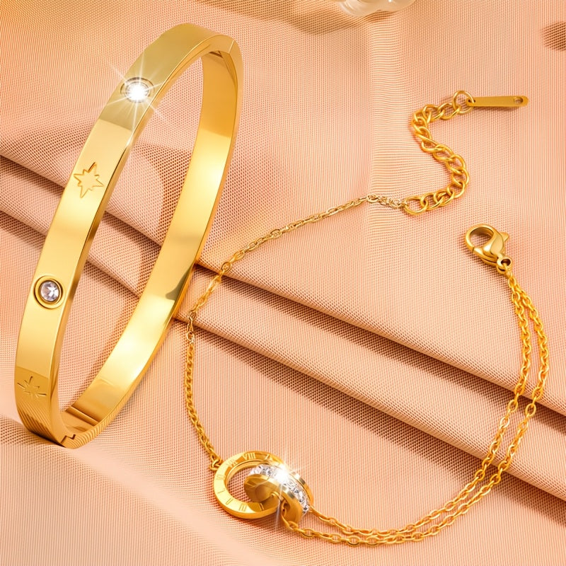 This bracelet set is made of stainless steel, perfect for daily wear or giving as a festive gift. It adds a touch of elegance to any outfit.