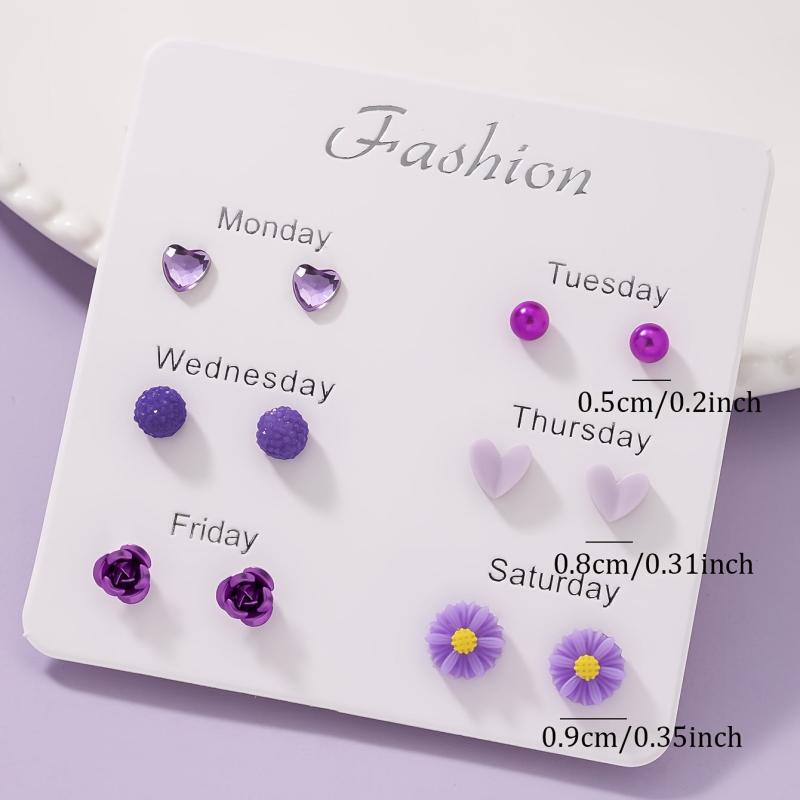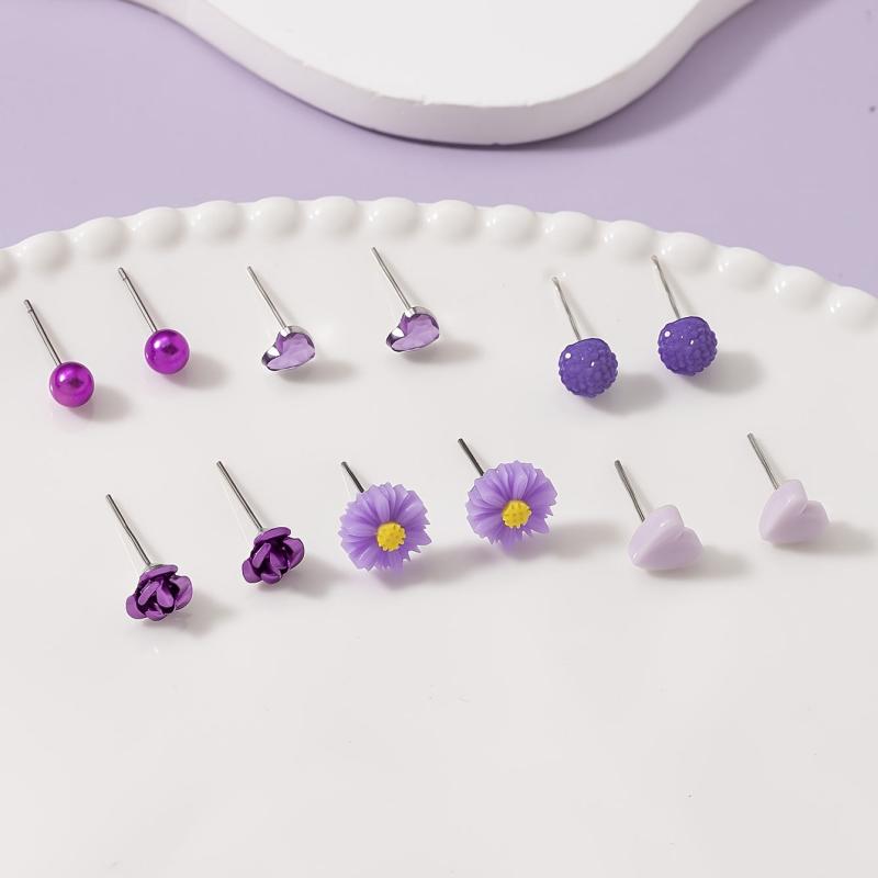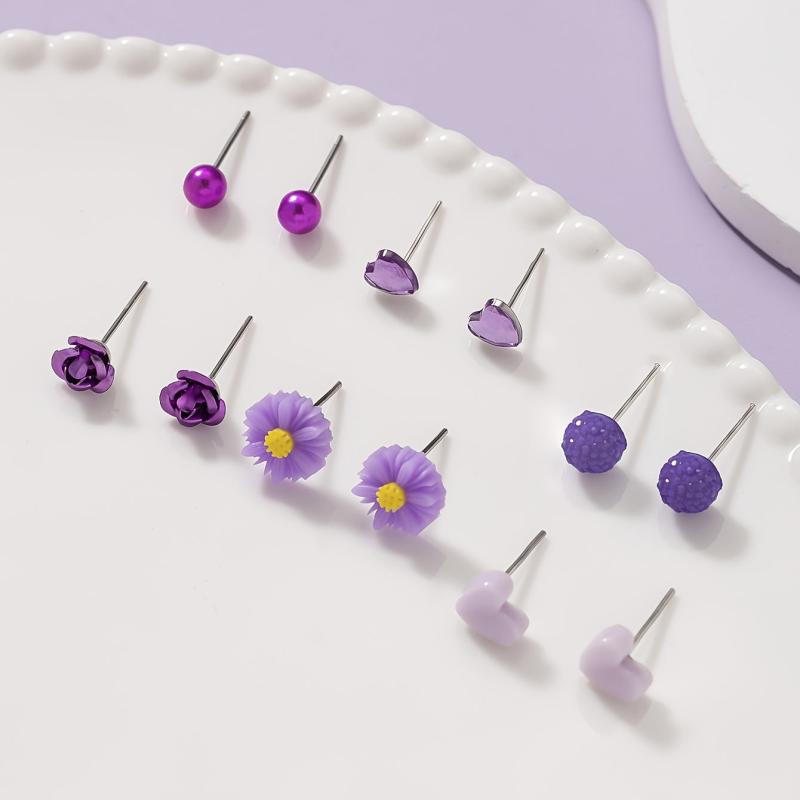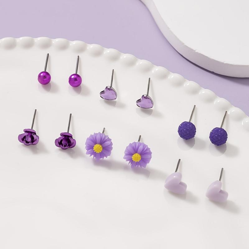 This set includes 6 pairs of earrings featuring floral and heart studs made from resin and stainless steel. Perfect for daily wear or holiday parties.