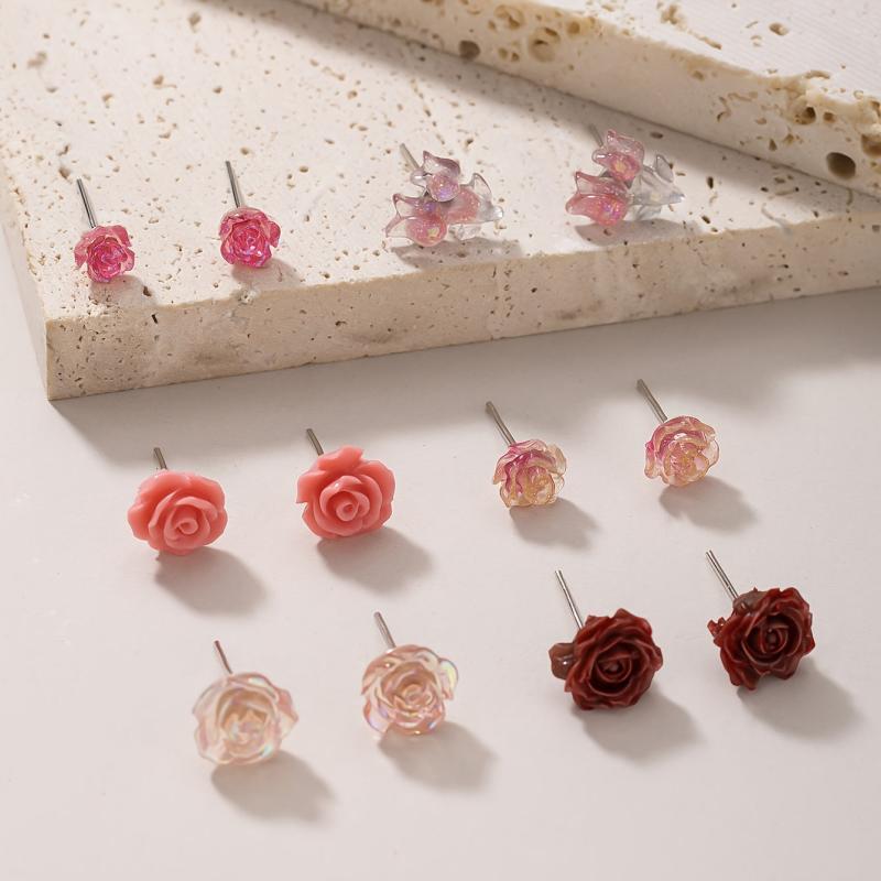 Elevate your style with this set of 6 pairs of fashionable resin flower love rose earrings. Perfect for daily wear and holiday jewelry.