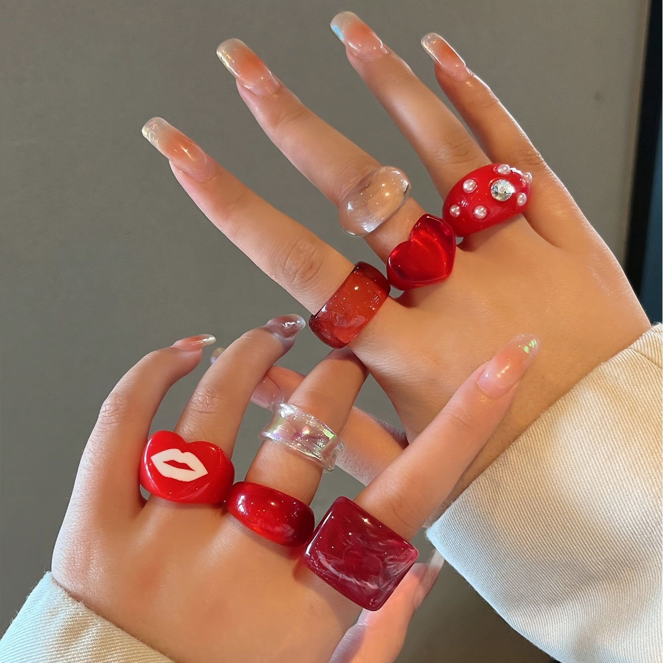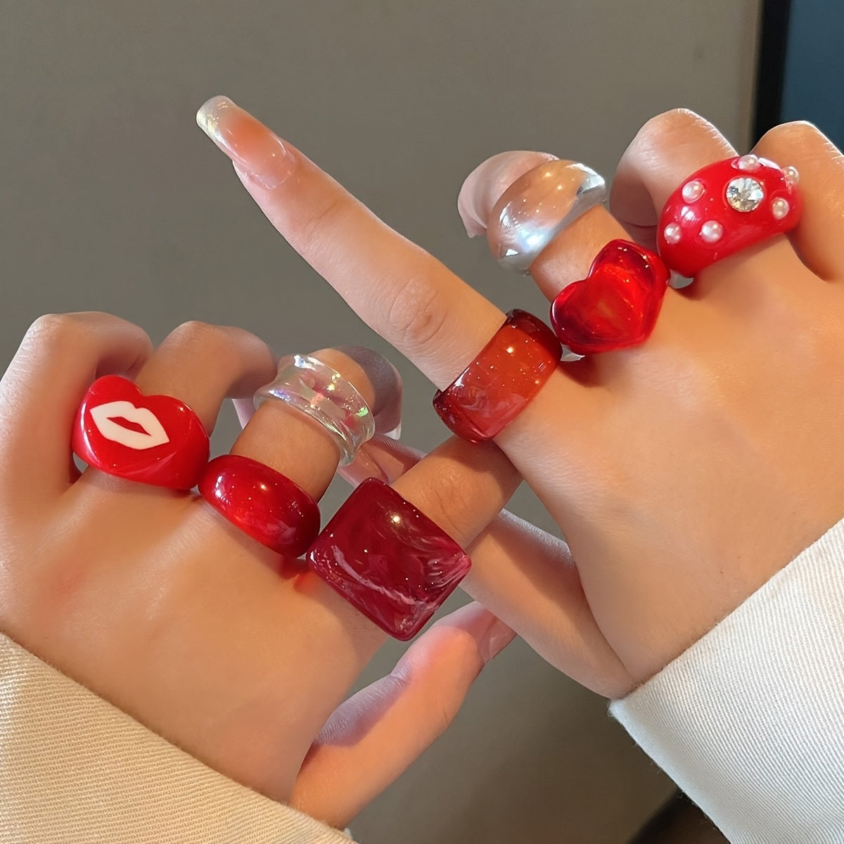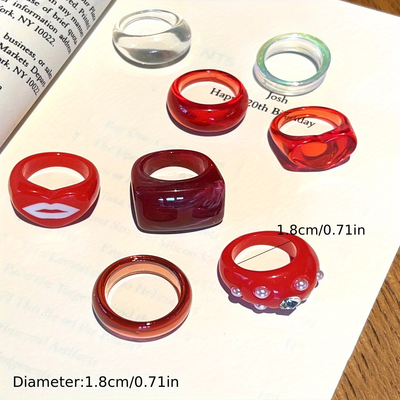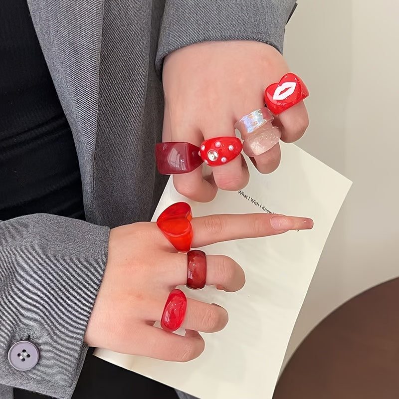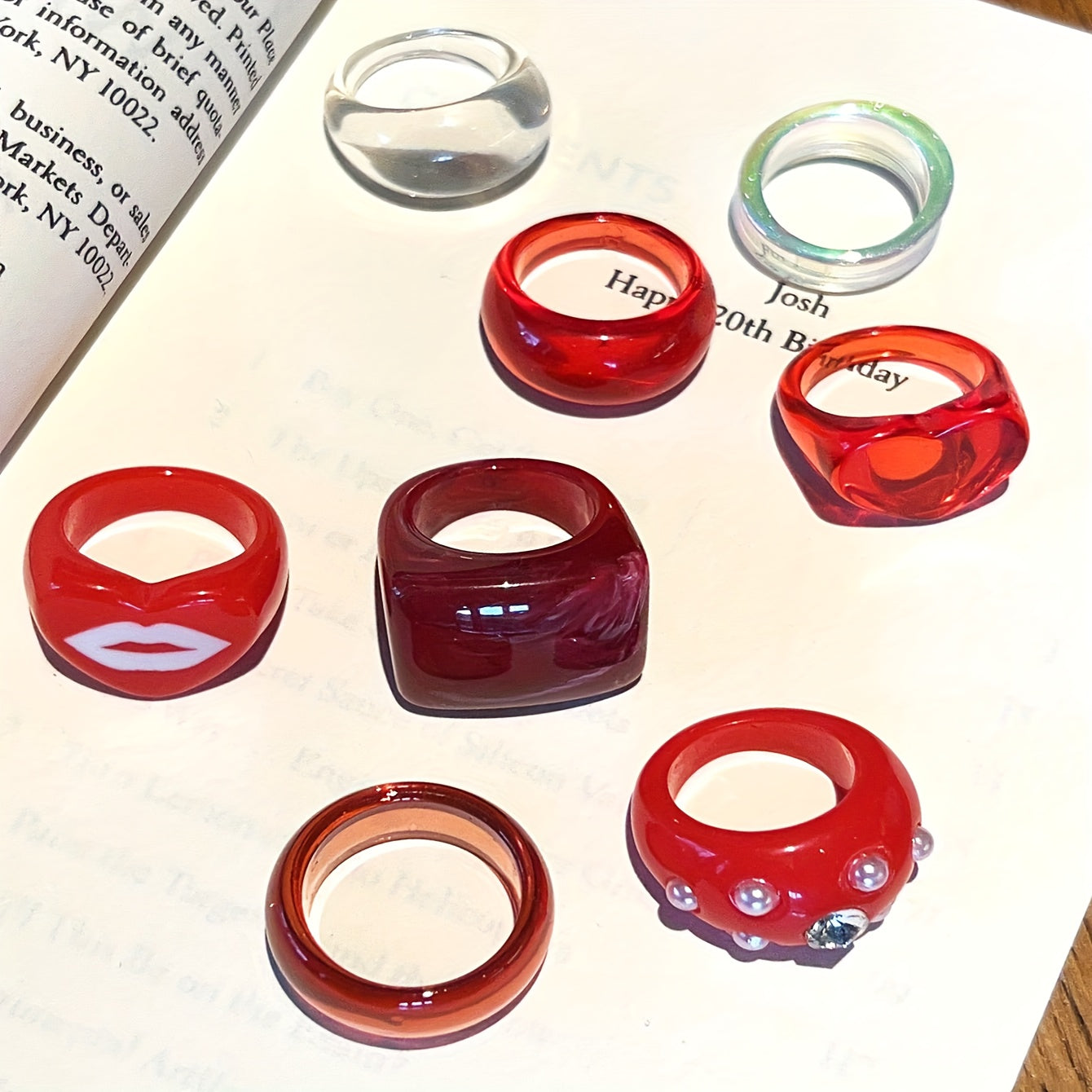 Elevate your style with this set of 8 red resin stackable rings, designed for women in large sizes. The perfect combo to express your personality and add a pop of color to your outfit.