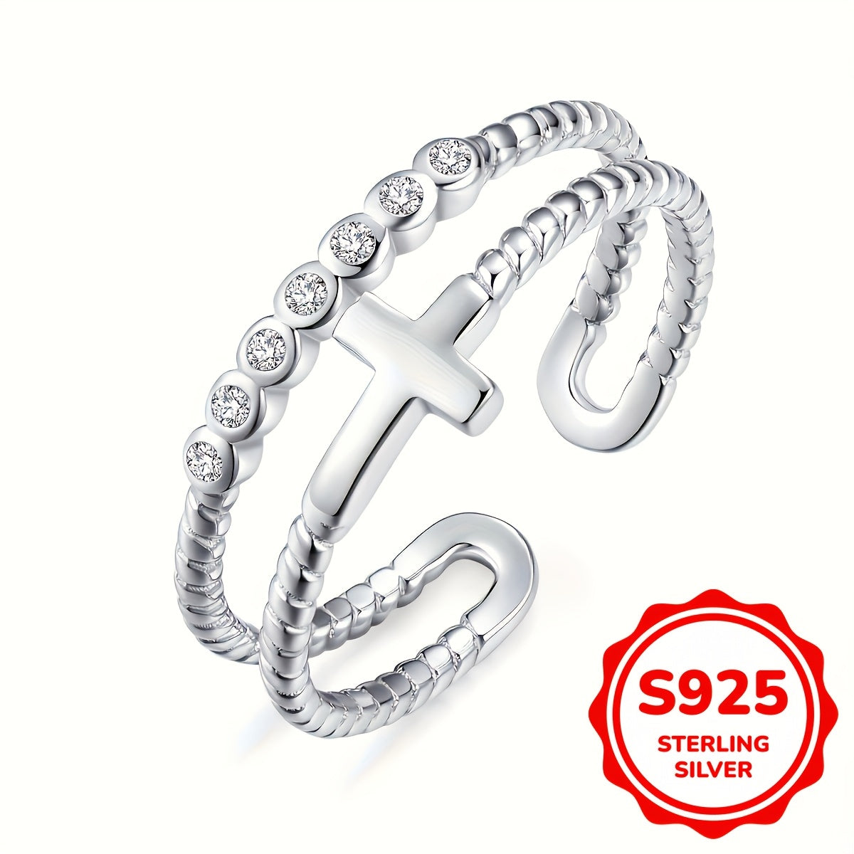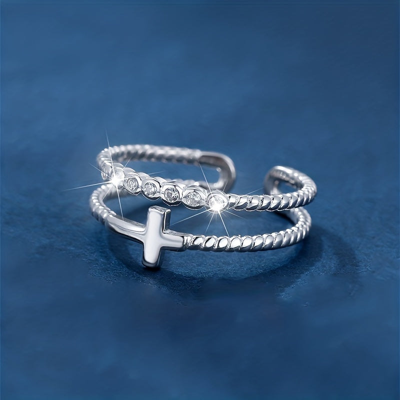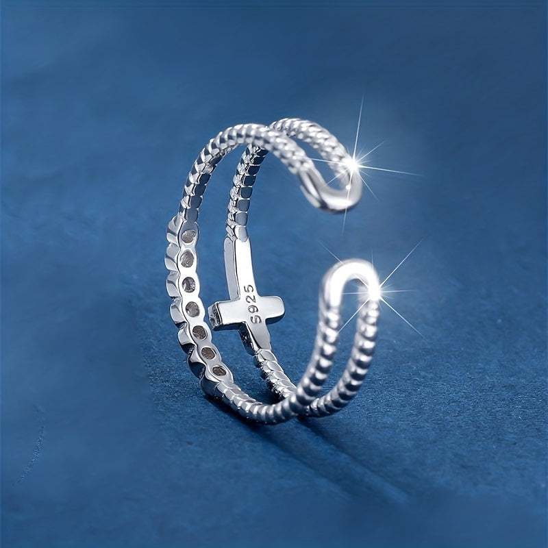 Elegant and stylish 925 sterling silver ring featuring a cross design with a double-layered open style.
