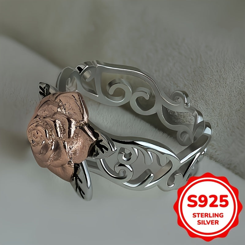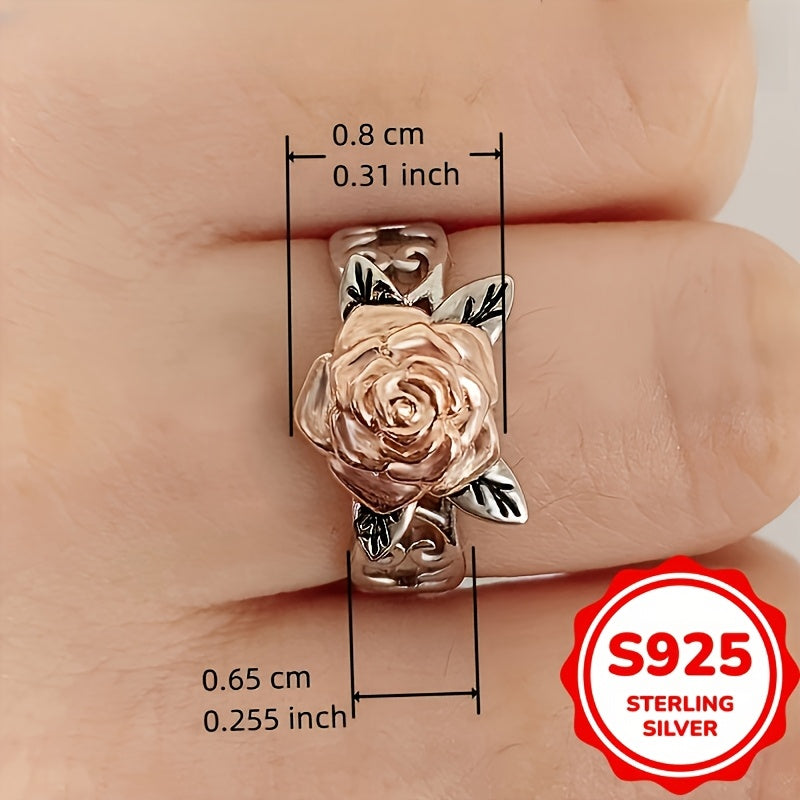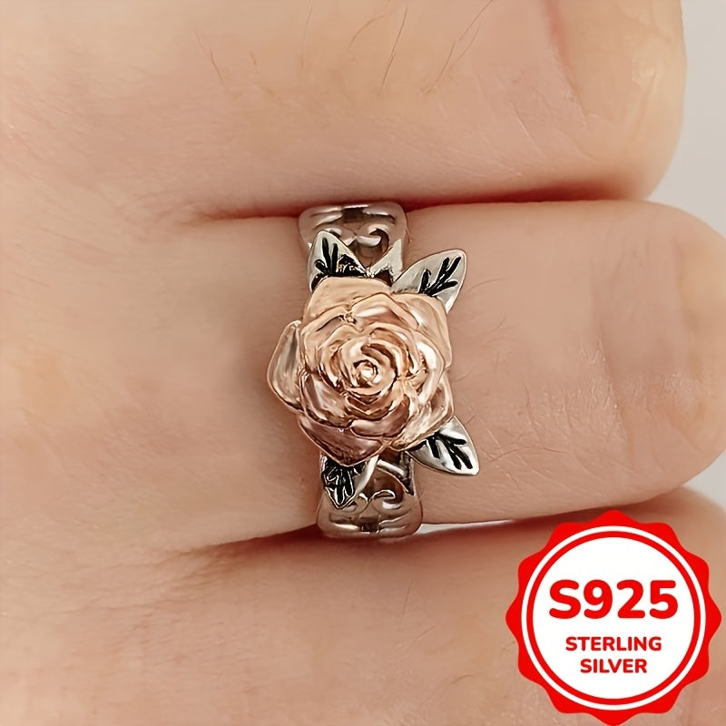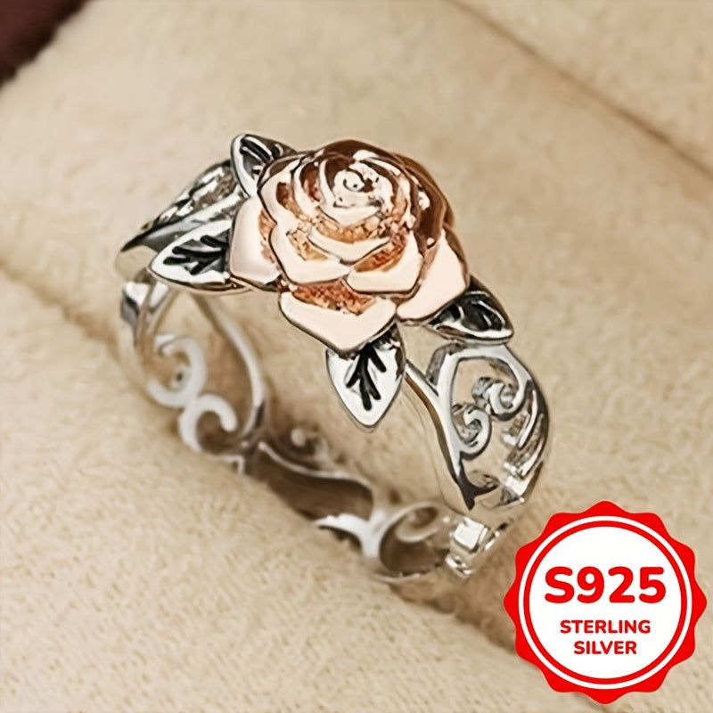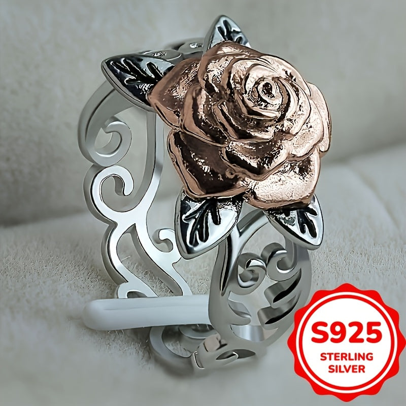Exquisite 925 sterling silver rose ring featuring intricate filigree design with a double colored rose. Ideal for proposals, engagements, weddings, and Valentine's Day.