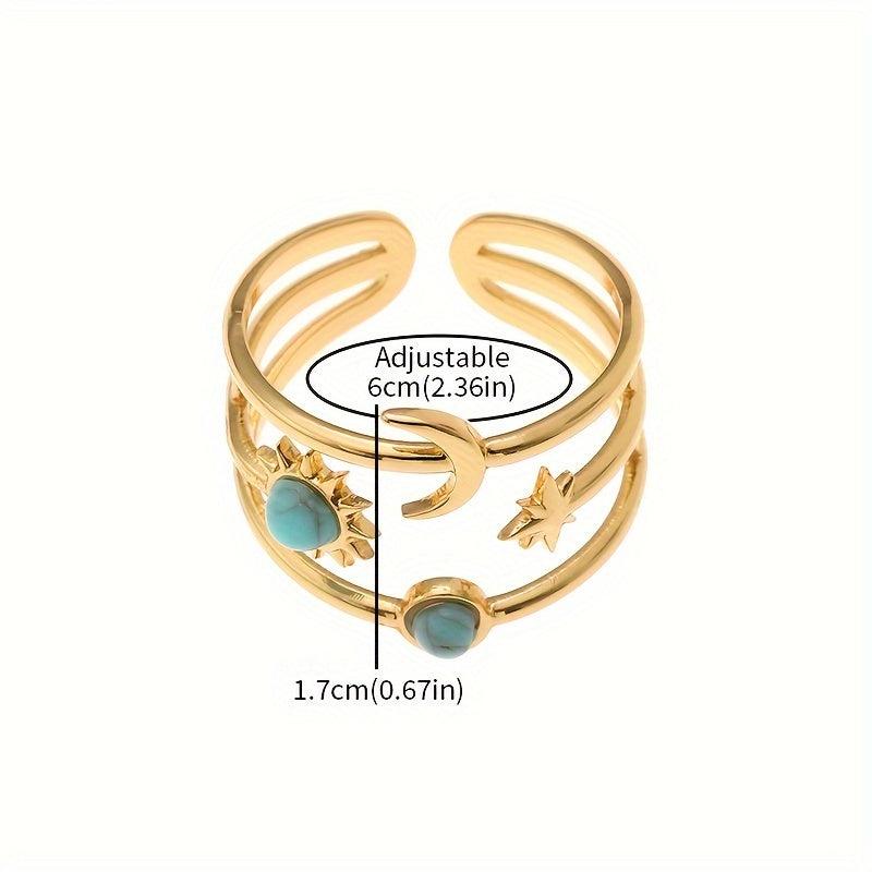 Elegant golden-toned ring featuring star, moon, and sun motifs with turquoise inlay. Perfect for casual wear, weddings, banquets, and gifting.